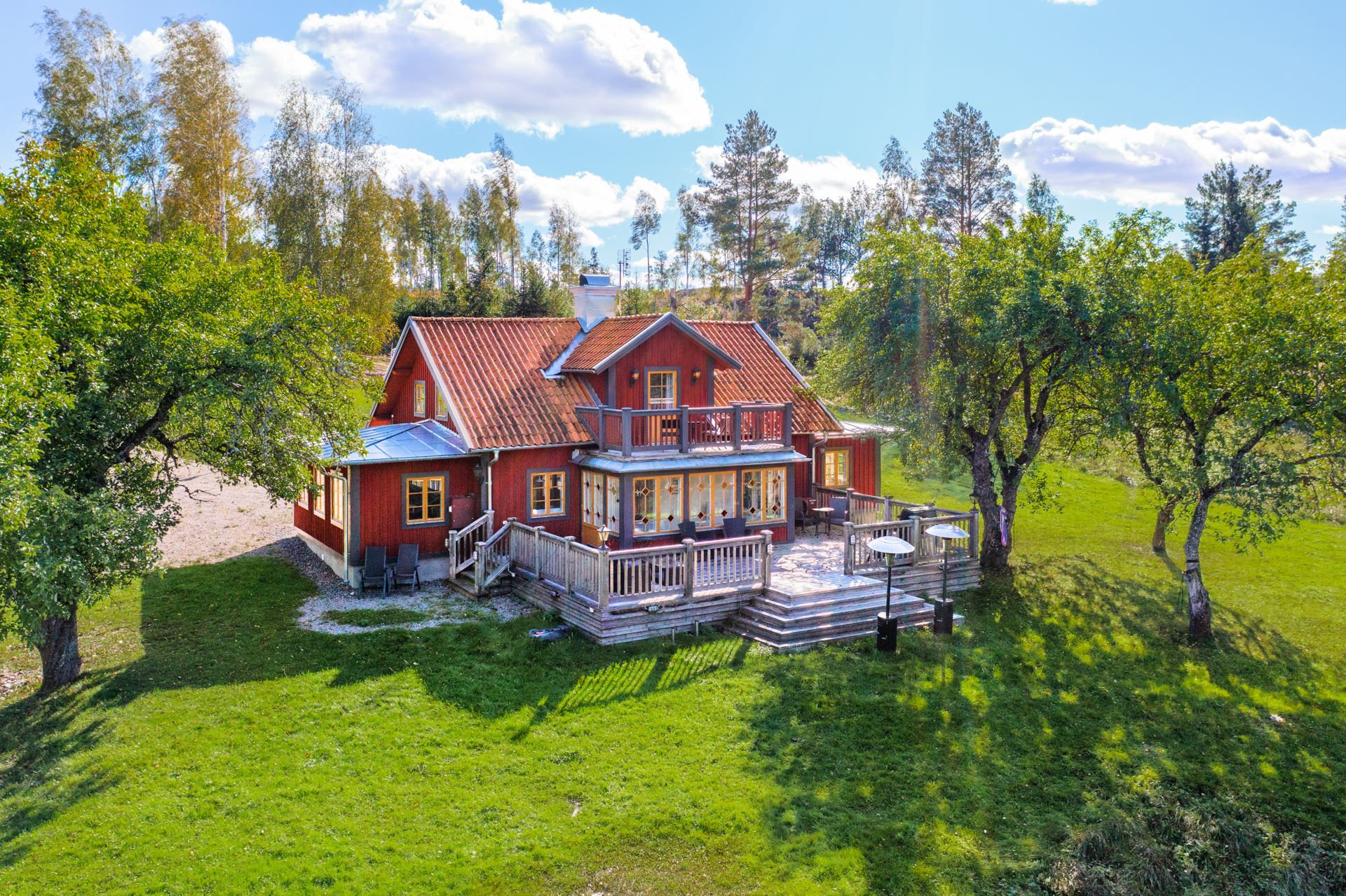 Detaljer: Från husets glasveranda tar du dig med direkt access ut till veranda med utsikt ned mot vattnet. Stora träd skuggar under varma sommardagar. Från verandan tar du dig direkt ner till husets brygga och på någon minut ror du ut i Båvens öppna vatten.