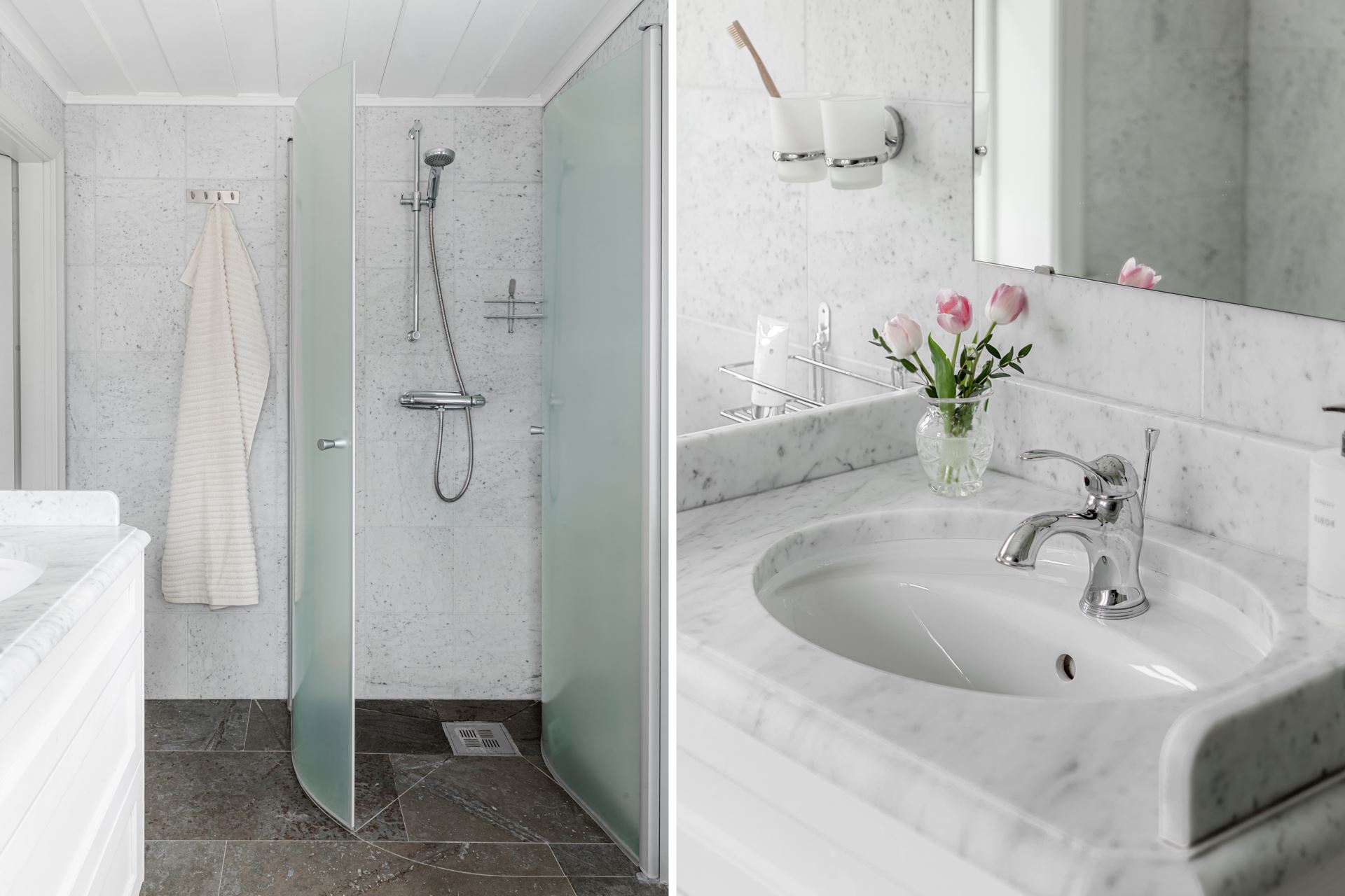 Inredning: Bred kommod med marmorskiva med kran och detaljer i rostfritt. Stor spegel. Frostade duschväggar i glas.