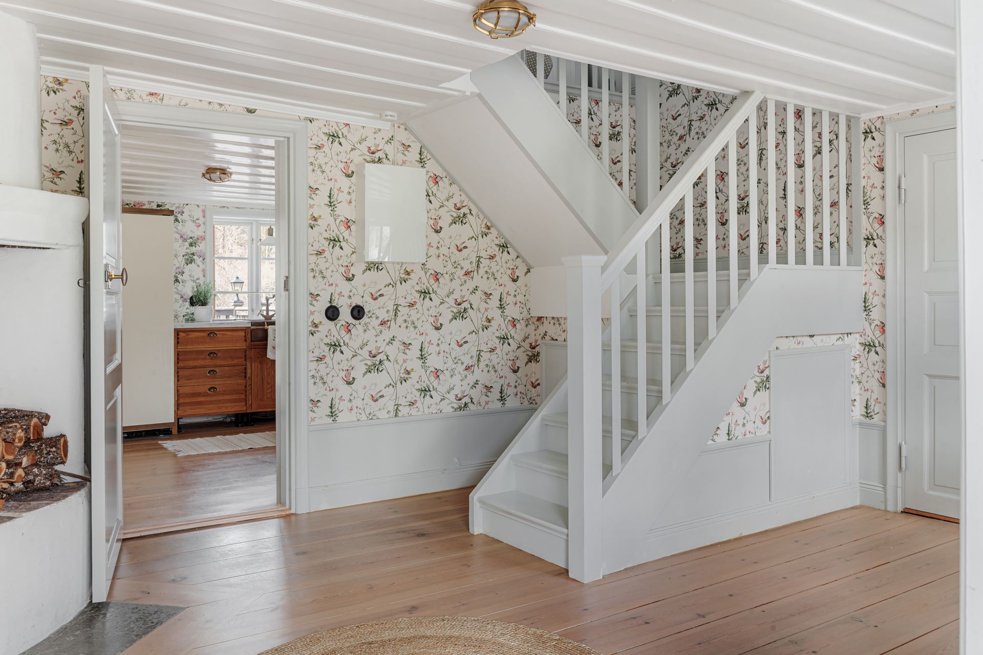 Väggar: Höga målade socklar med blommönstrad tapet (följer i samma mönster som i hallen på nedervåning och i trapphus).