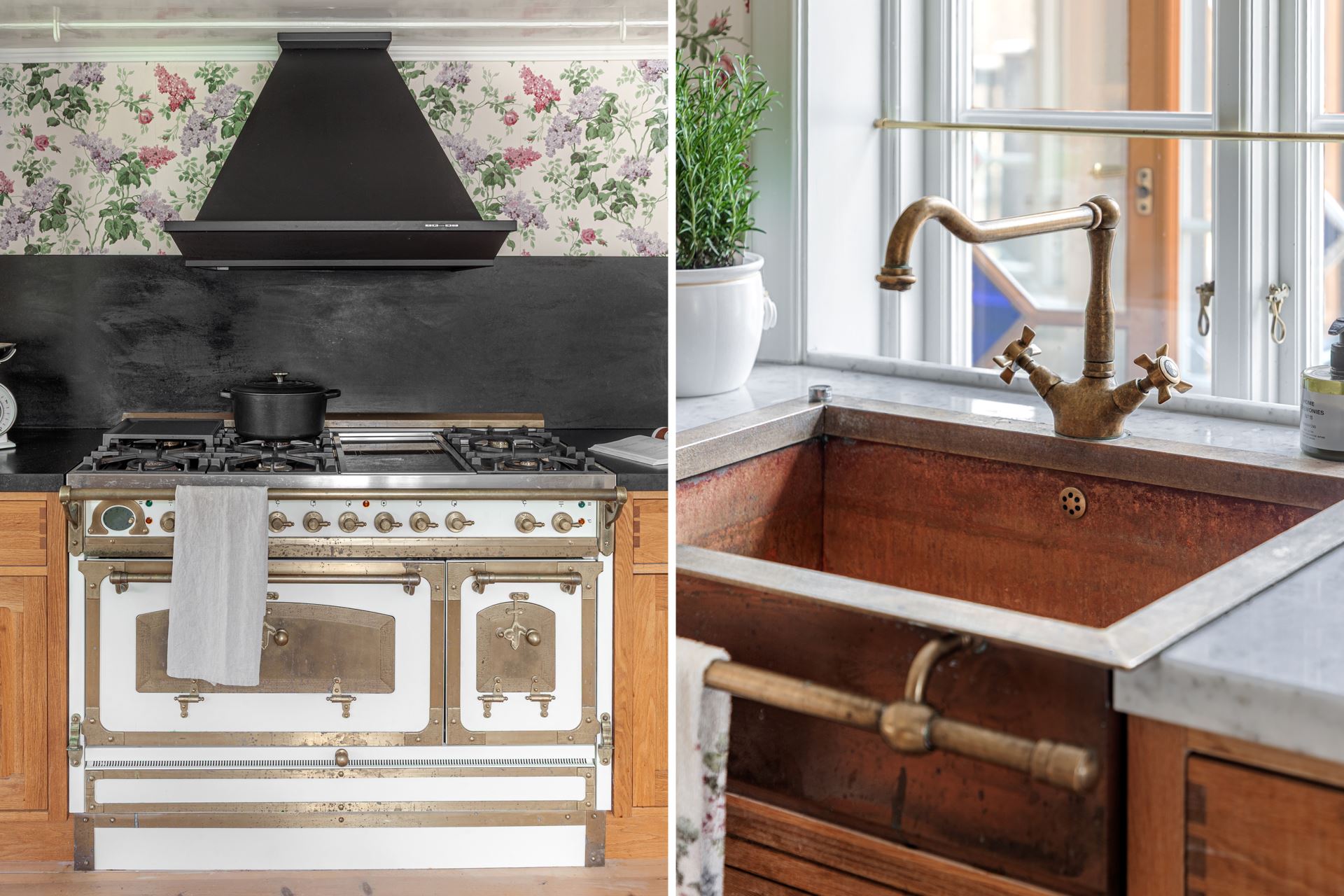 Inredning: Platsbyggt massivt ekkök. Italiensk kyl/frys i cremévitt med mässigsbeslag och is/vattendispenser. Bred Italiensk creméfärgad spis med både gas och induktion och fina mässingsbeslag. Avställningsyta och stänkskydd i svart sten bredvid spisen. Svart fläktkåpa. Bänkskiva i ljus hög marmor med ho i hamrad koppar, mässingsbeslag och mässingskran. Integrerad diskmaskin.