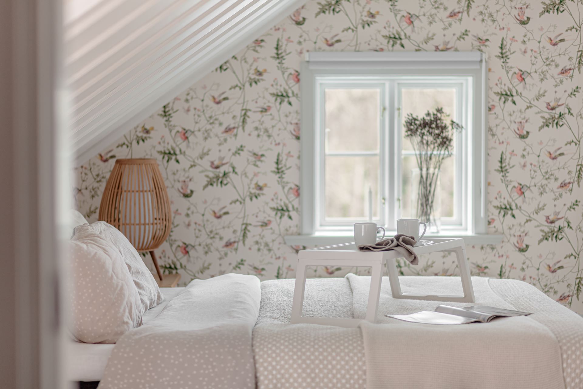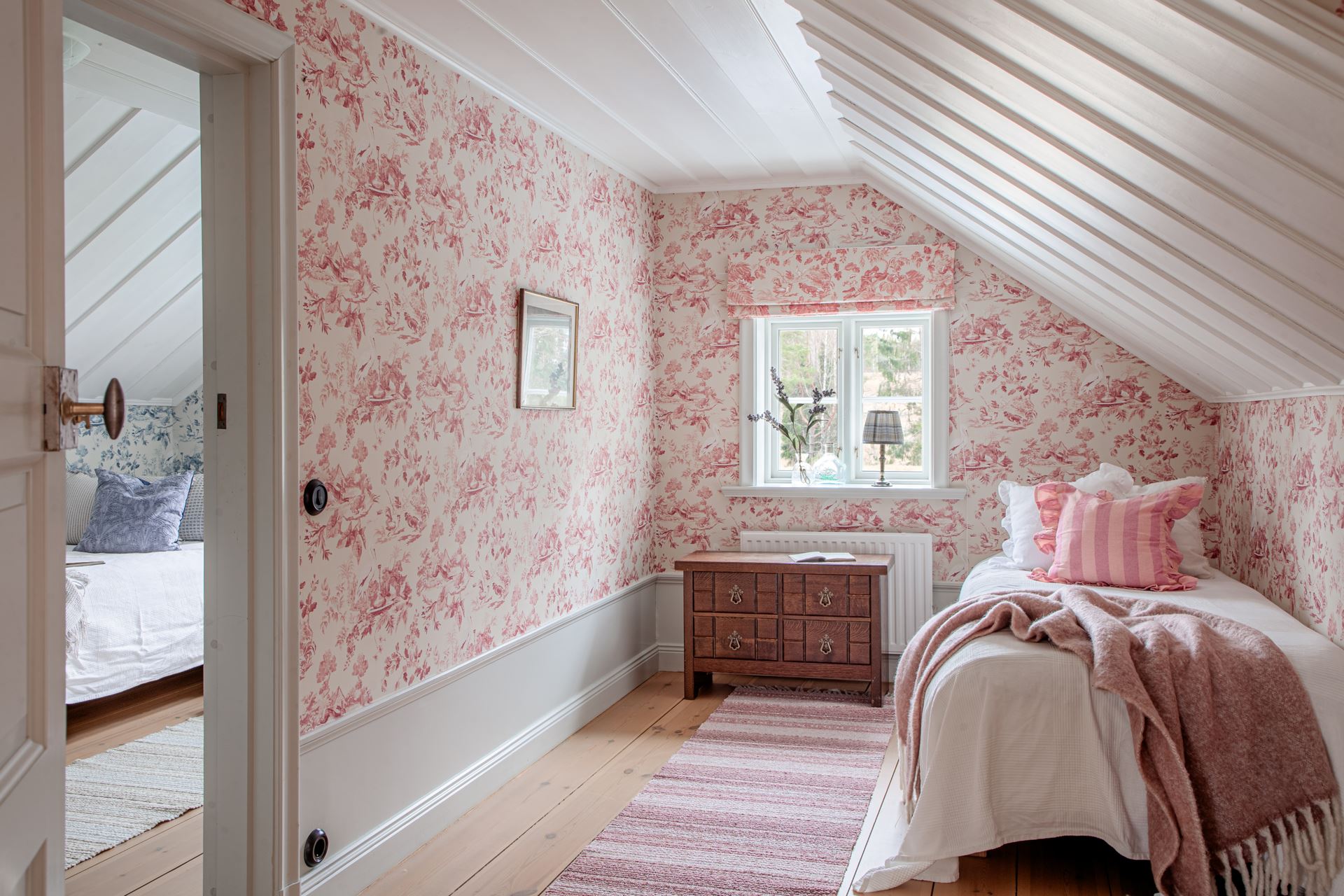 Detaljer: Snedtak som ger en mysig och ombonad känsla. Rummet blir ett genomgångsrum till det 'blå' sovrummet.
