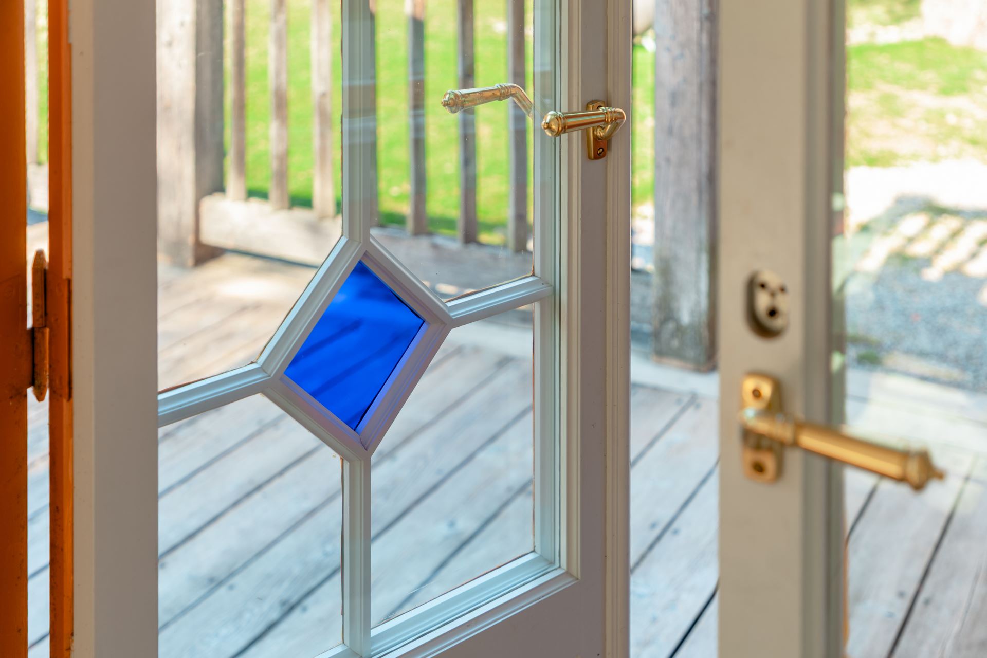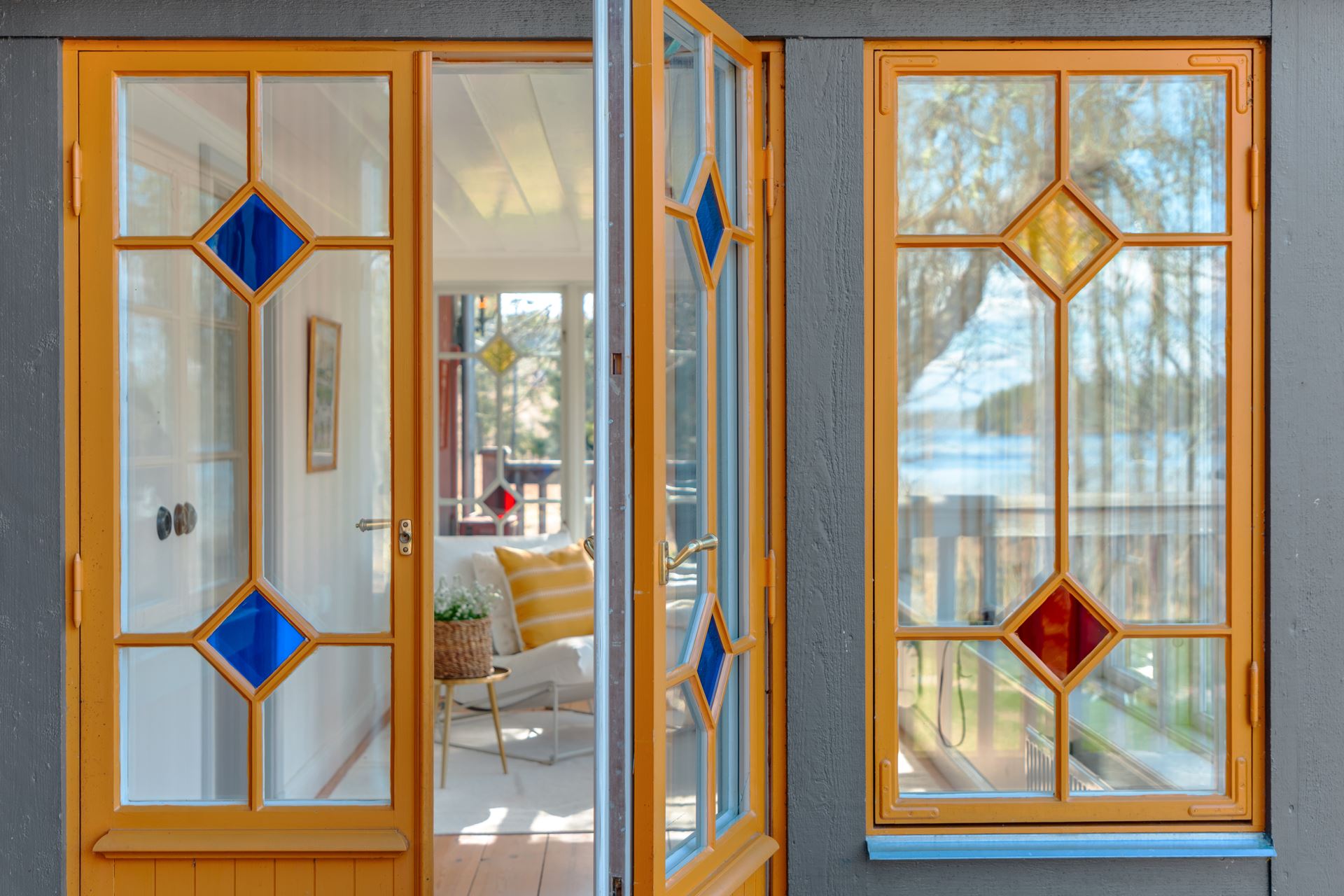 Väggar: Generösa spröjsade glaspartier med handblåst glas. Detaljer med färgat handblåst glas, fönsterbeslag i mässing.