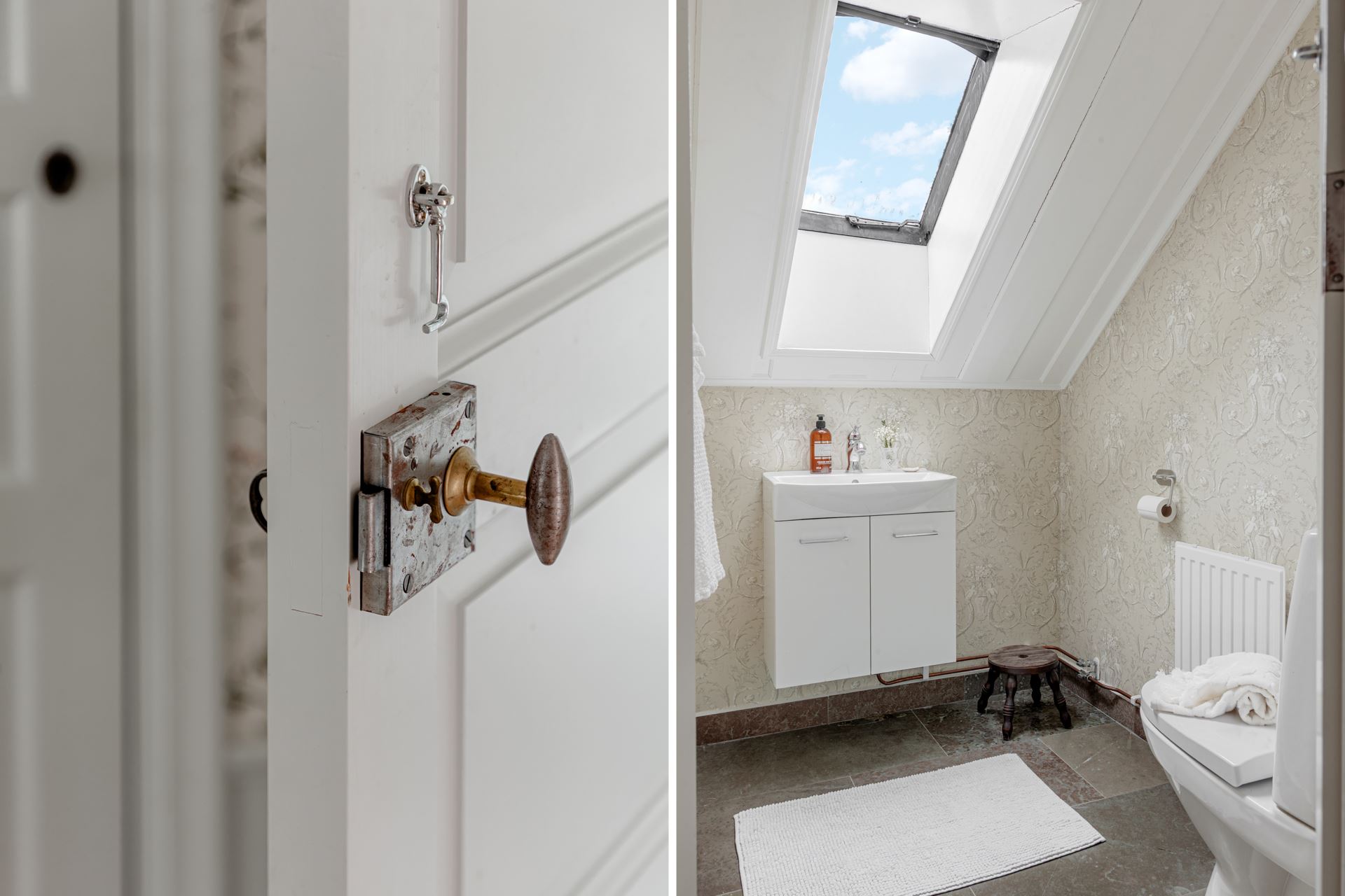 Detaljer: Snedtak. Till rummet tar man sig via det 'rosa' rummet.