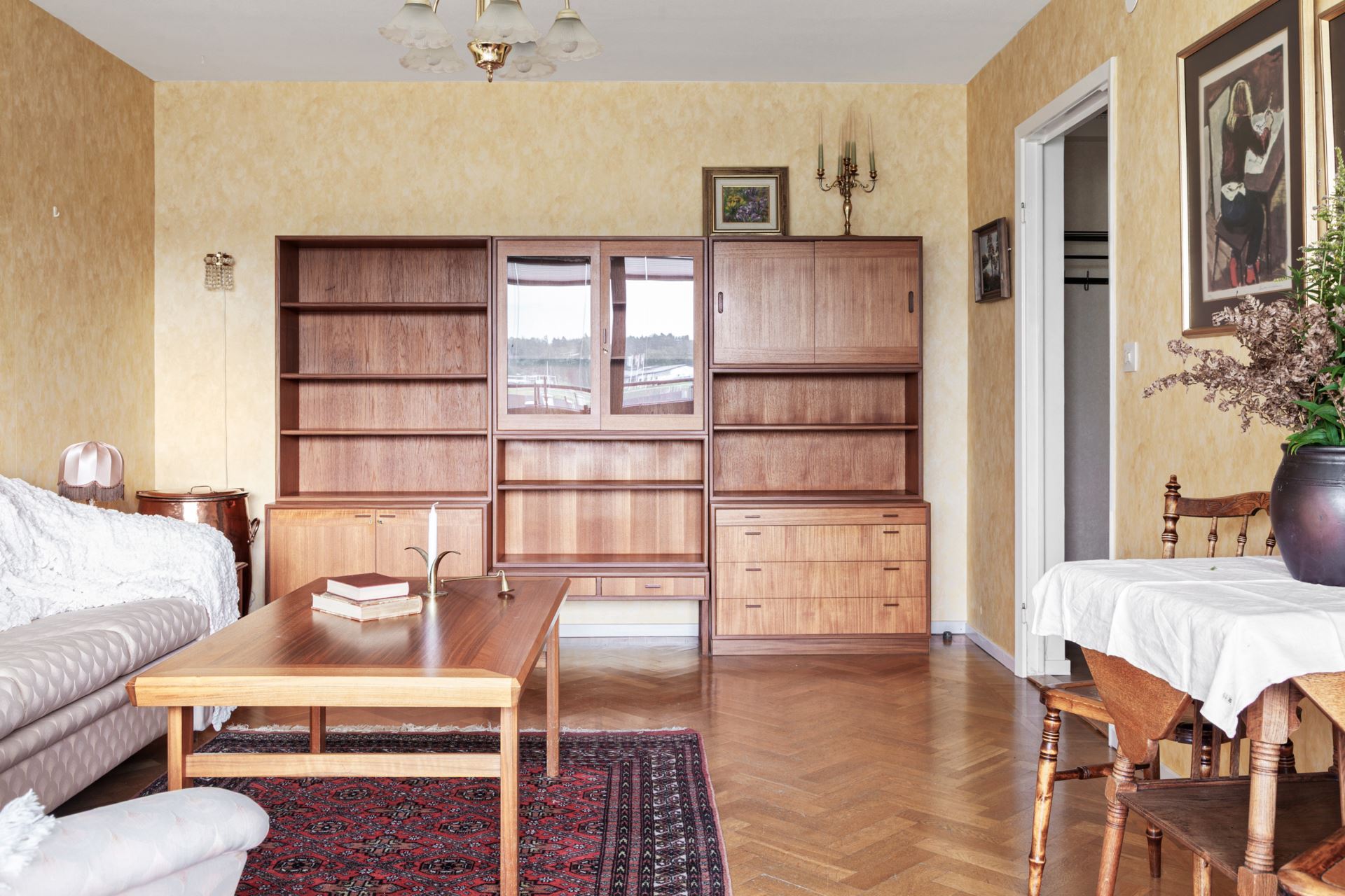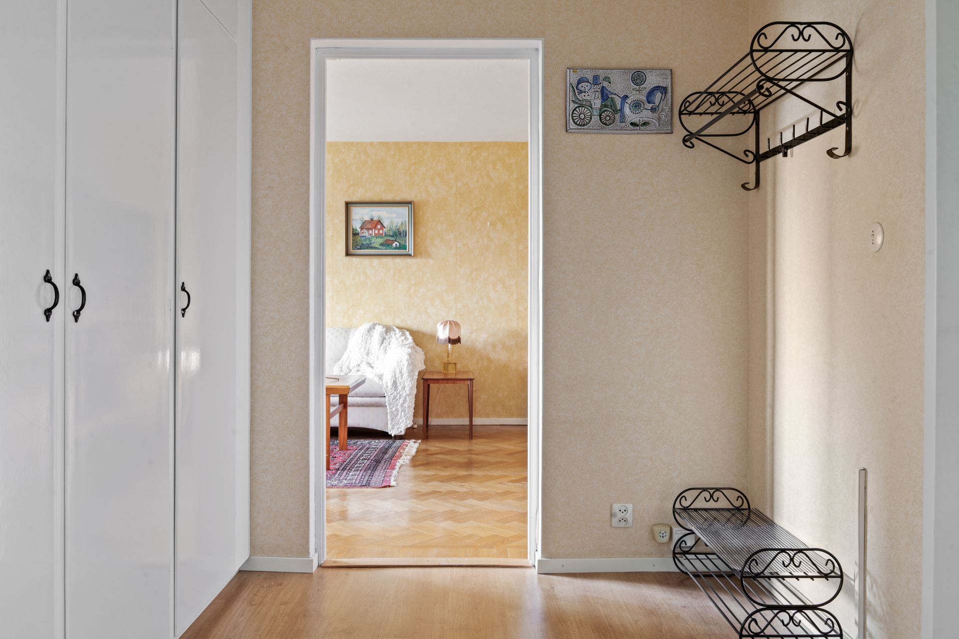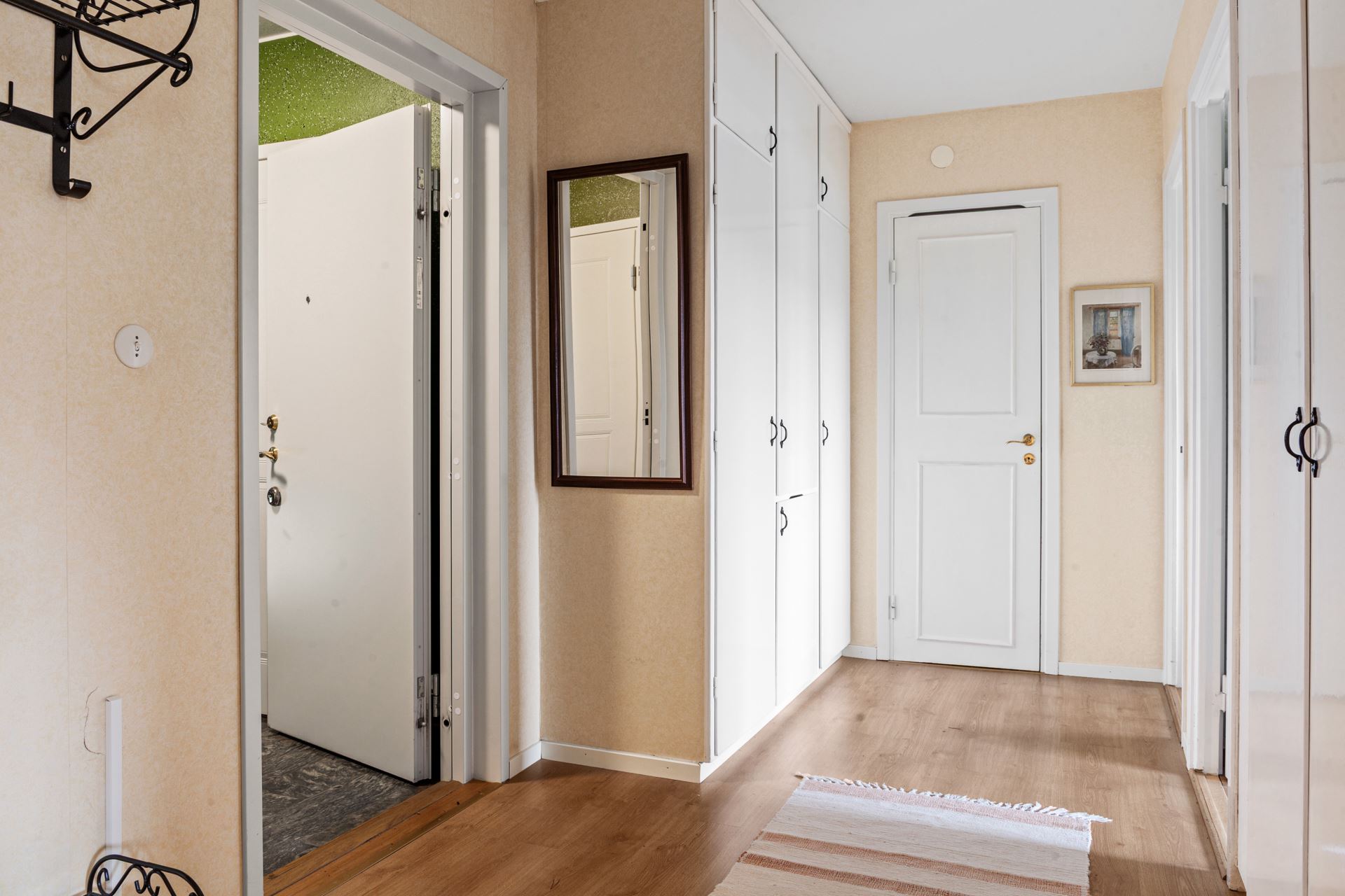 Bostaden bjuder på generösa ljusinsläpp, vacker fiskbensparkett, ett rymligt kök med matplats, mycket förvaring i skåp och skafferi samt rostfri diskbänk. Det helkaklade badrummet ger ett fräscht intryck och den stora hallen erbjuder fem platsbyggda garderober som ger gott om förvaringsmöjligheter. Till lägenheten hör även förråd och matkällare.