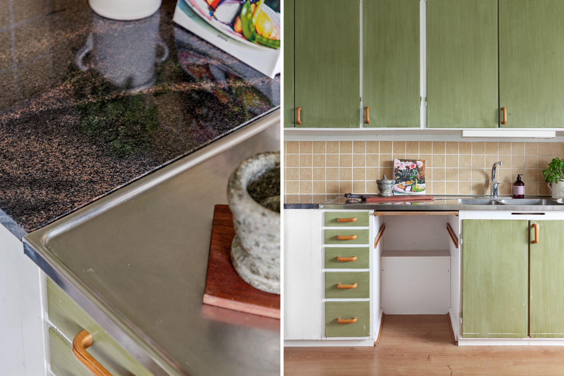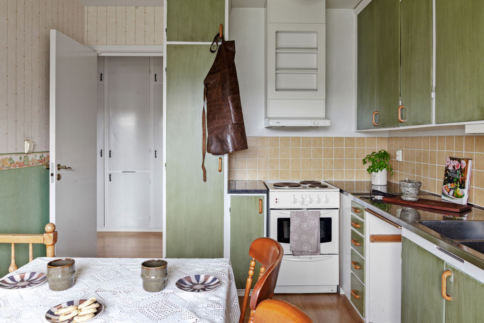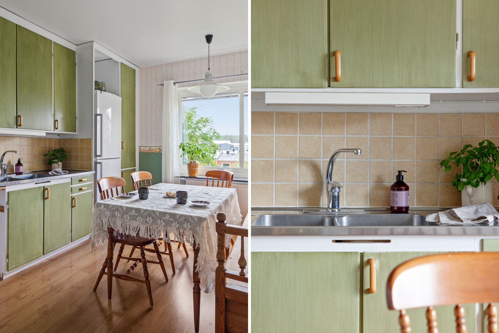 Övrigt: Äldre kök med gröna luckor. Spis/ugn och kyl/frys av nyare modell. Fläkt