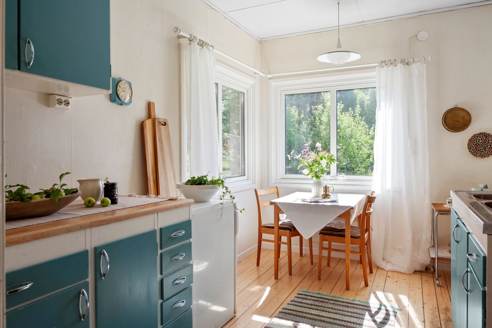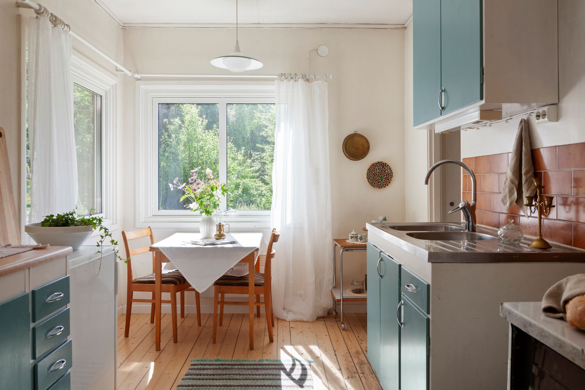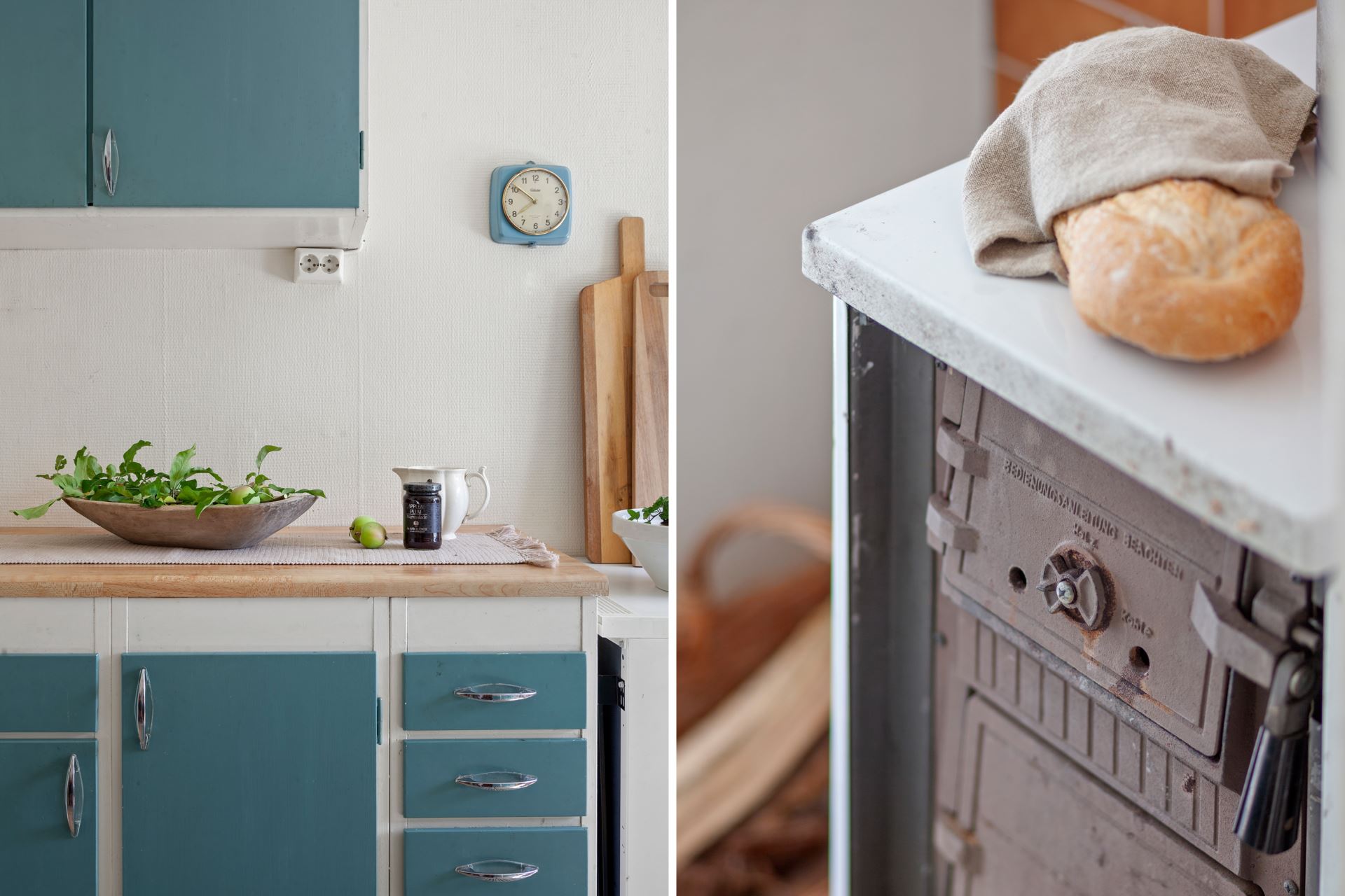 Inredning: Originalkök med målade snickerier i ljusblått med silvriga handtag, bänkskiva i ljus laminat, diskho, vedspis, kylskåp från Whirlpool.