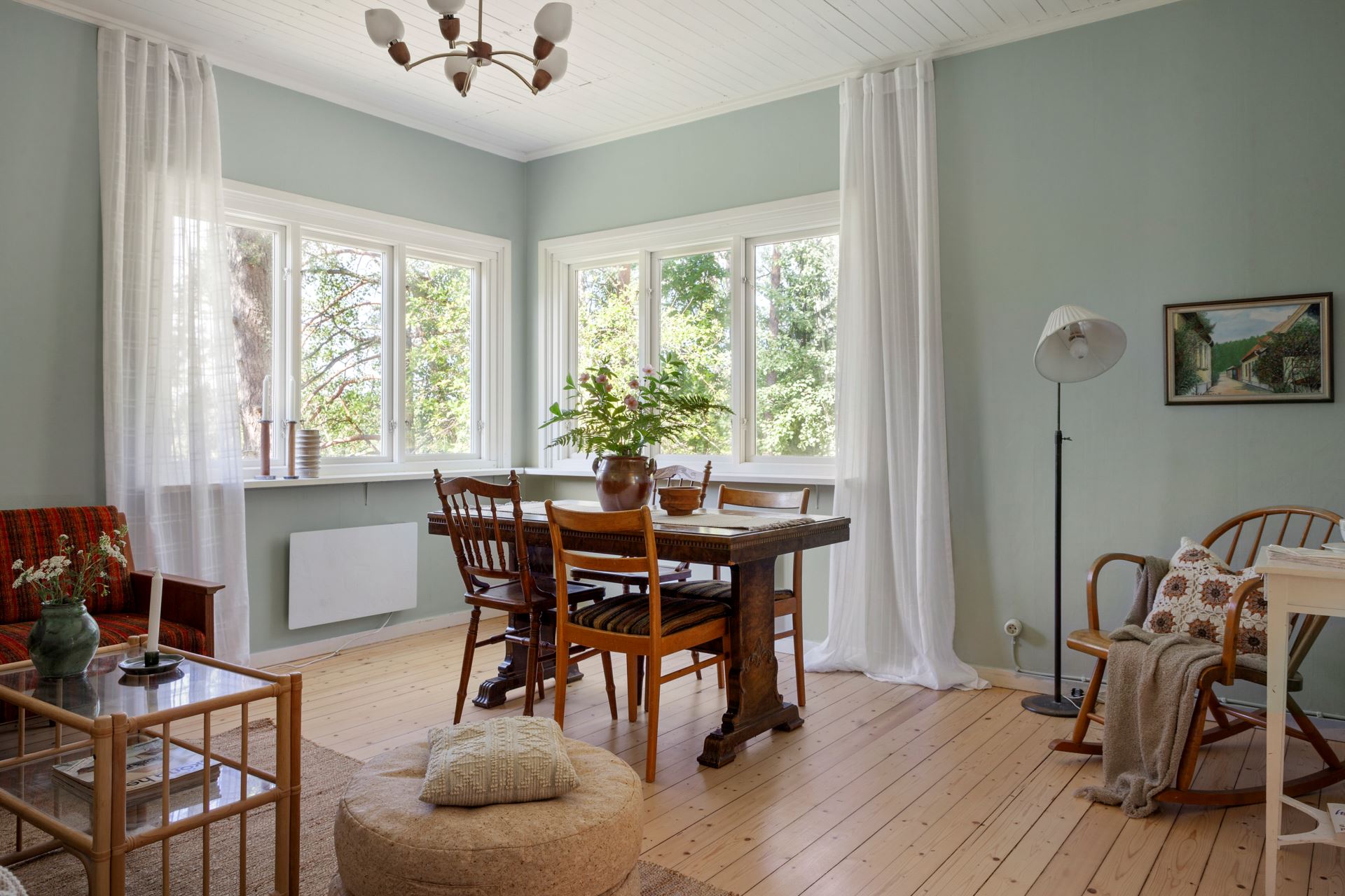 Övrigt: Stort fönsterparti i två väderstreck. Här finns gott om utrymme för såväl soffgrupp och matplats.