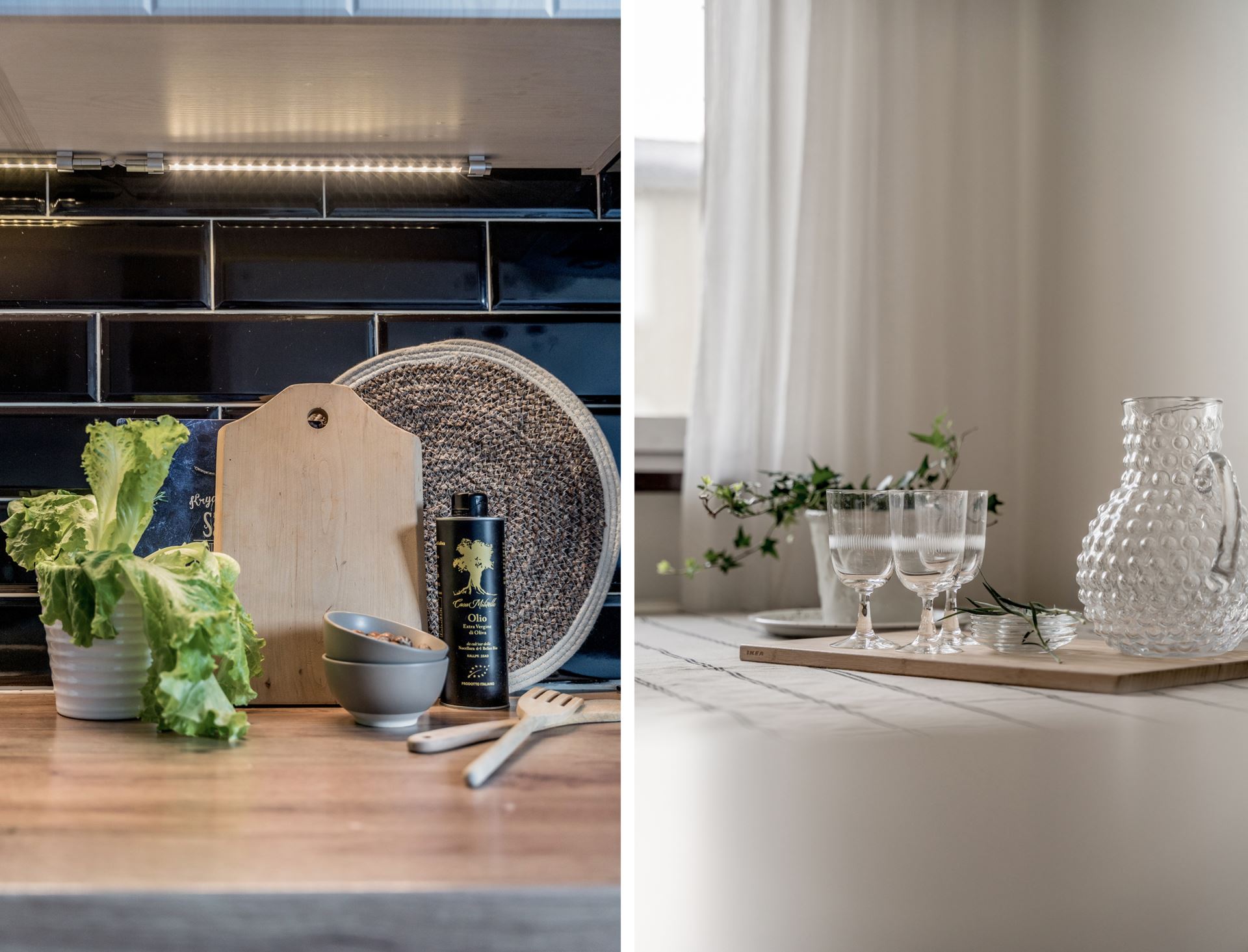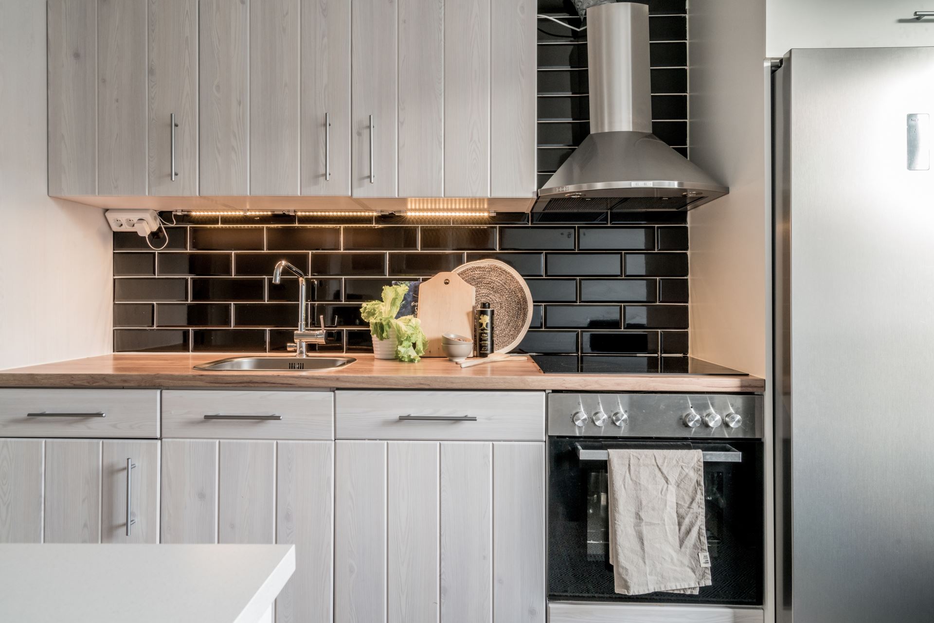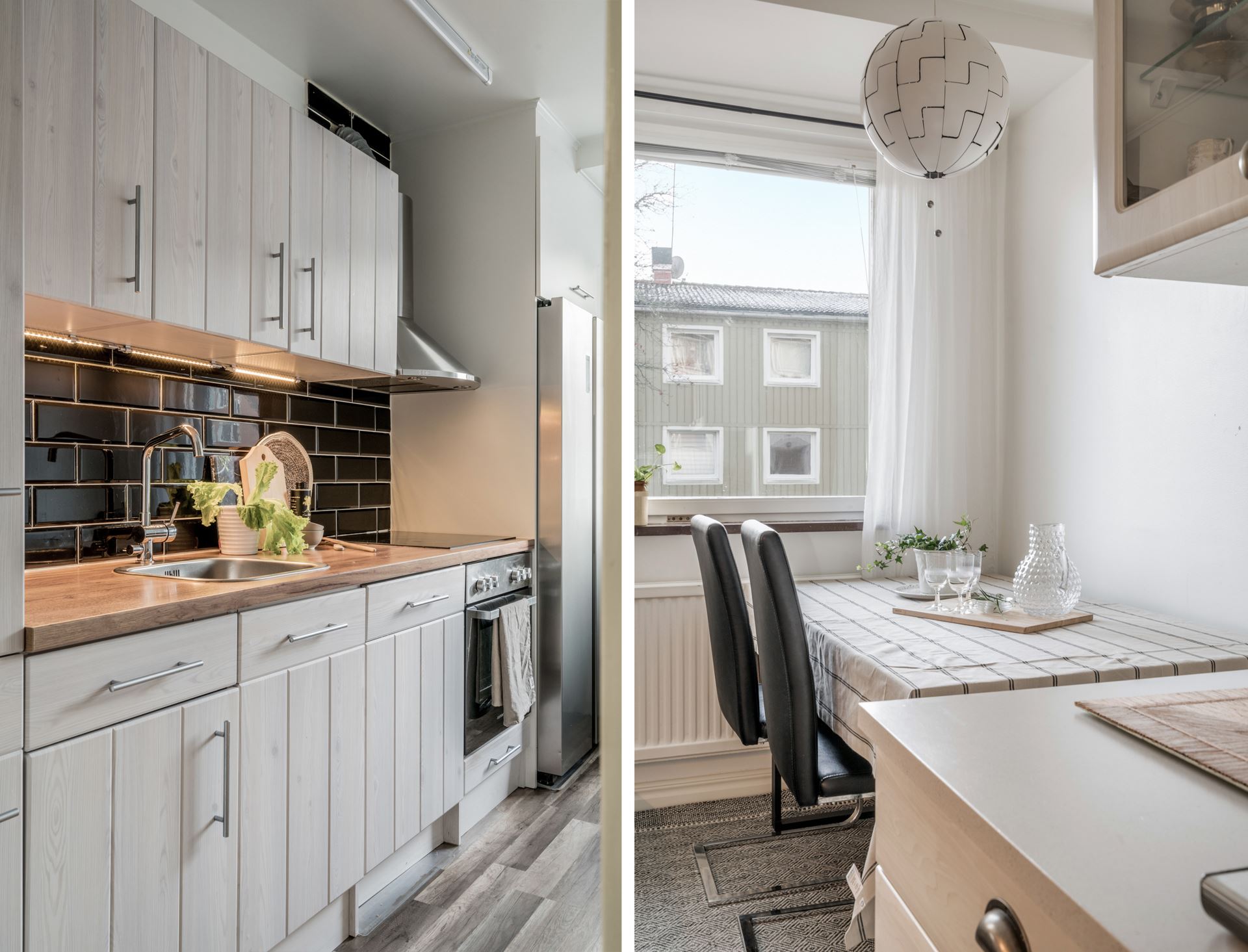 Övrigt:Ljust grå/vita snickerier från Bauhaus, köksbänk i trälaminat, svart kakel. Diskmaskin Respekta 2023, spishäll Respekta 2023, Rostfri fläkt Franke 2023, ugn Respekta 2023, Hel frys och kyl med vattendispenser Hisense 2023