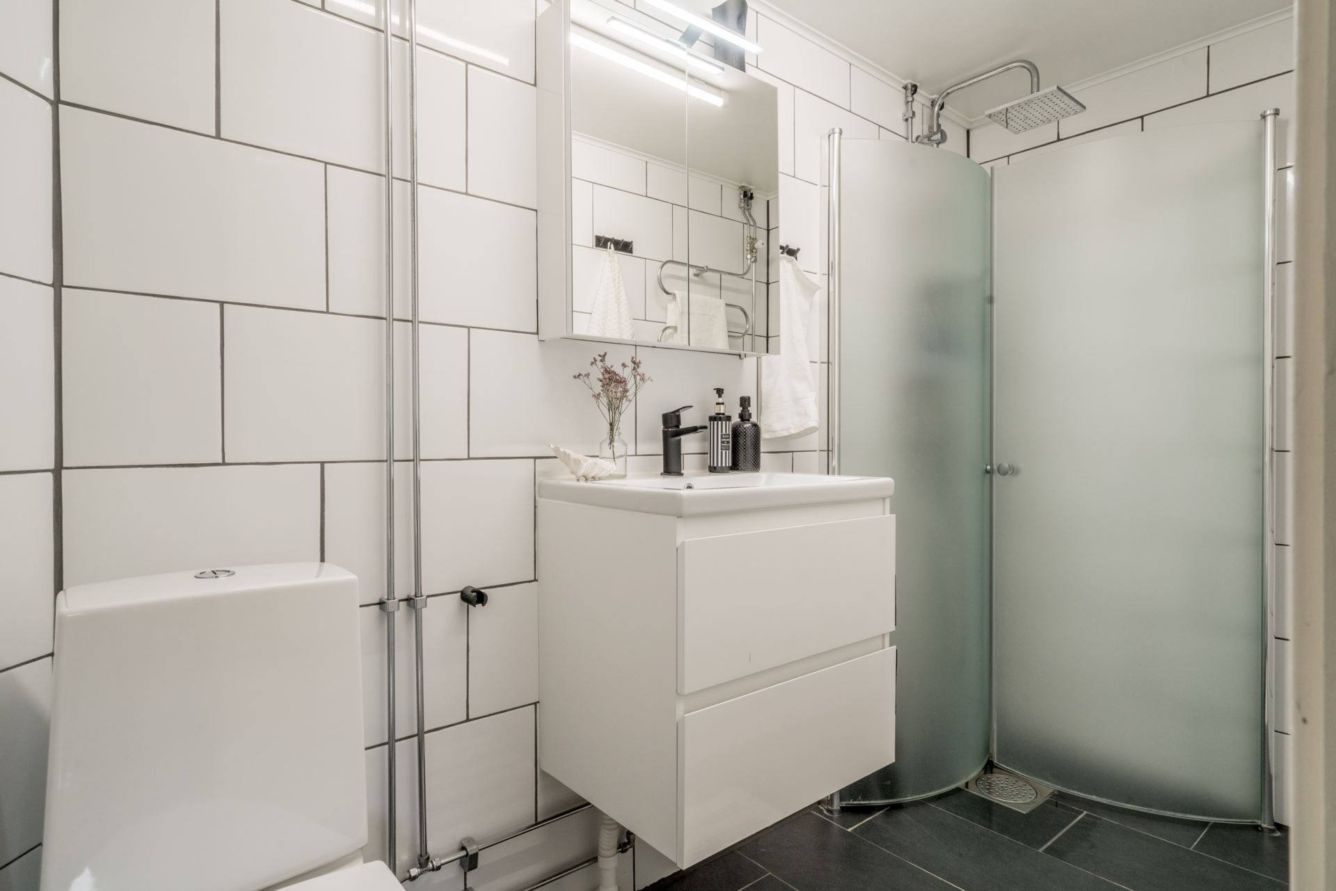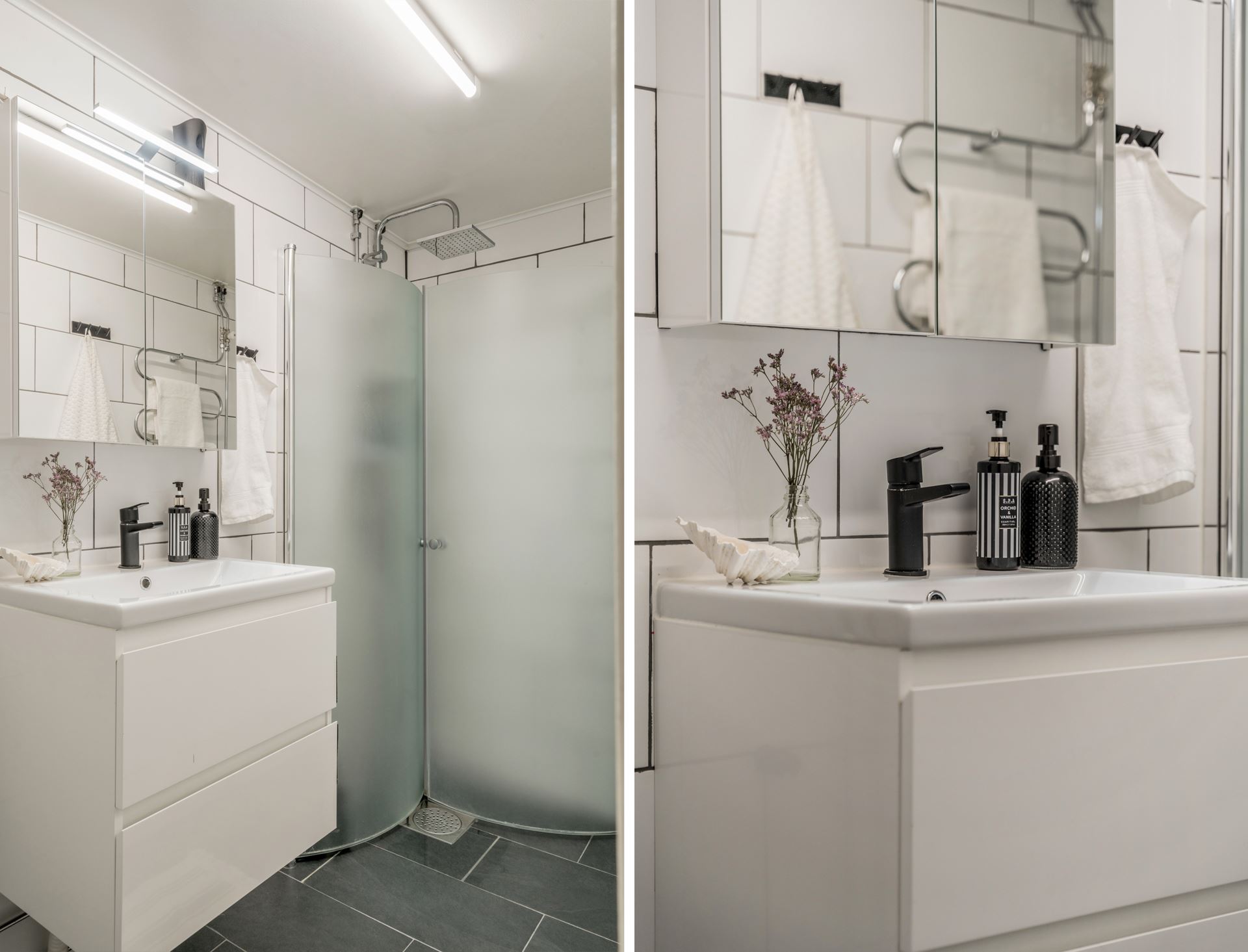 Övrigt: Duschhörn med glasväggar, handdukstork, vit kommod med handfat och spegelskåp, WC. Allt nytt 2023.