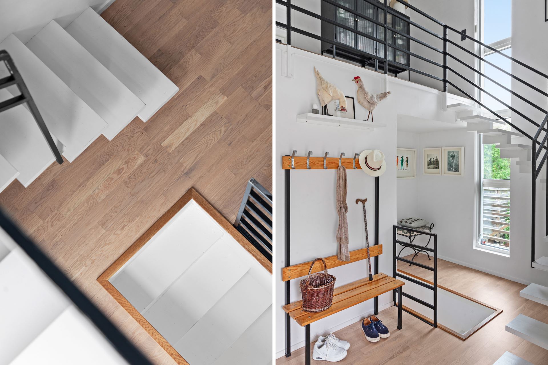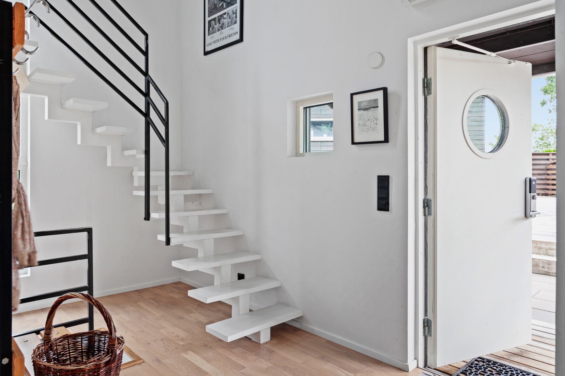 Huset är ljust och luftigt med vitmålade väggar, stora fönsterpartier, generös takhöjd och vackra parkettgolv. Inbyggda spotlights ger en modern känsla i hela huset.