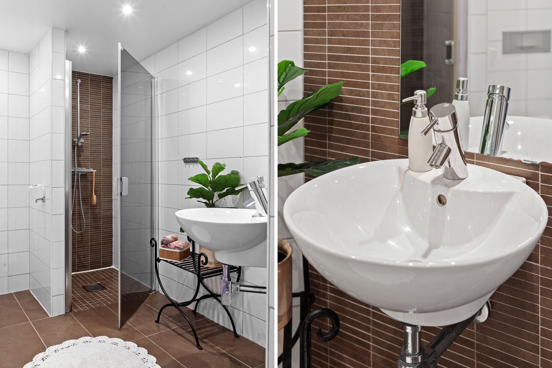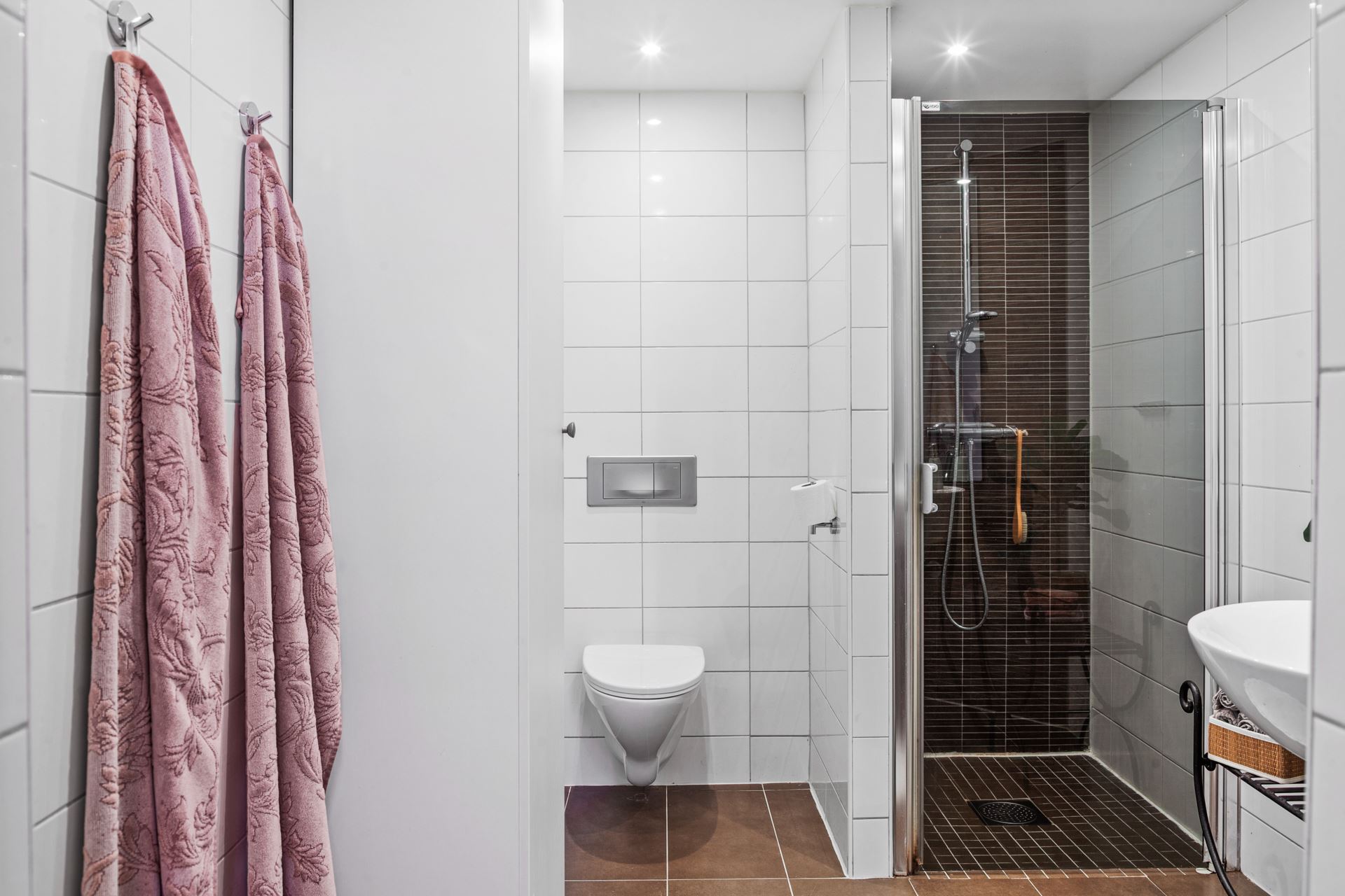 Övrigt: Inbyggd duschhörna med glasdörr, handfat, vägghängd toalett