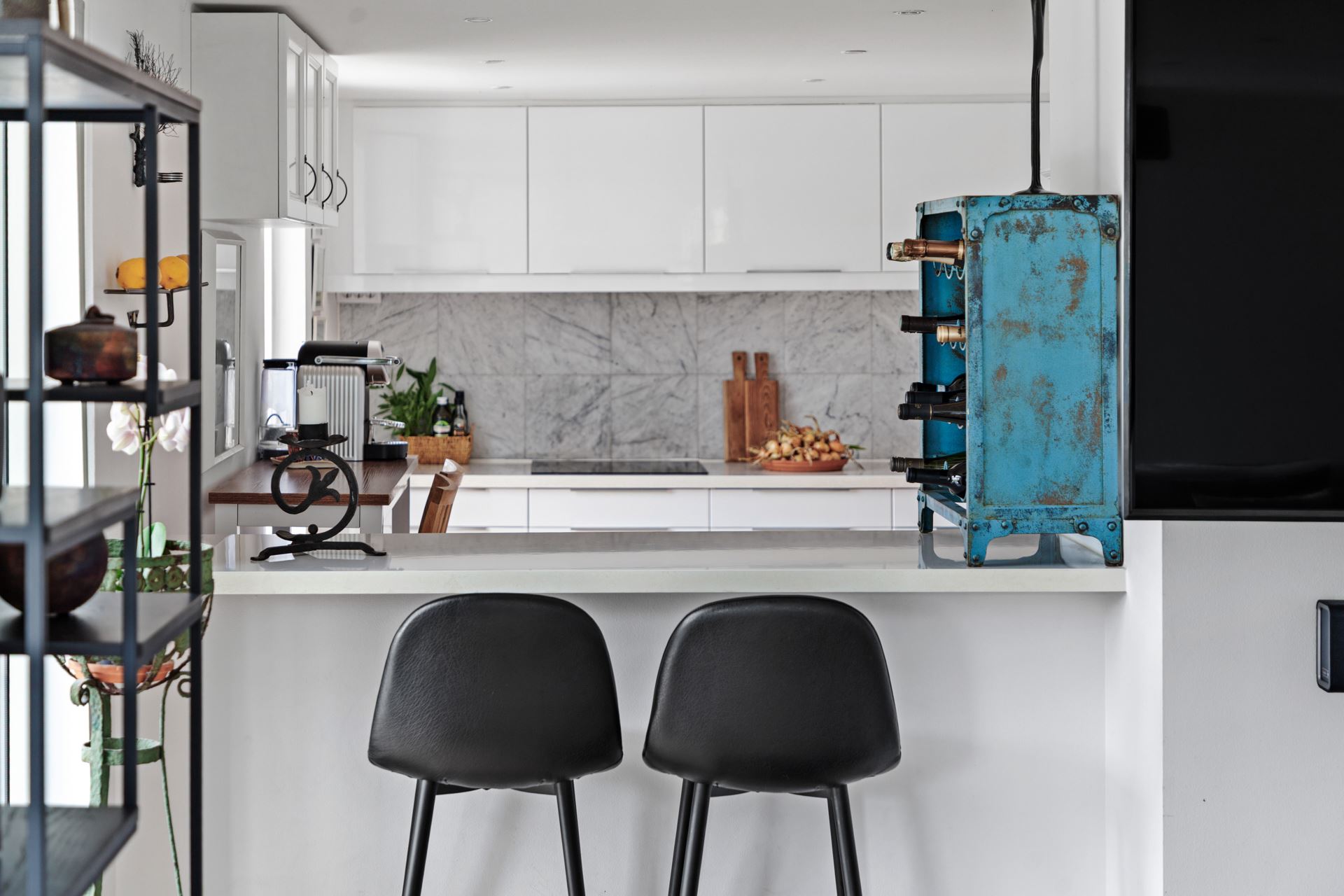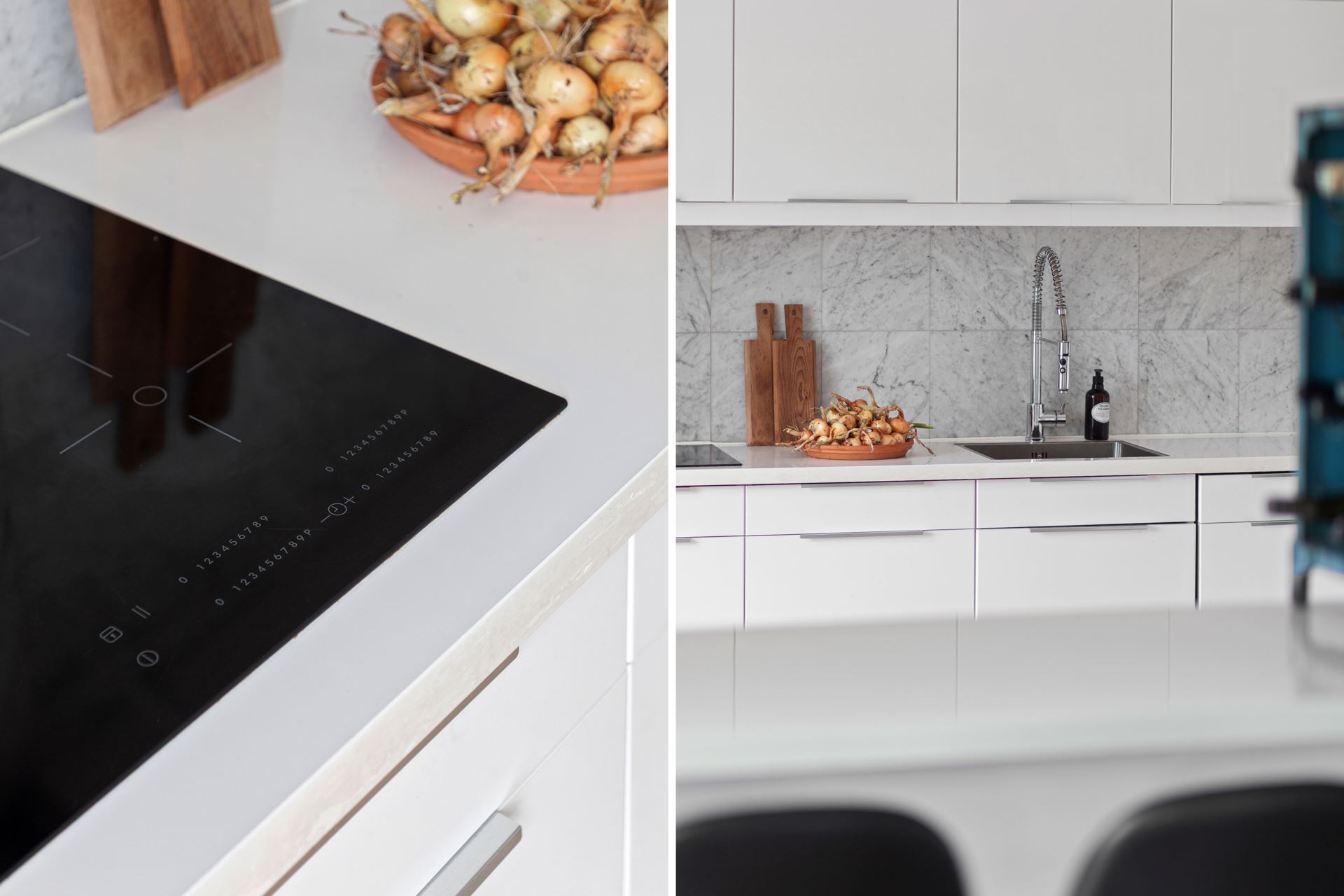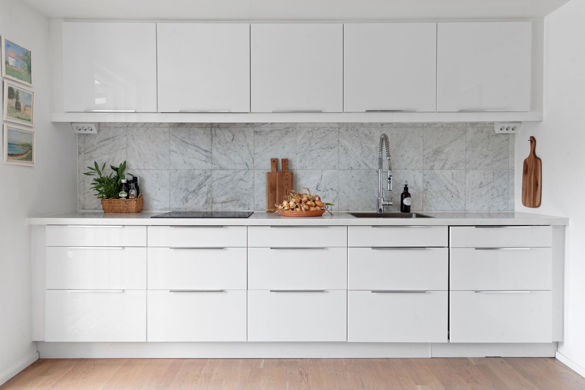 Övrigt: Blanka vita skåpsluckor, ljus laminatbänkskiva, marmorkakel bardel mot vardagsrum integrerad ugn IKEA, integrerad micro IKEA, diskmaskin Grundig, kyl/frys LG, induktionshäll, fläkt infällda spotlights