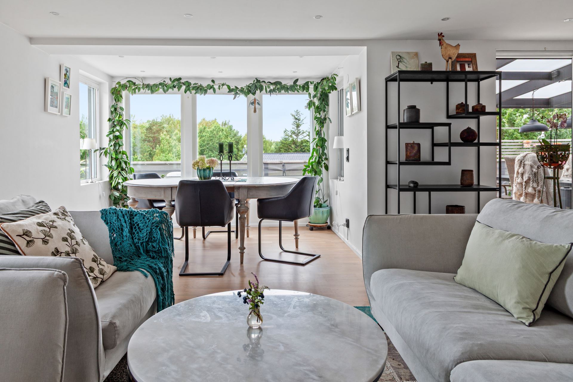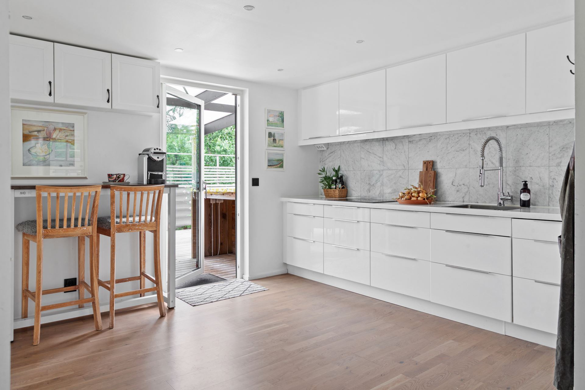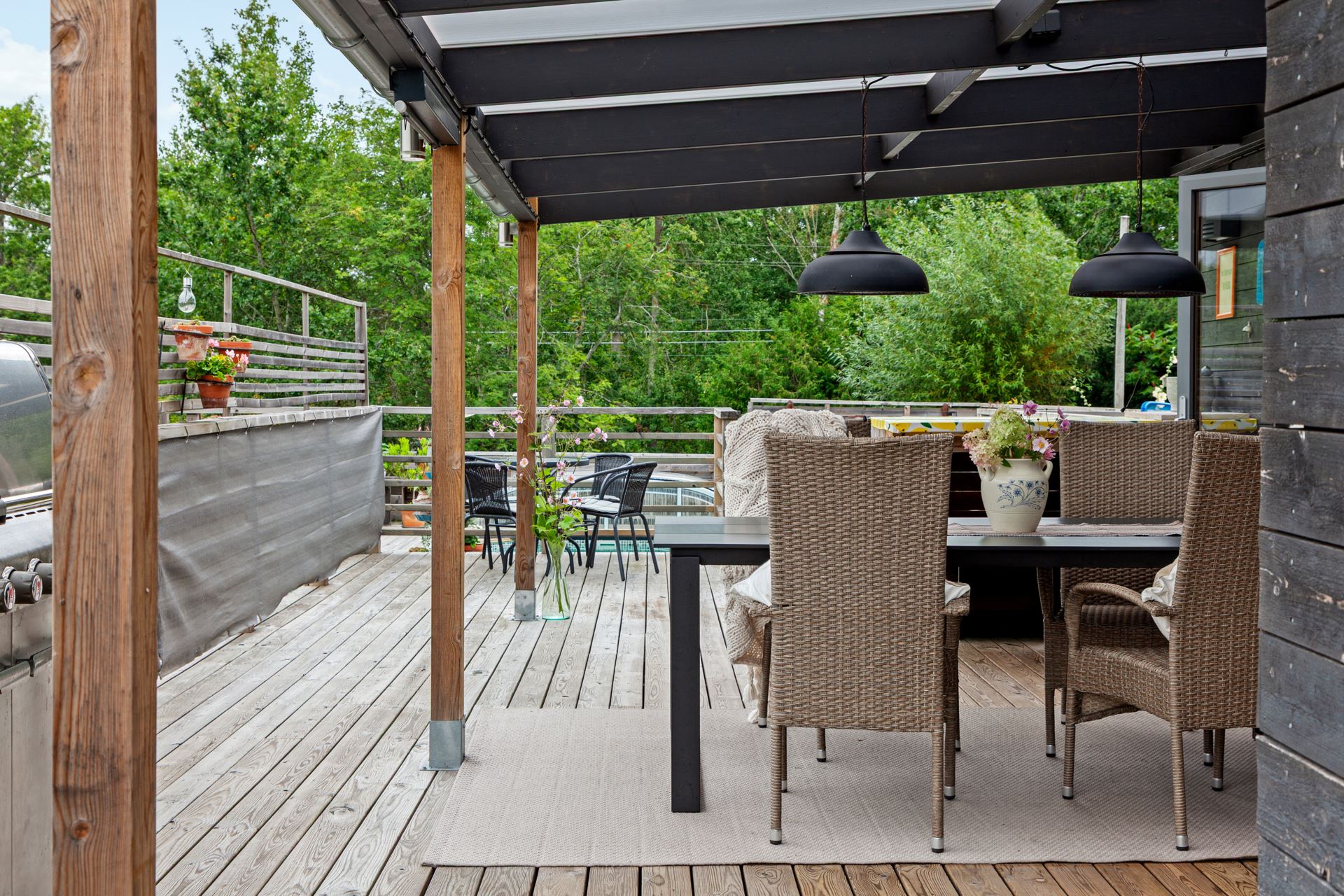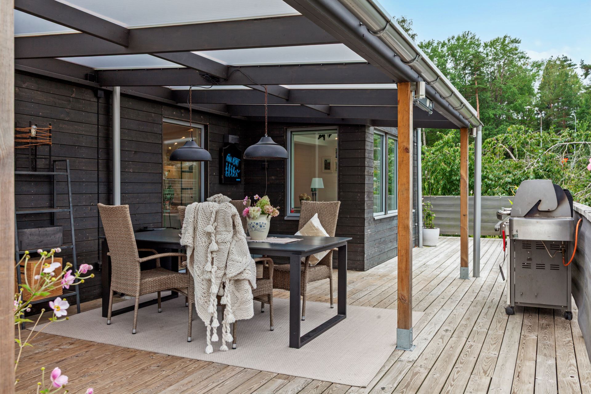 Här möts du av ett stilrent kök med högblanka luckor och delvis öppen planlösning mot vardagsrum och matsalsdel i burspråk – perfekt för både vardag och fest. Utgång till det stora trädäcket med takförsedd uteplats skapar en naturlig förlängning av boytan under årets varmare månader.