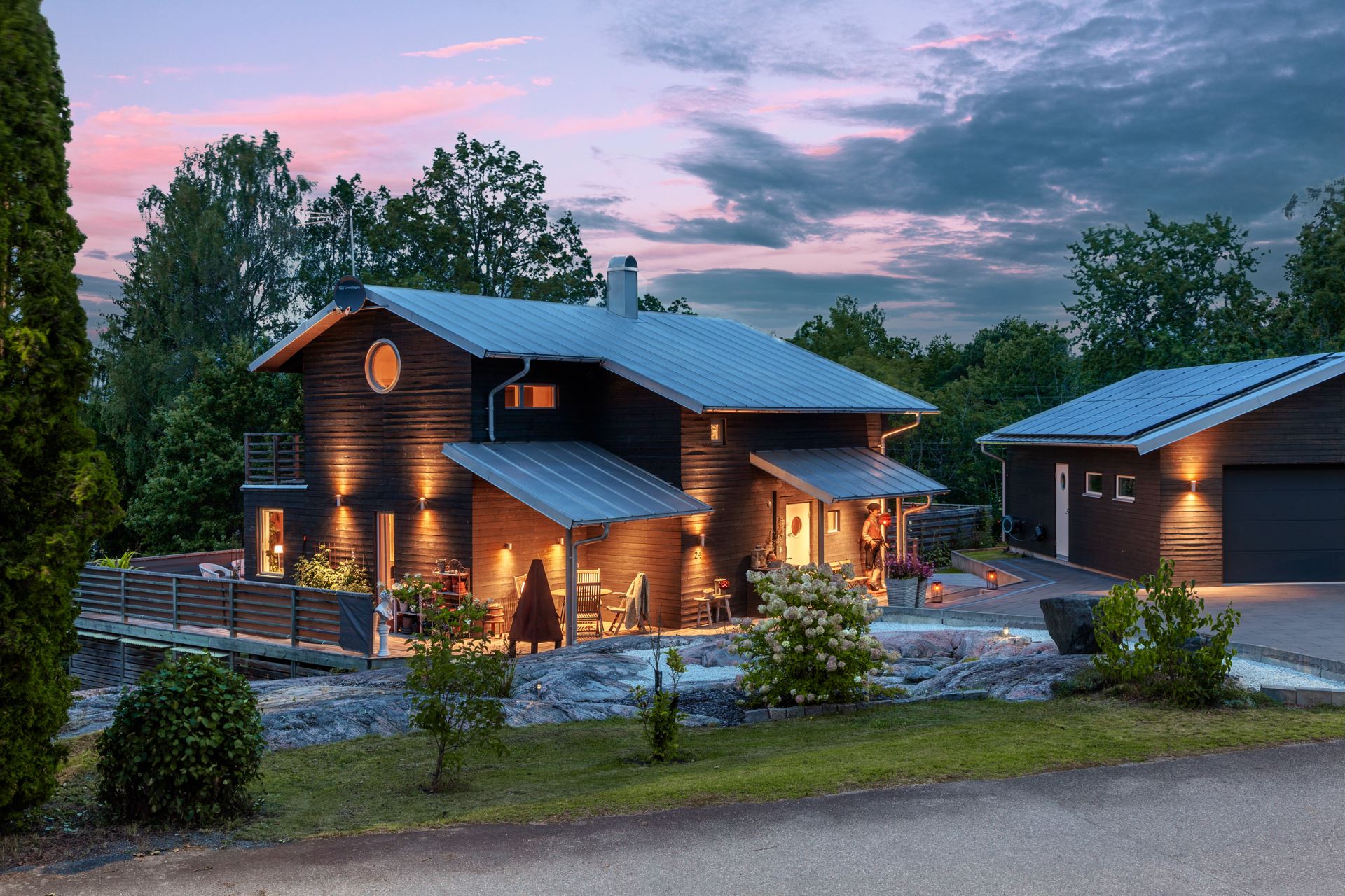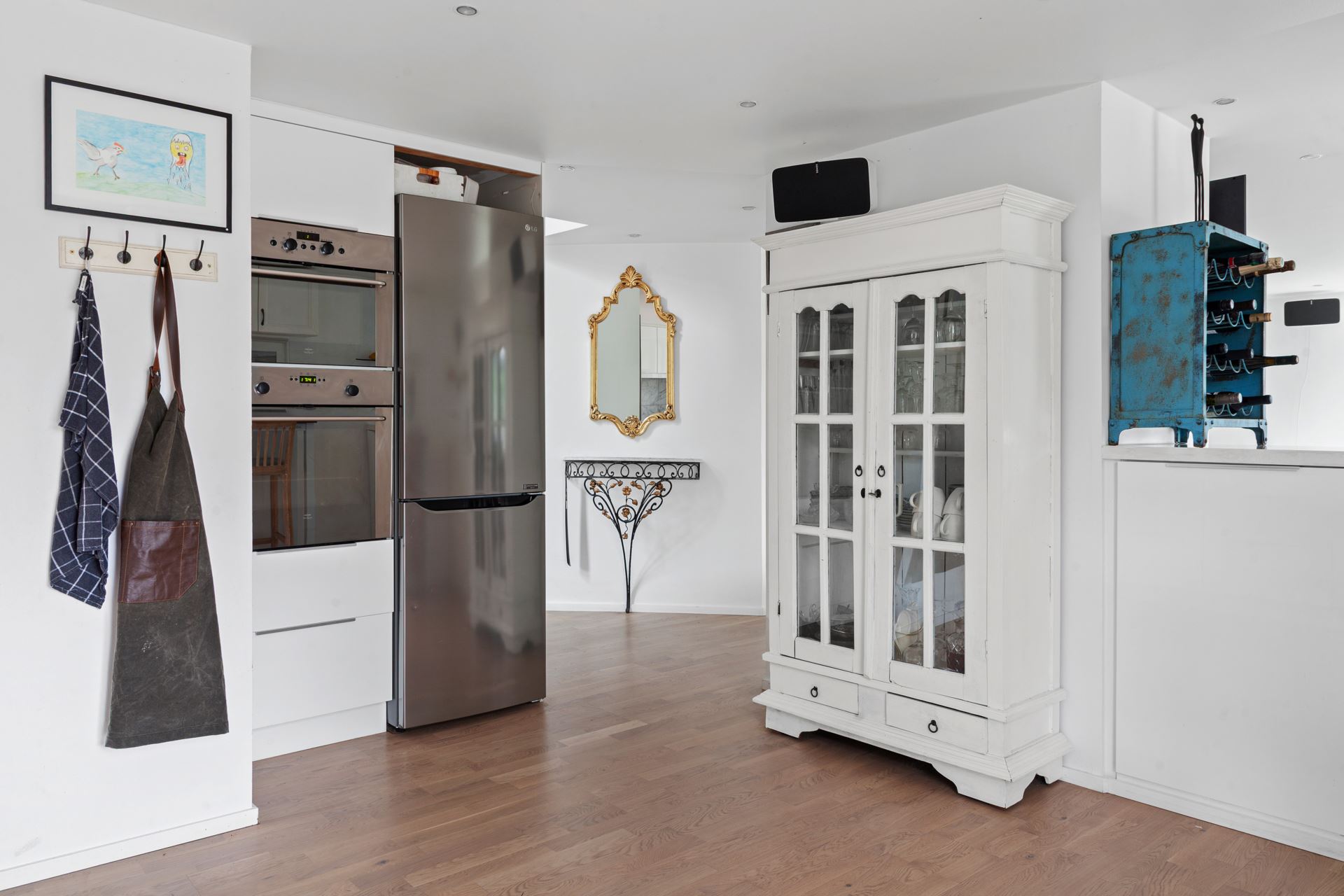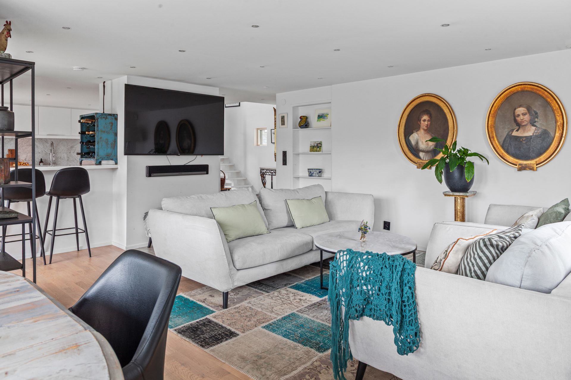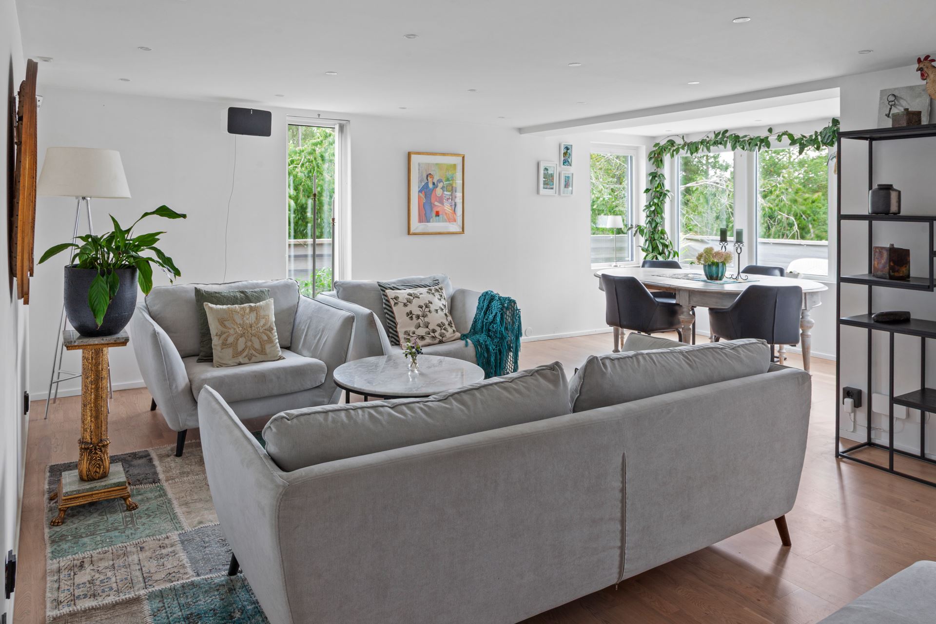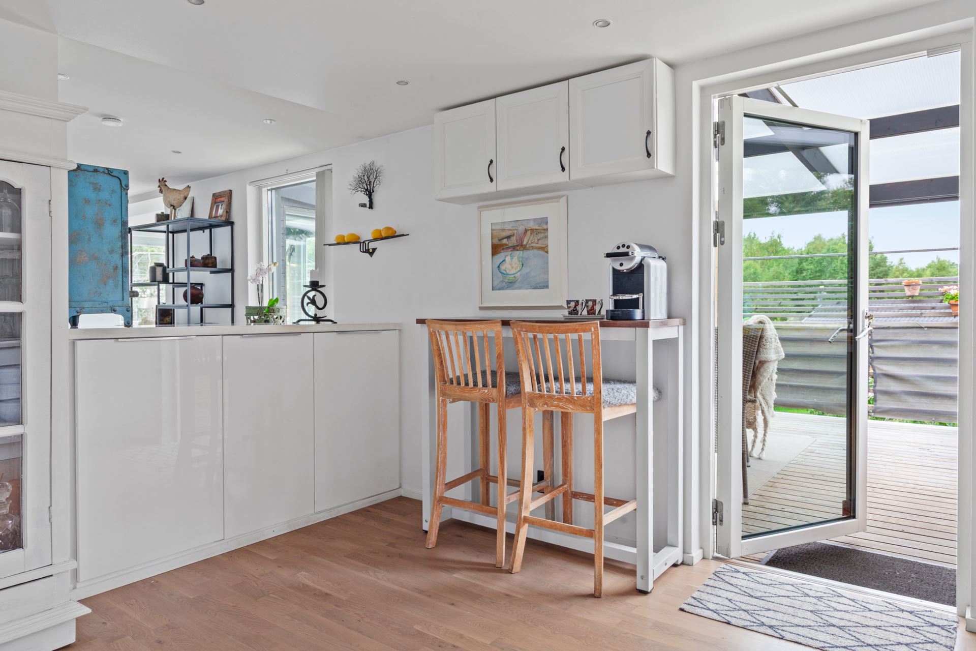 Här möts du av ett stilrent kök med högblanka luckor och delvis öppen planlösning mot vardagsrum och matsalsdel i burspråk – perfekt för både vardag och fest. Utgång till det stora trädäcket med takförsedd uteplats skapar en naturlig förlängning av boytan under årets varmare månader.