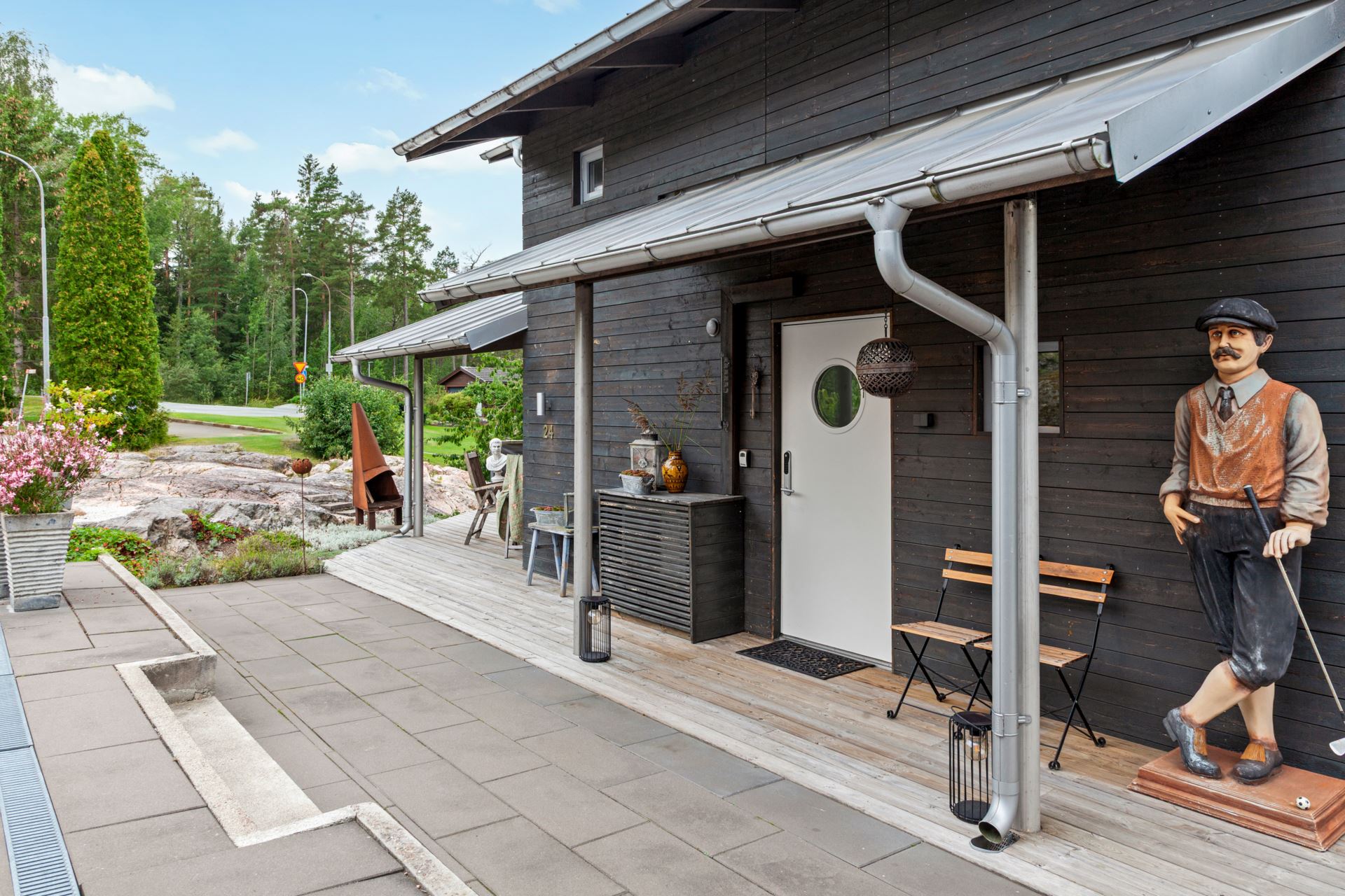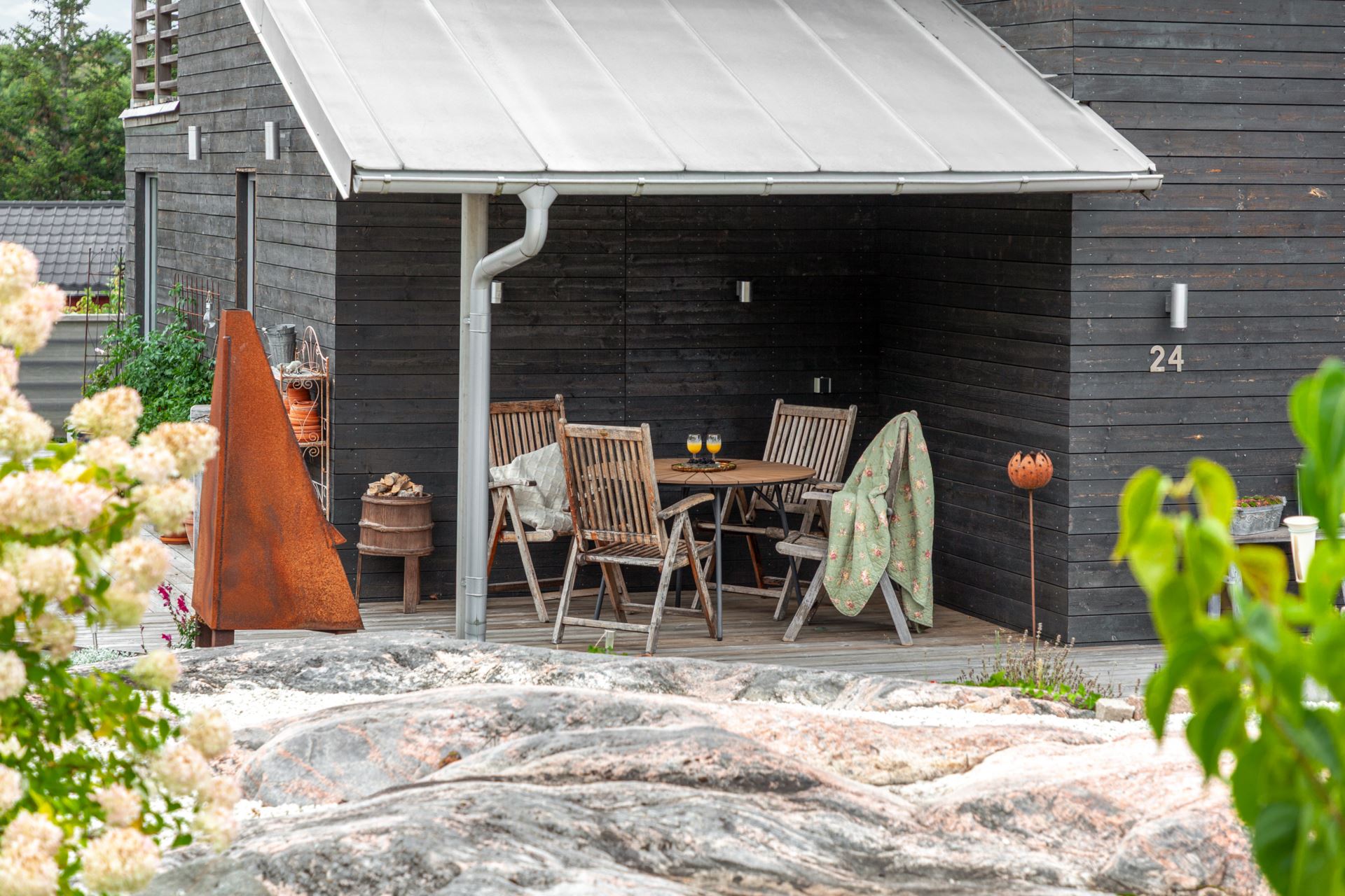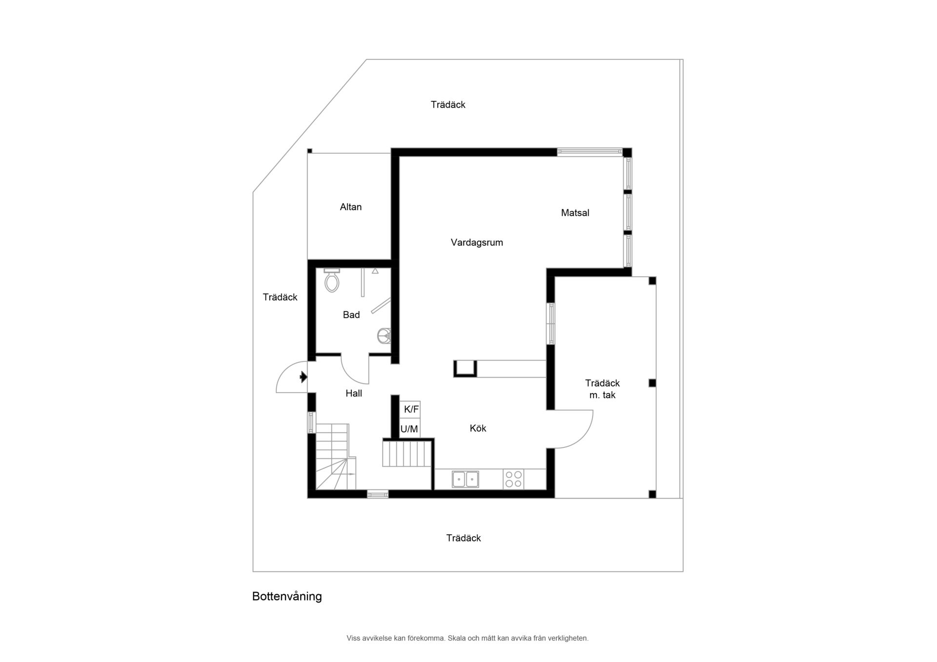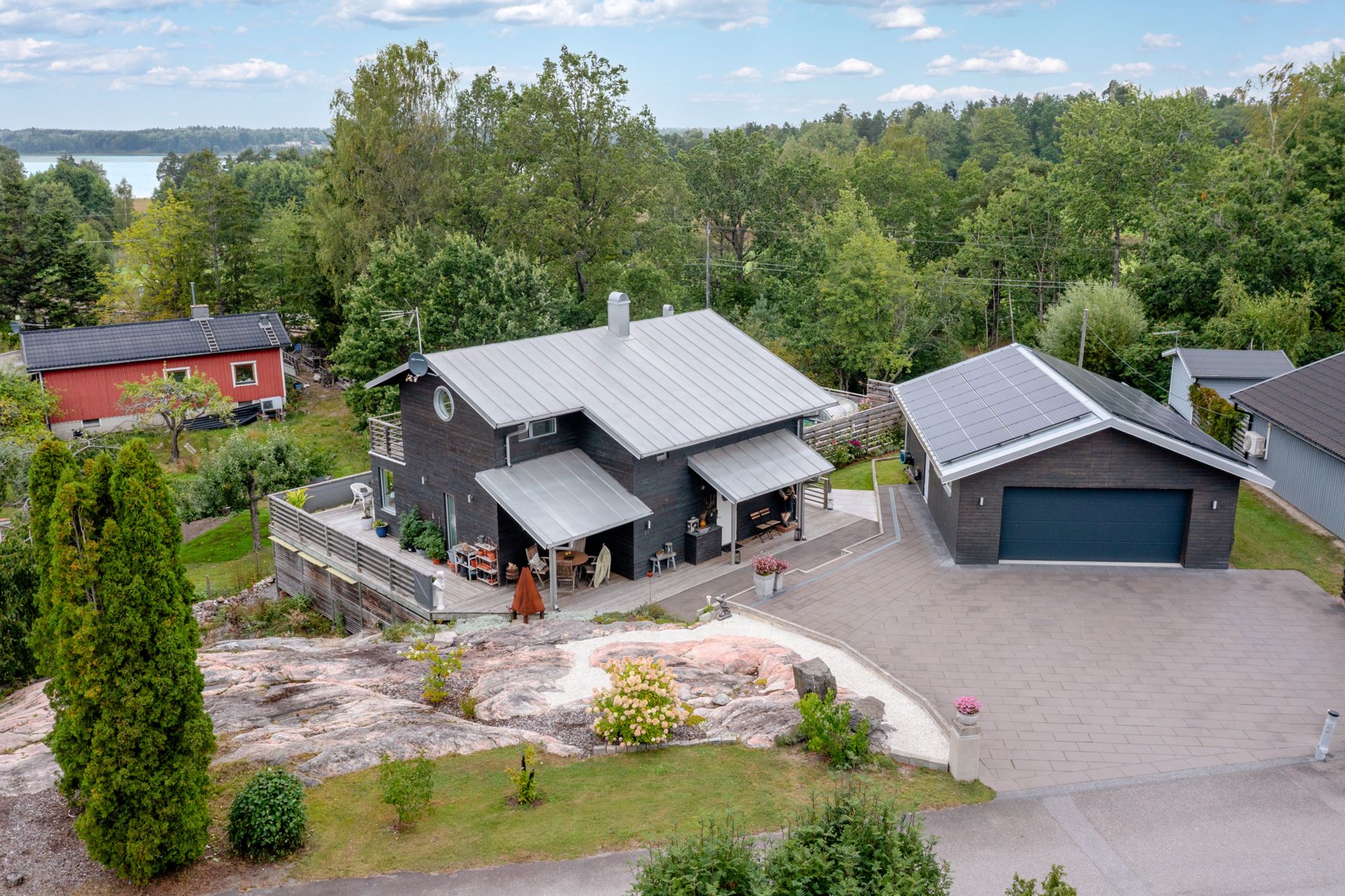Här möts du av ett stilrent kök med högblanka luckor och delvis öppen planlösning mot vardagsrum och matsalsdel i burspråk – perfekt för både vardag och fest. Utgång till det stora trädäcket med takförsedd uteplats skapar en naturlig förlängning av boytan under årets varmare månader.