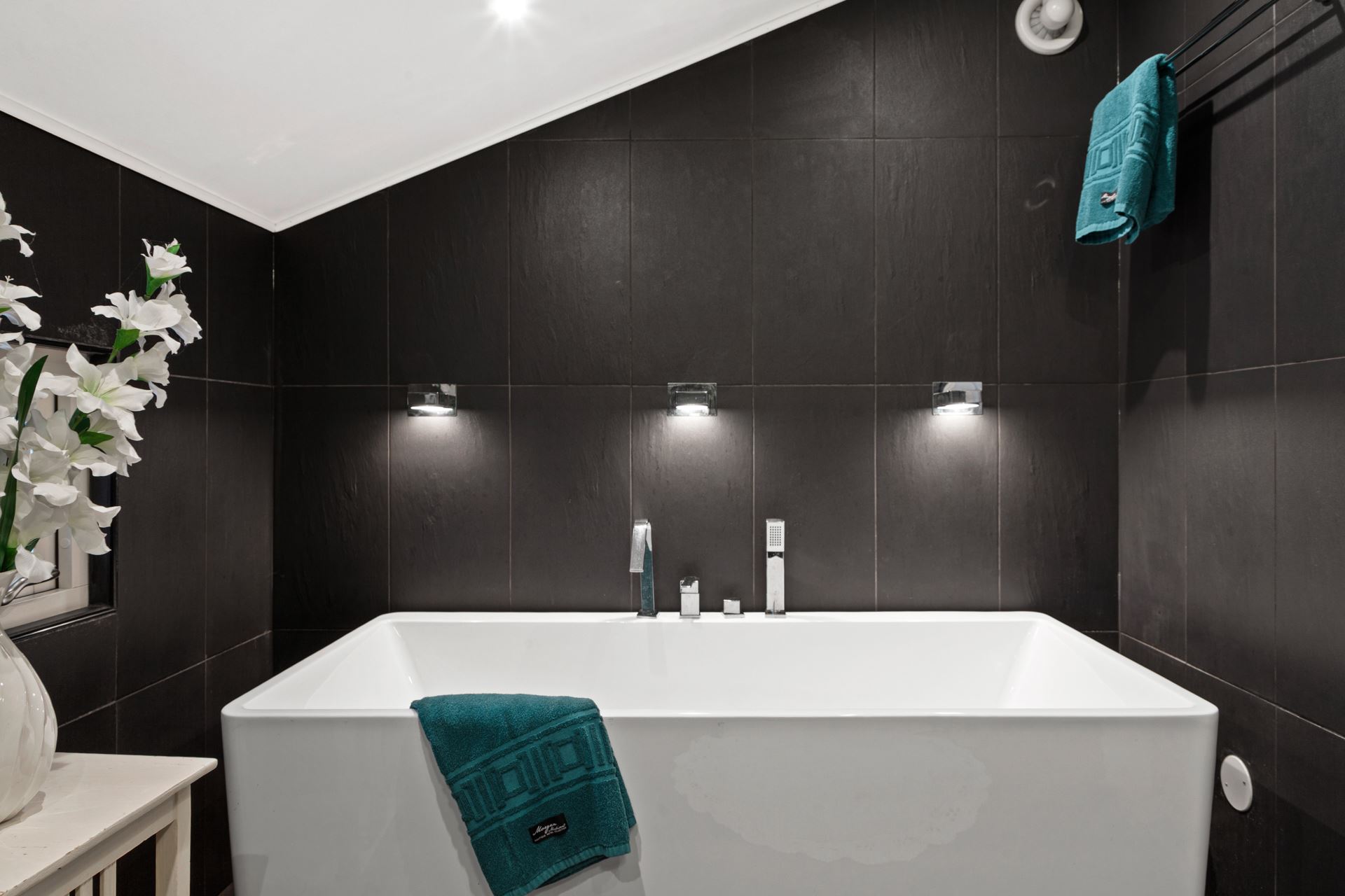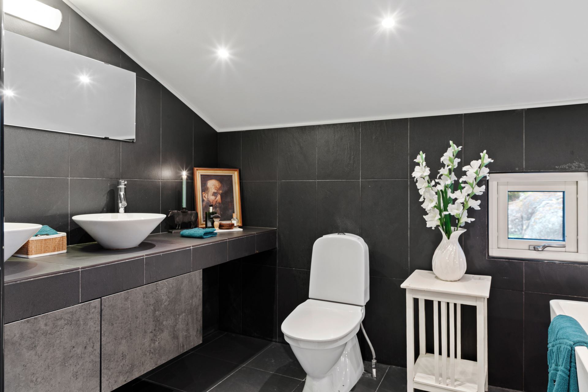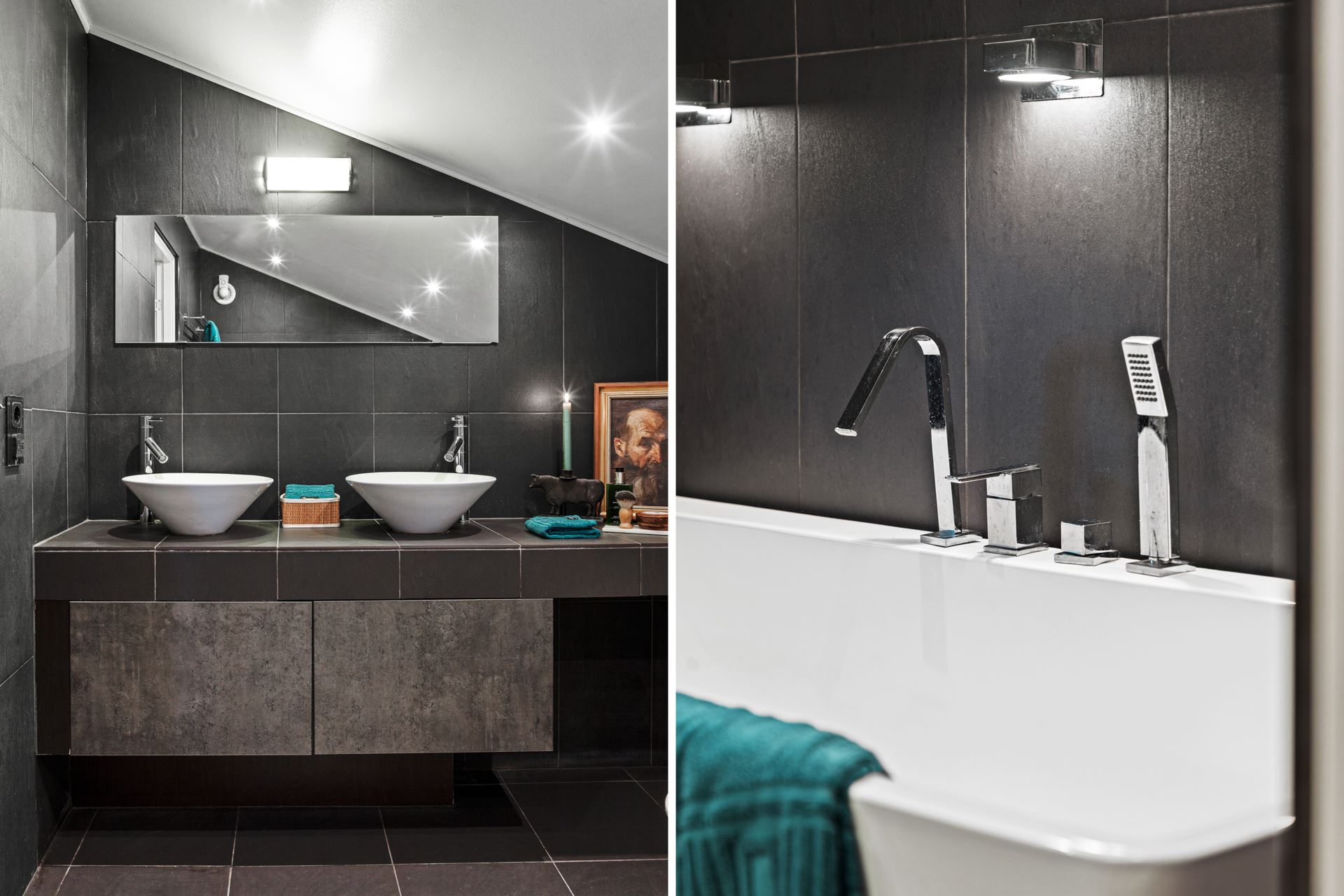 Övrigt: Badkar, kommod med två handfat, toalett, infällda spotlights, fönster