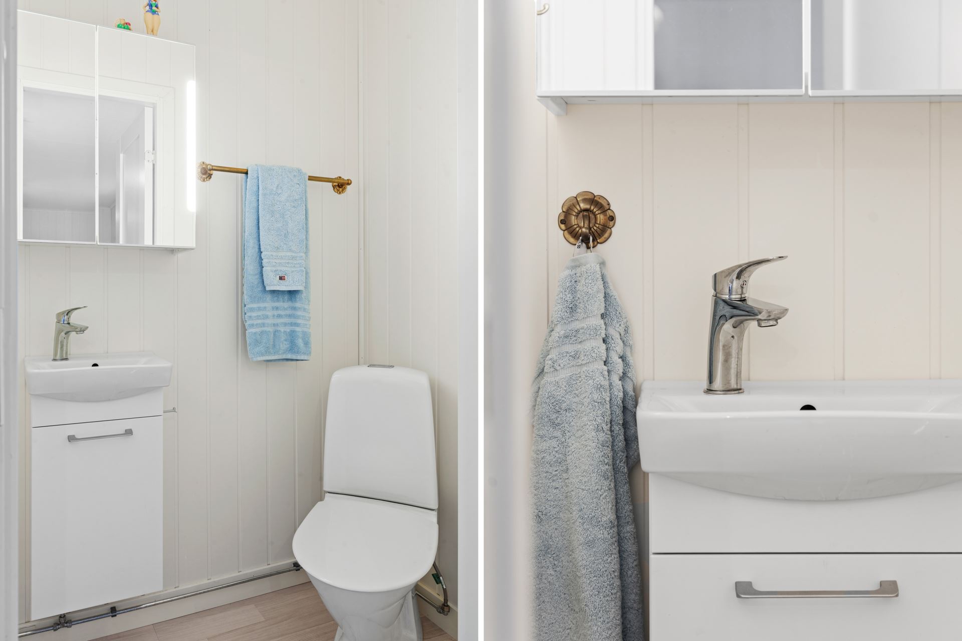 Övrigt: Utgång till trädgård, runt fönster. Framdraget för installation av värmepump. Gästtoalett med WC och komod med handfat och spegelskåp