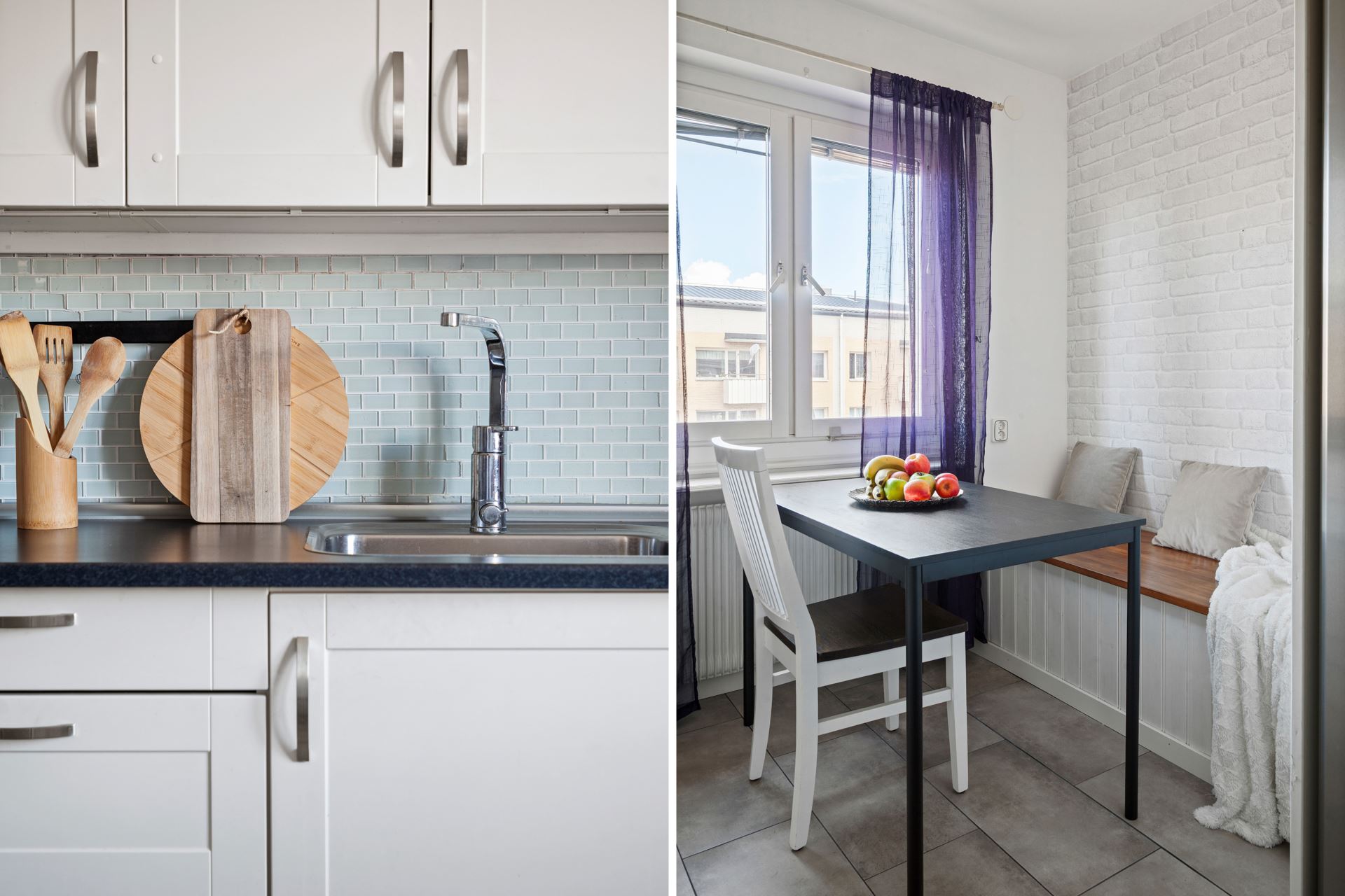Snickerier: Vita skåpsluckor samt mörk bänkskiva i laminat.
