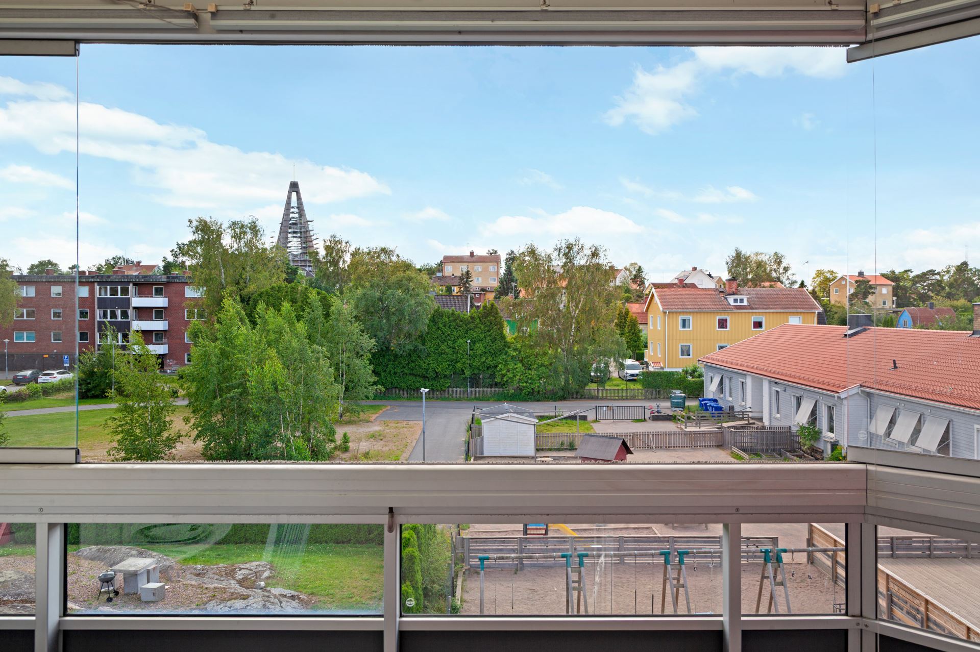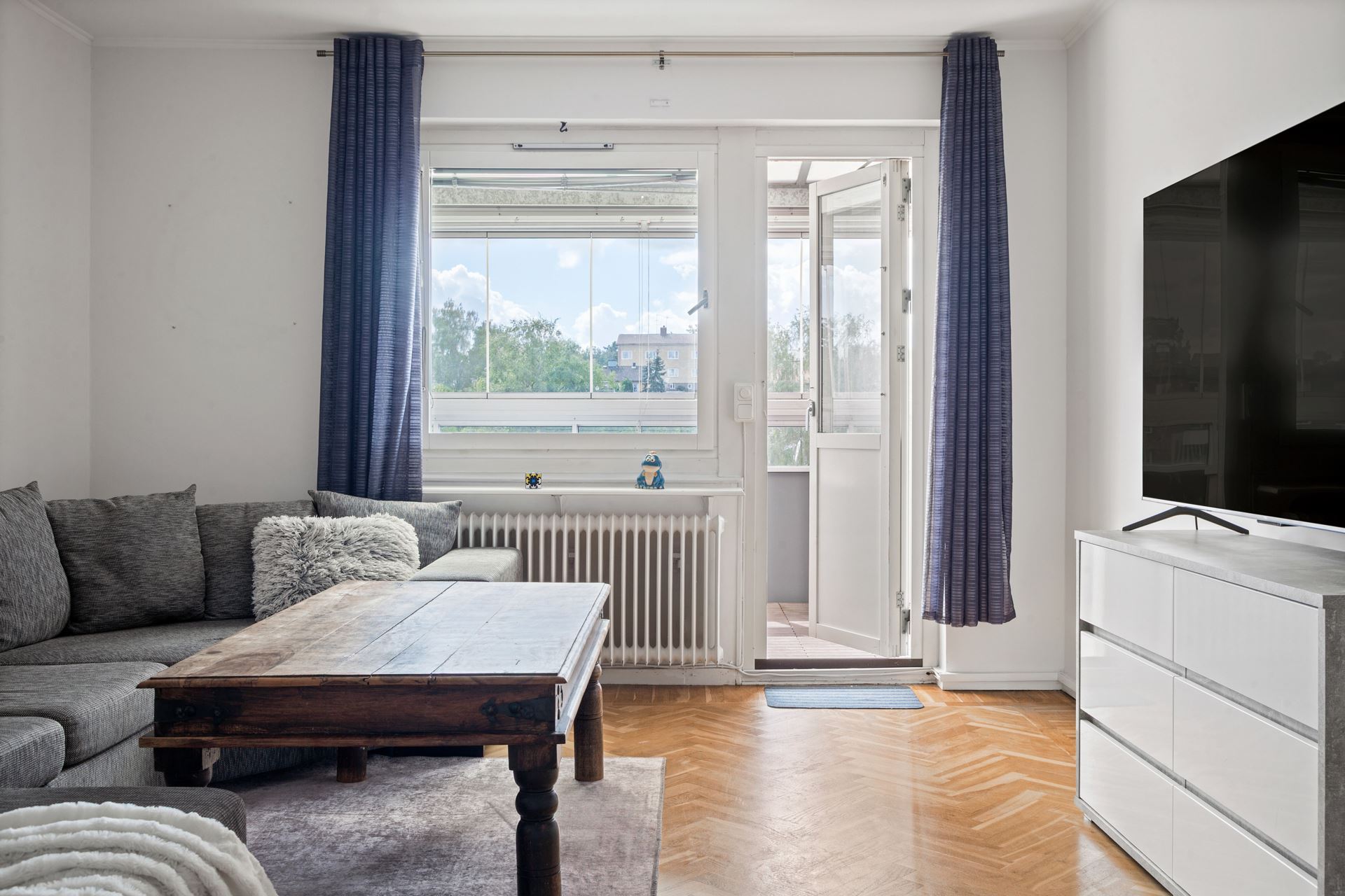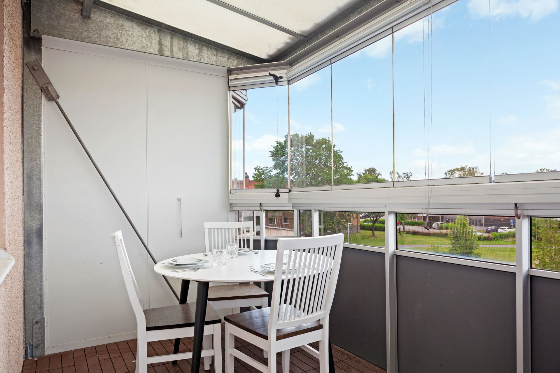 Vardagsrummet rymmer både soffhörna och arbetsplats, och härifrån når du den inglasade balkongen i sydvästläge – perfekt för att njuta av solen från lunch till kväll med utsikt mot den grönskande innergården.