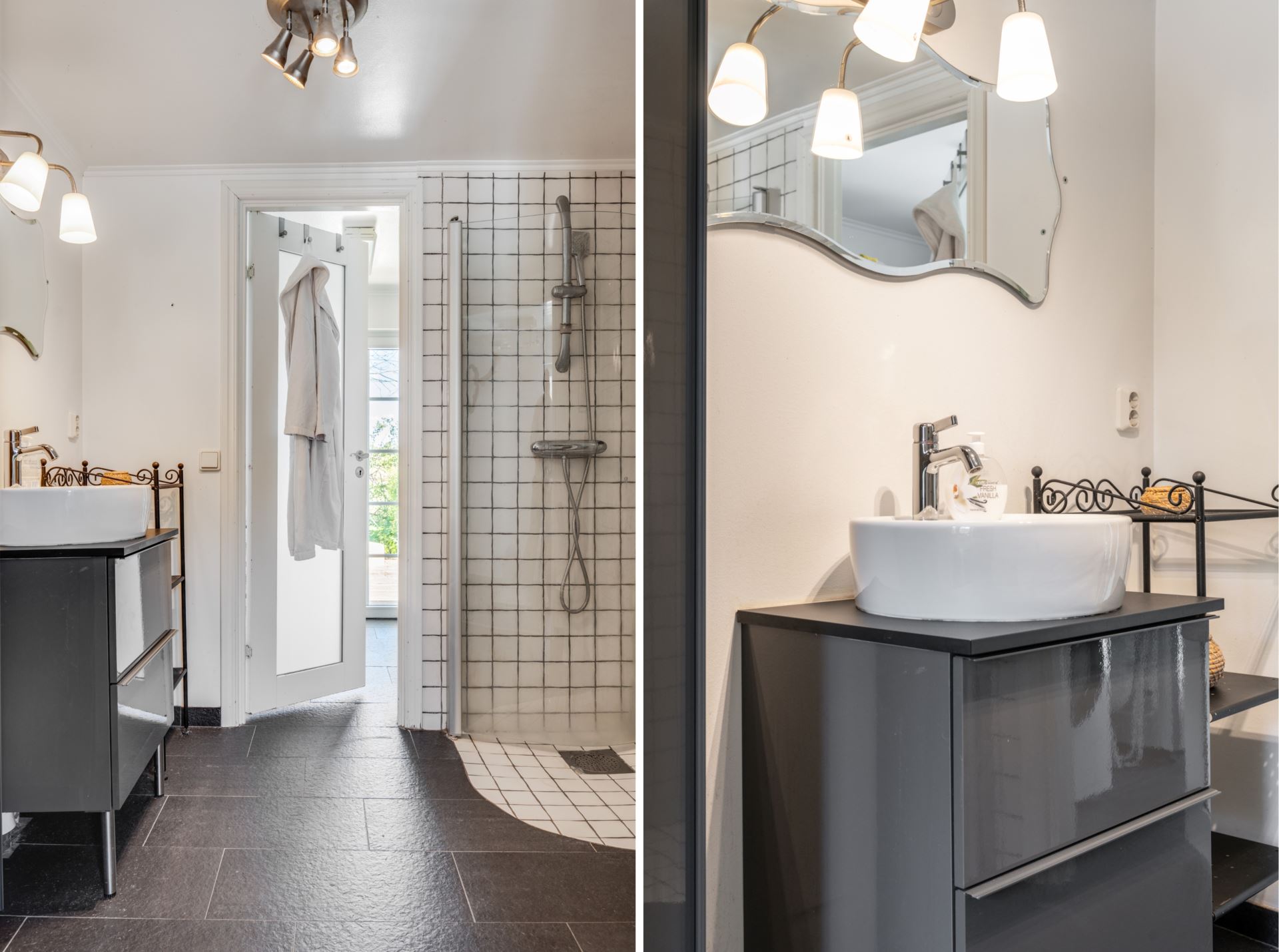 Här finns en rymlig dusch med glasvägg samt ett stilrent handfat placerat på en snygg kommod med god förvaring. Spegeln med dekorativ ram och den klassiska belysningen ger rummet en personlig touch och extra karaktär.