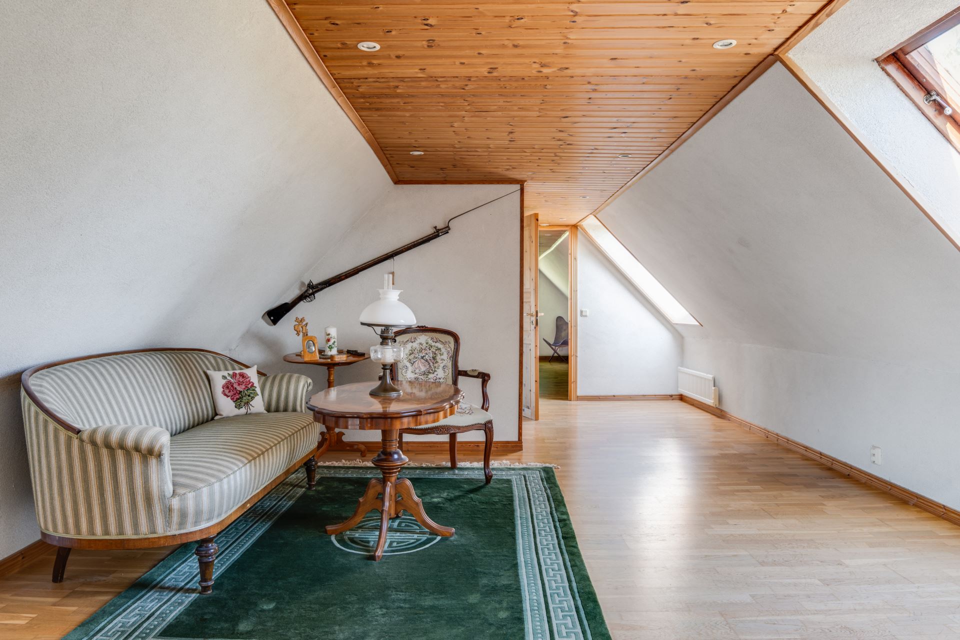 Rummet präglas av vackert trägolv, vitmålade väggar och ett varmt träpaneltak med infälld belysning som skapar en ombonad känsla.
