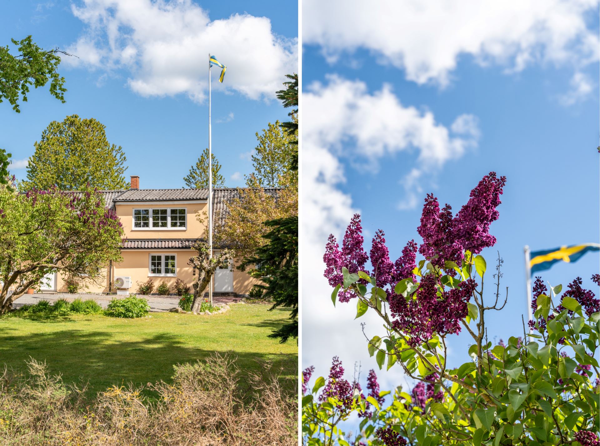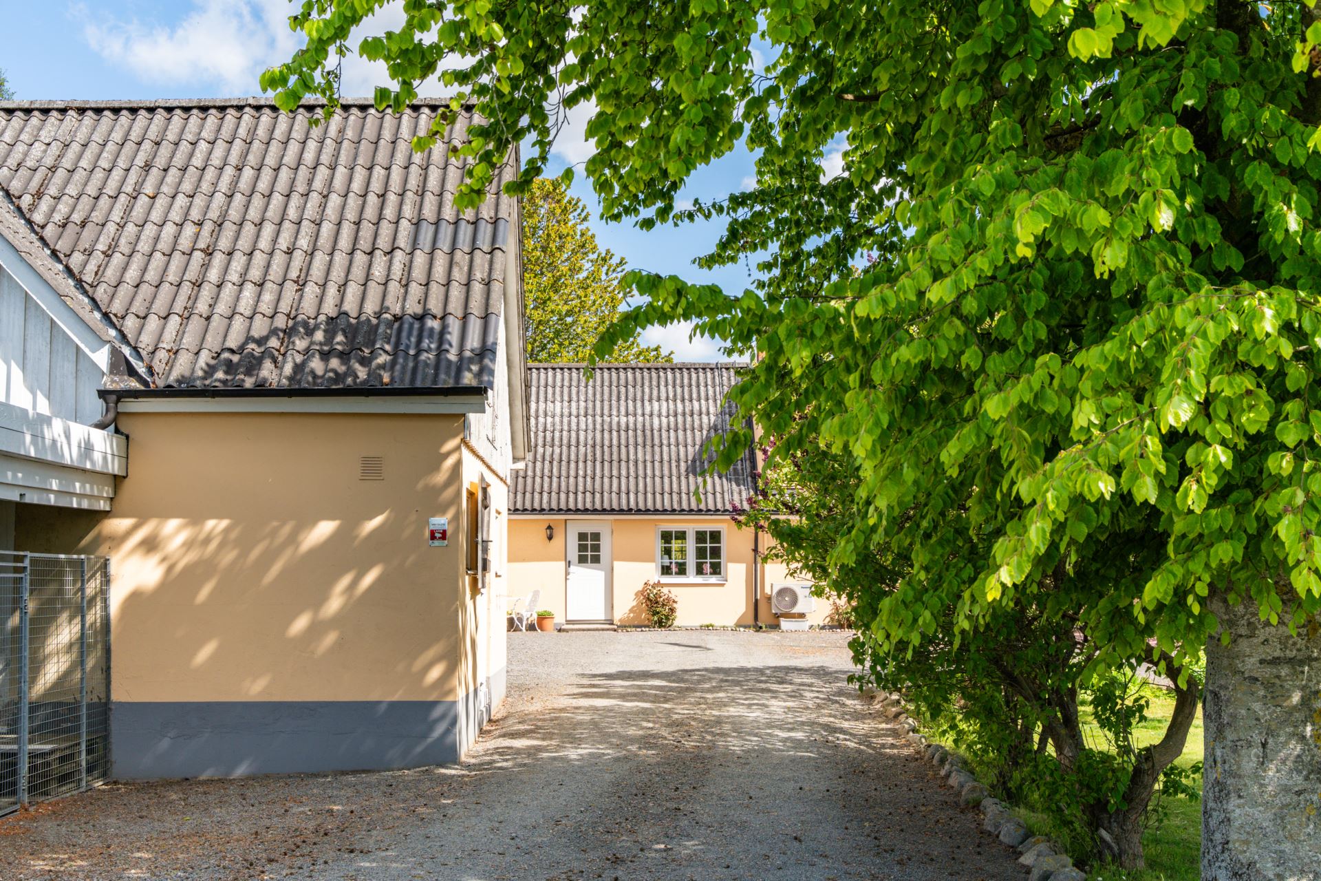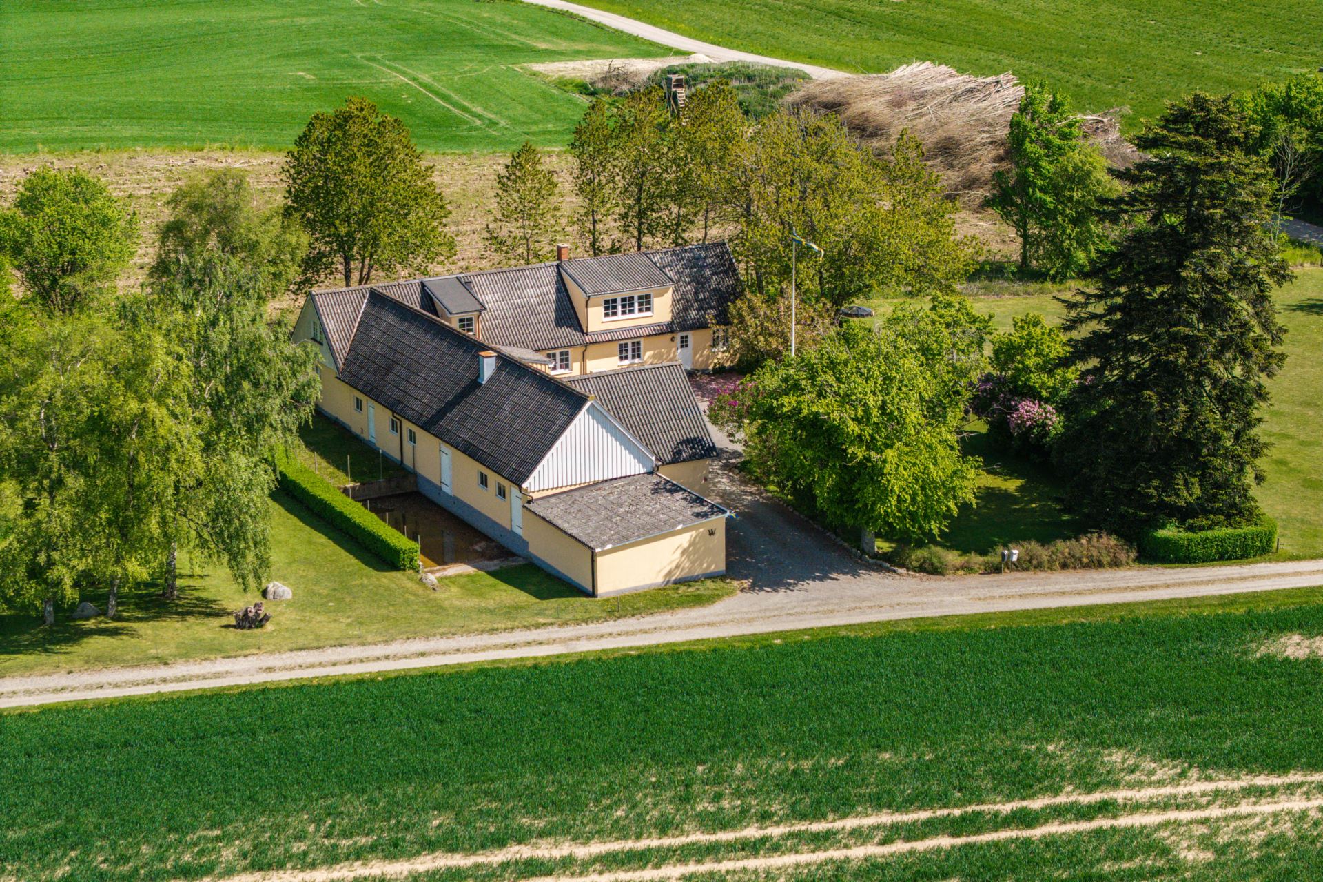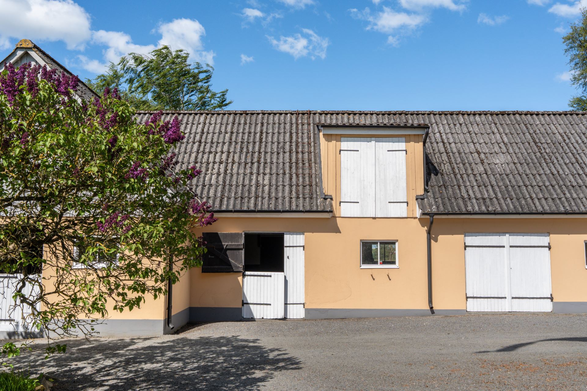 Den insynsskyddade trädgården ramas in av blommande syrener och lummig grönska, medan den stora gårdsplanen bjuder in till både lek, avkoppling och odling. På fastigheten finns även verkstadsdel, förråd och stall för hästar.