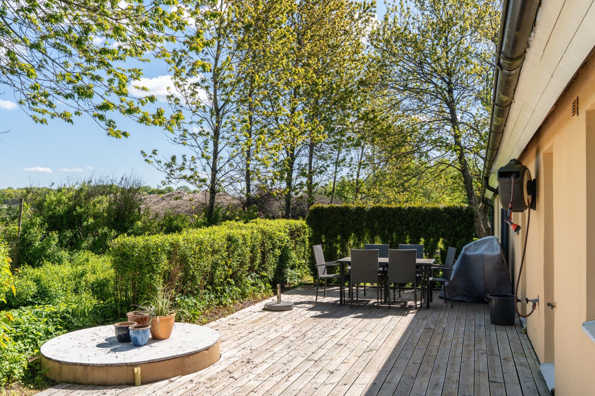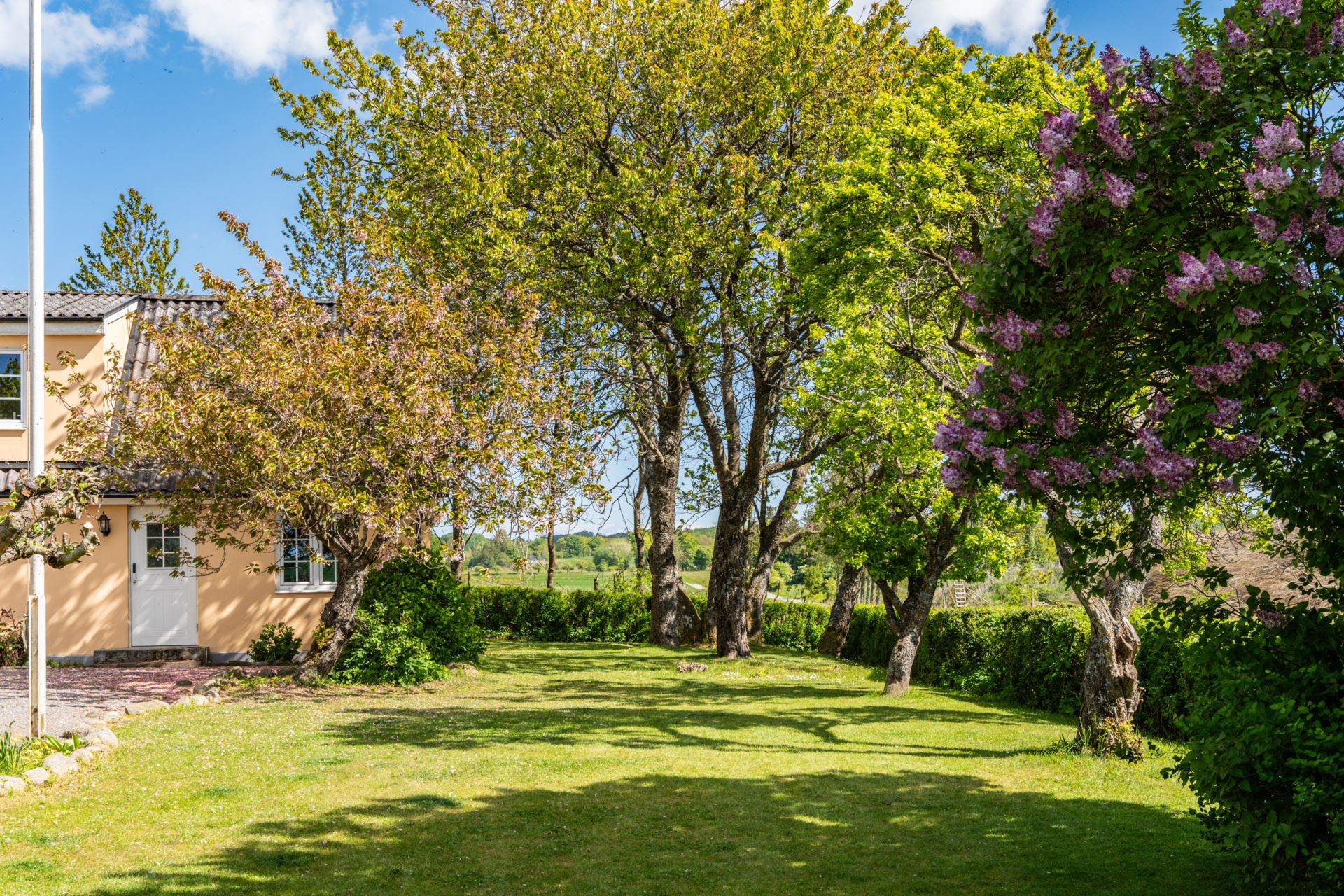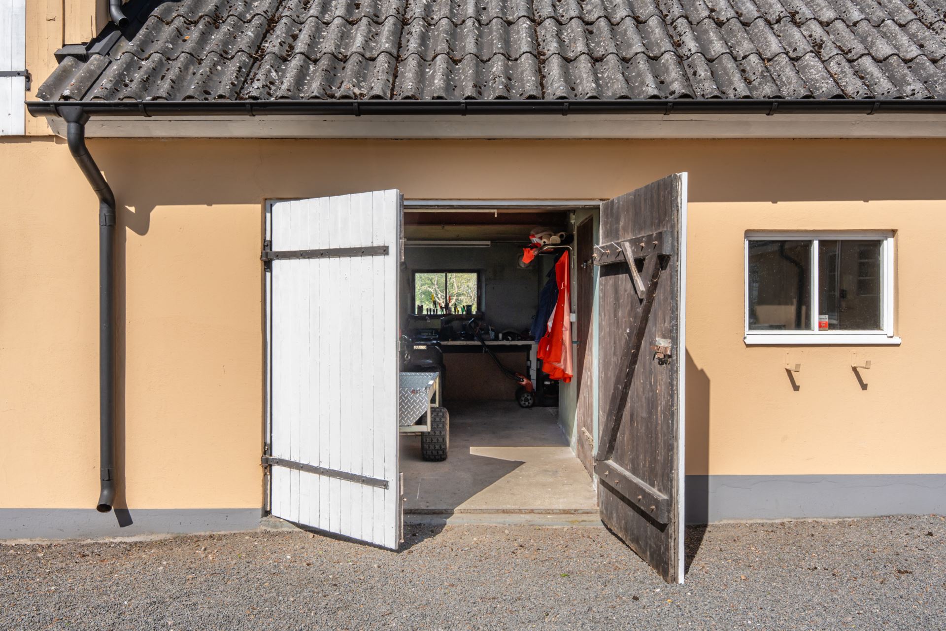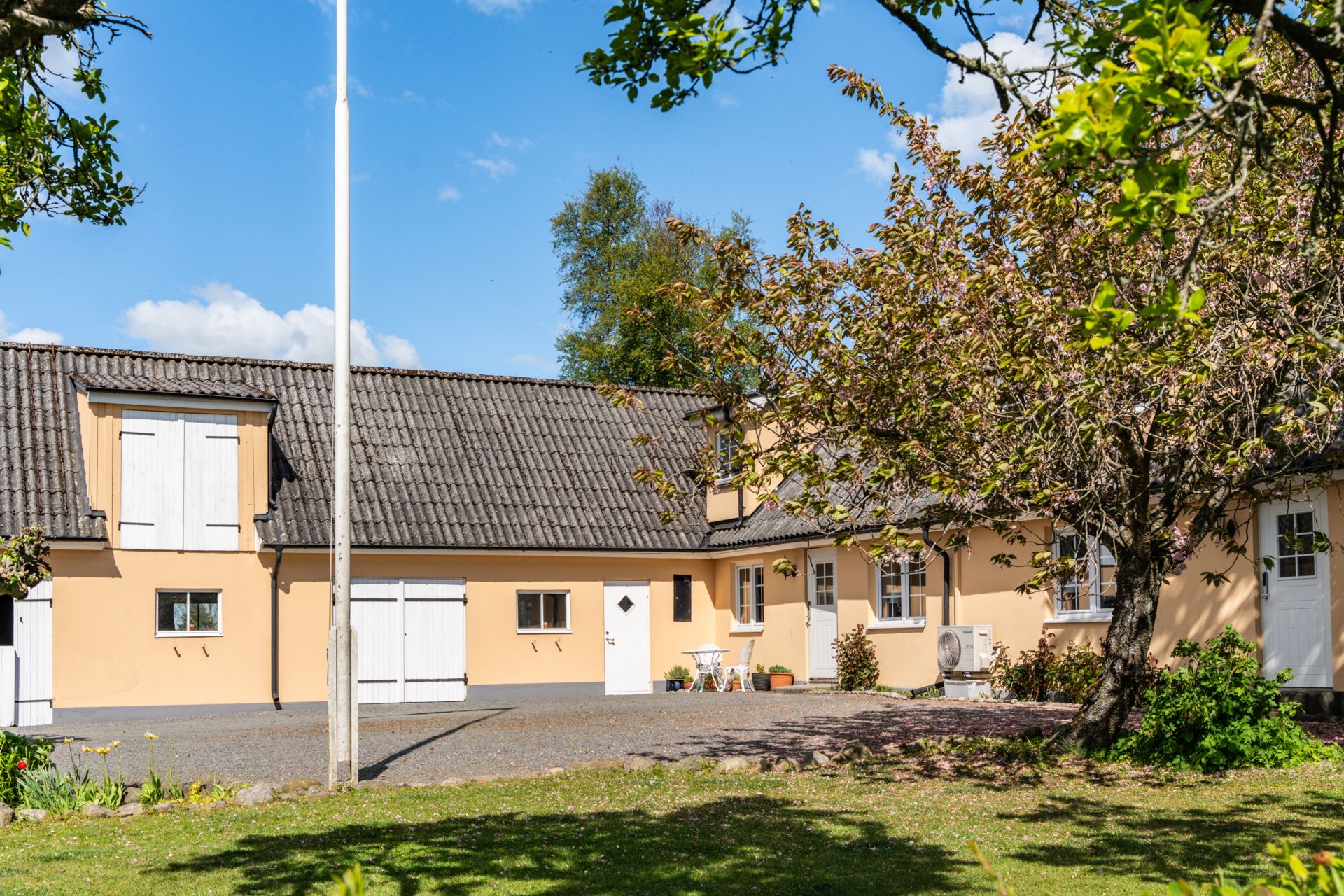 Den insynsskyddade trädgården ramas in av blommande syrener och lummig grönska, medan den stora gårdsplanen bjuder in till både lek, avkoppling och odling. På fastigheten finns även verkstadsdel, förråd och stall för hästar.