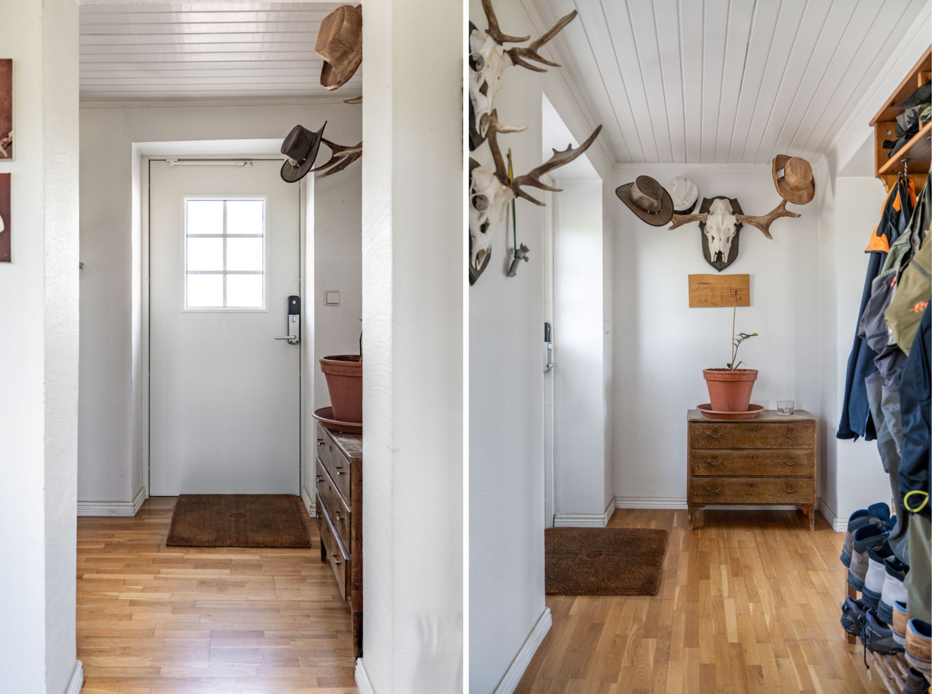 Praktisk och välplanerad groventré med funktion i fokus. Här finns gott om plats för avhängning av ytterkläder och skor, vilket gör det till ett perfekt komplement till den huvudsakliga entrén. Parketten tillsammans med ljusa väggar och det vitmålade trätaket skapar en trivsam och välkomnande känsla, även i denna mer funktionella del av huset.