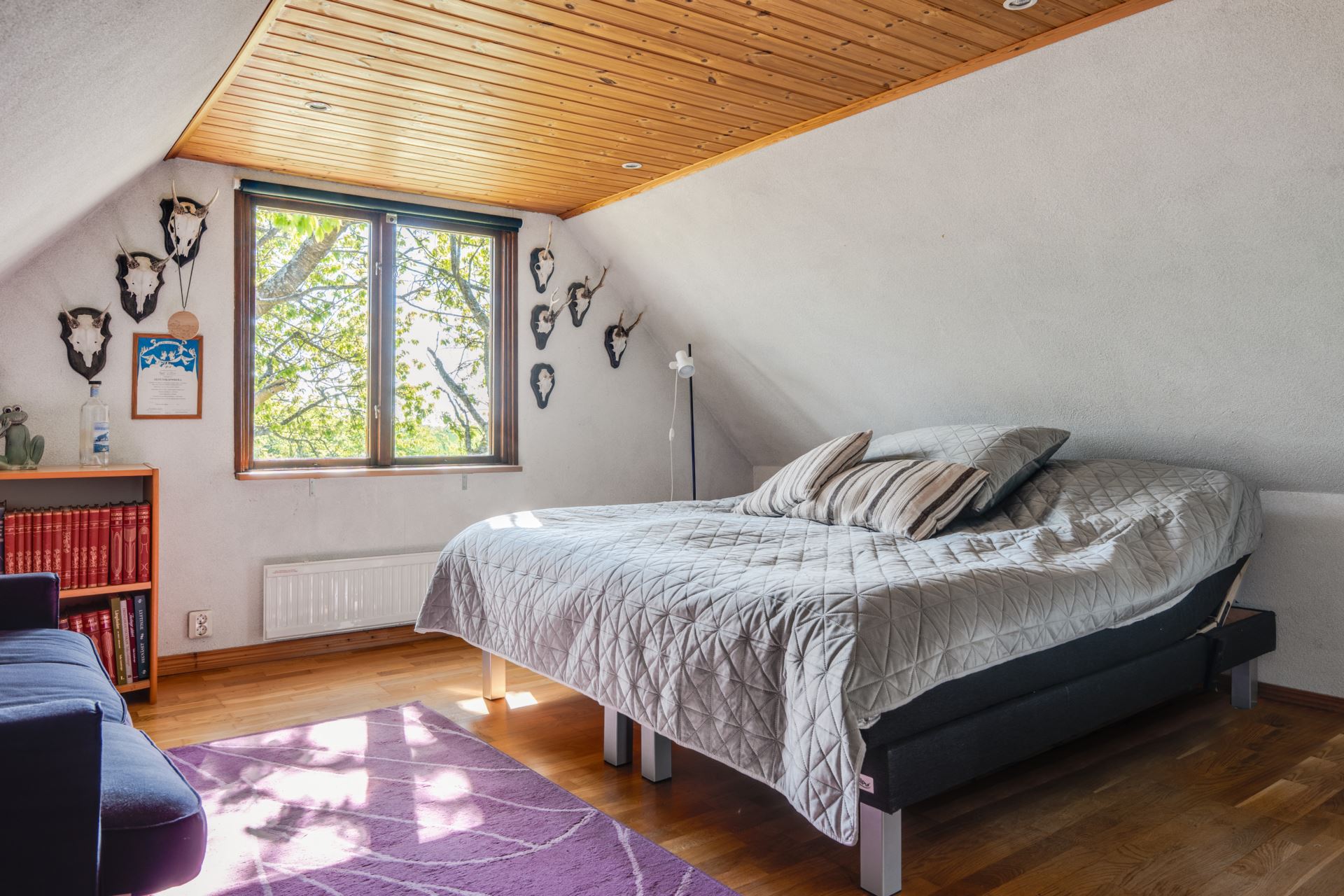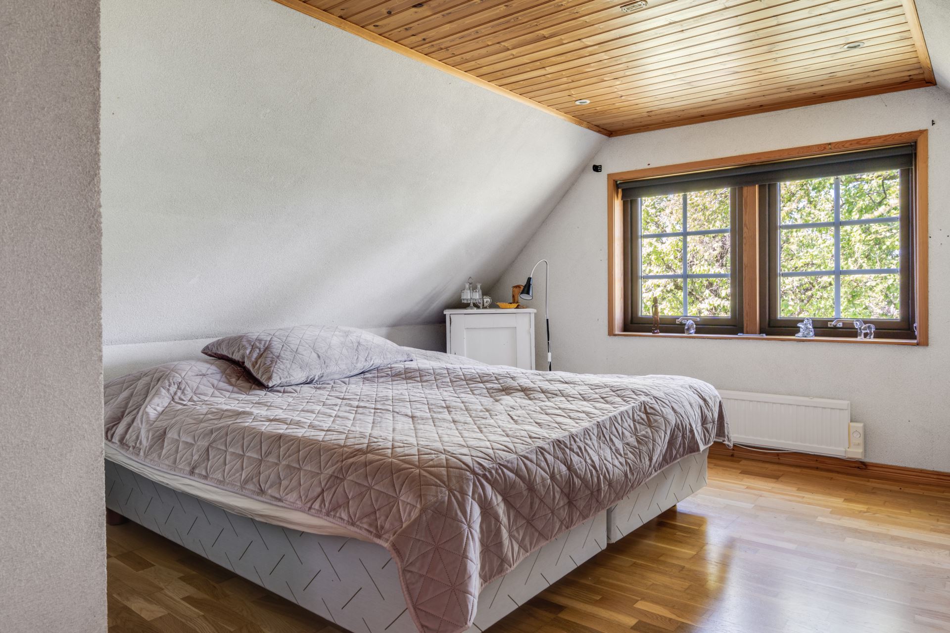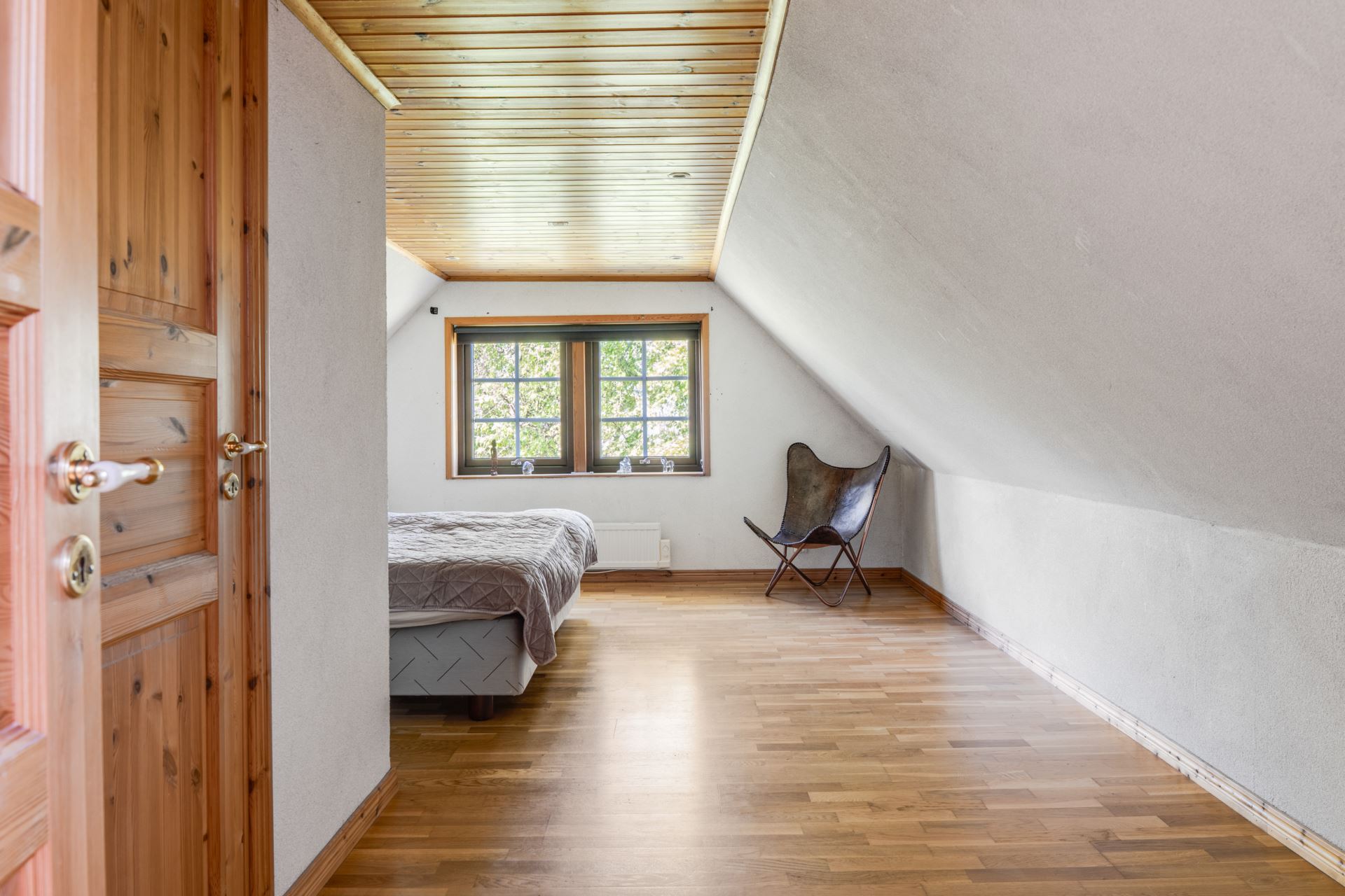 ymligt och trivsamt sovrum med karaktär och charm. Det här rummet ligger avskilt på ovanvåningen och erbjuder gott om plats för både säng och möblering efter behov. Trägolvet harmonierar fint med det taket i träpanel som ger en varm och ombonad känsla. De stora fönstren vetter mot grönska och skänker ett behagligt ljusflöde samtidigt som utsikten ger en naturnära inramning. Rummet är även utrustat med en praktisk garderob som ger bra förvaringsmöjligheter utan att kompromissa med rymden.