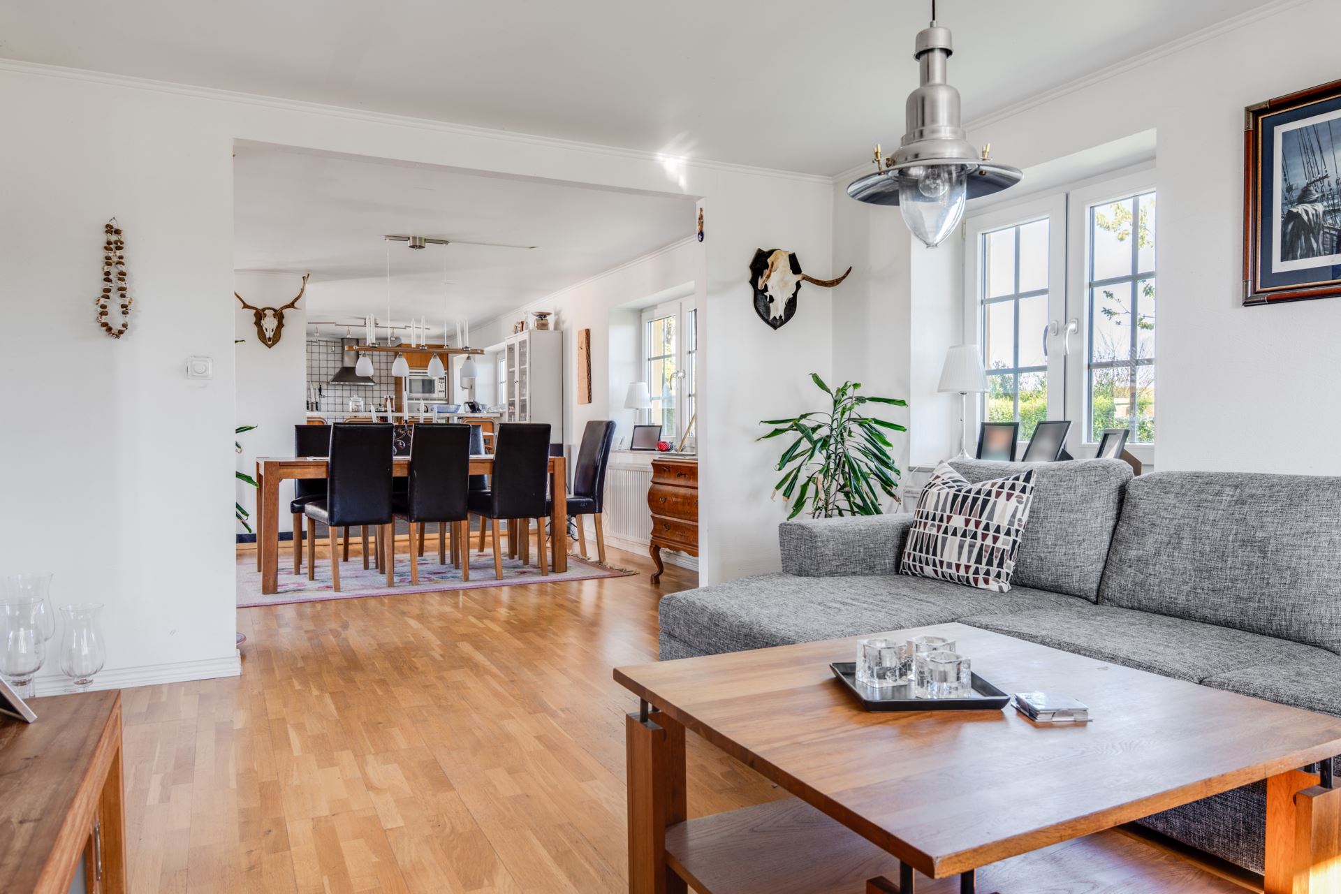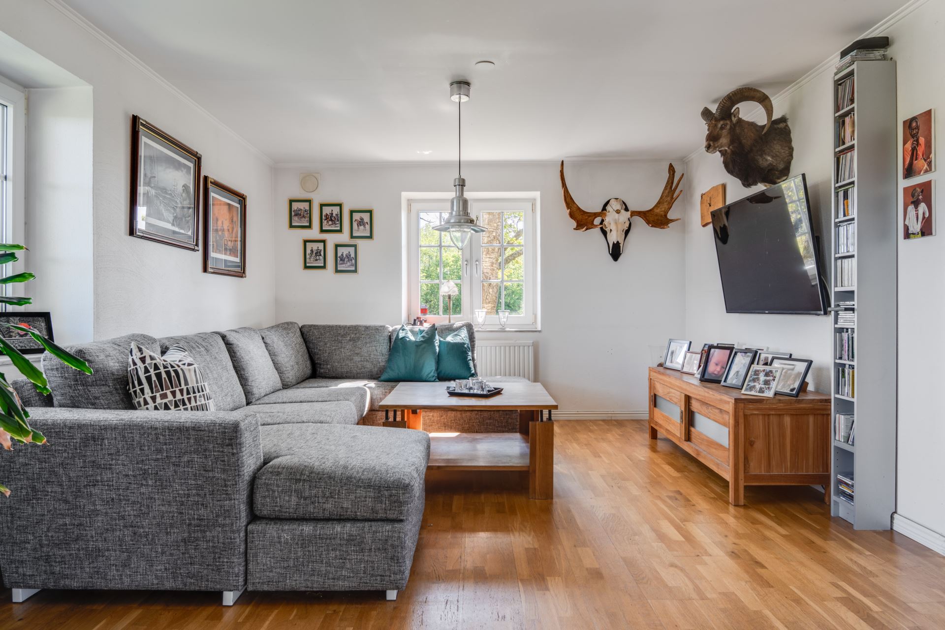 Flera fönster i olika väderstreck ger ett generöst ljusinsläpp och en fin vy ut mot trädgården. Trägolvet i kombination med ljusa väggar och klassiska detaljer ger rummet en varm och inbjudande känsla.