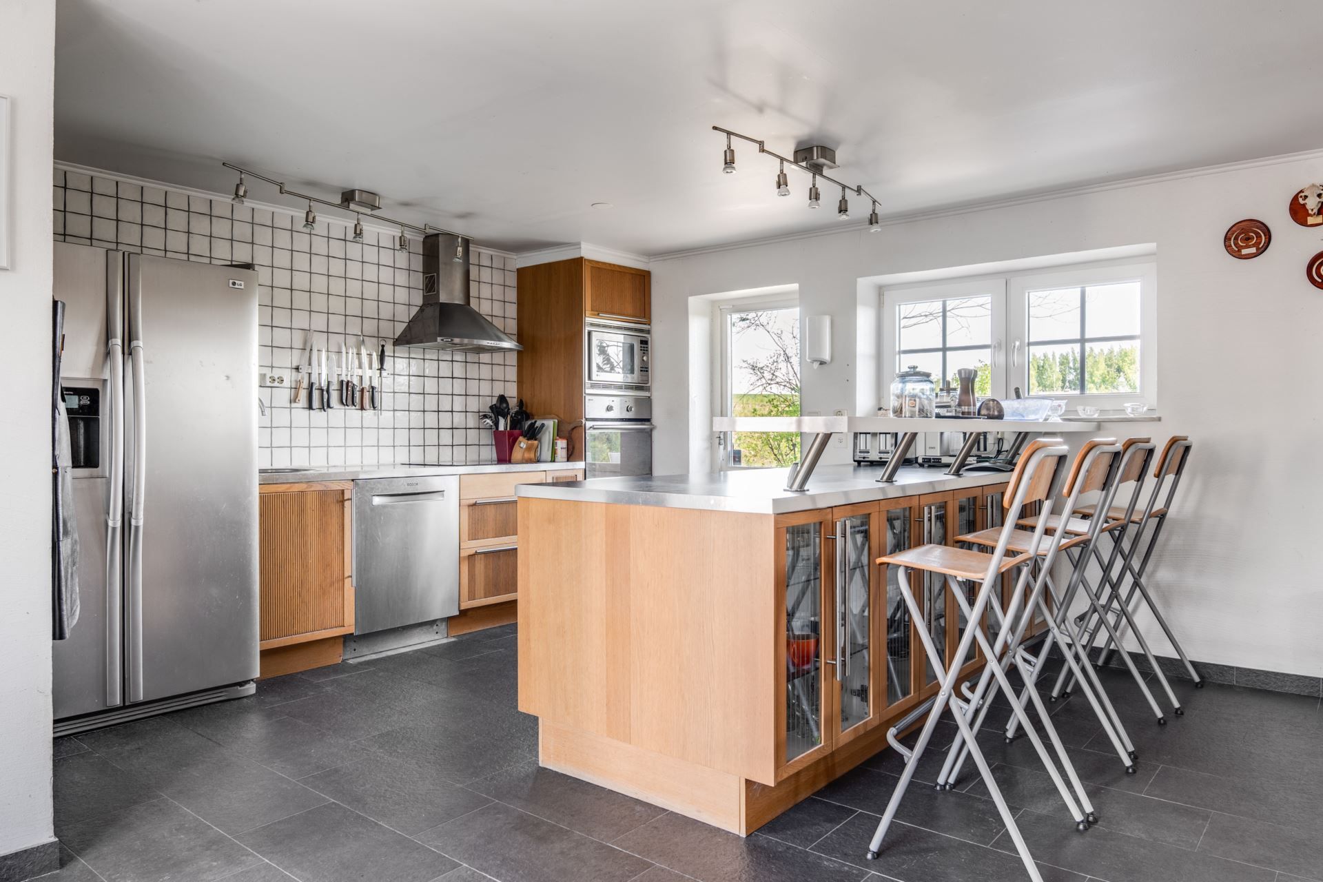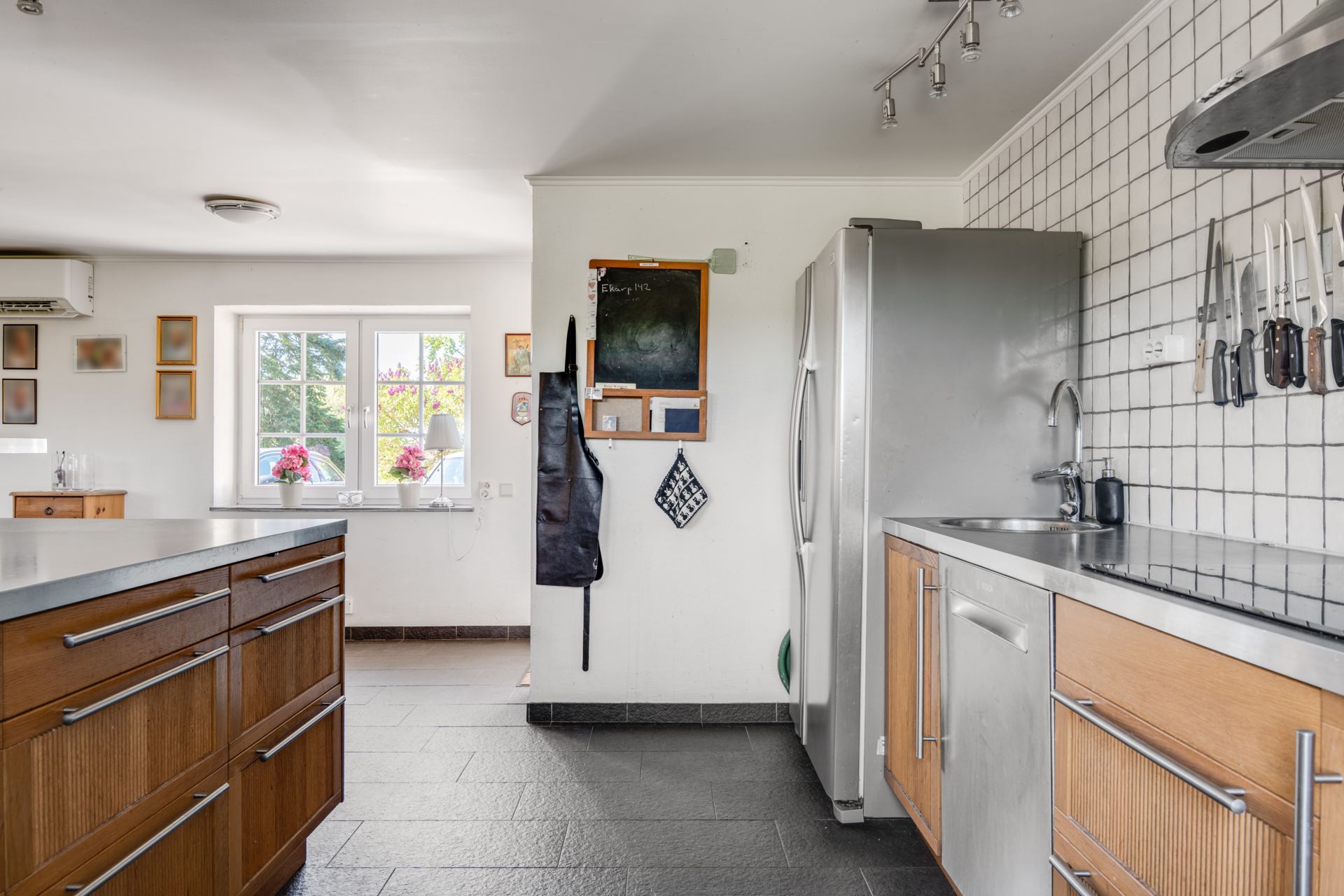 En bardisk i anslutning till köksön skapar en naturlig plats för frukostar, samtal eller ett glas vin medan middagen tillagas. Den öppna planlösningen och den direkta utgången till trädgården gör det enkelt att förlänga måltiderna utomhus under sommarhalvåret.