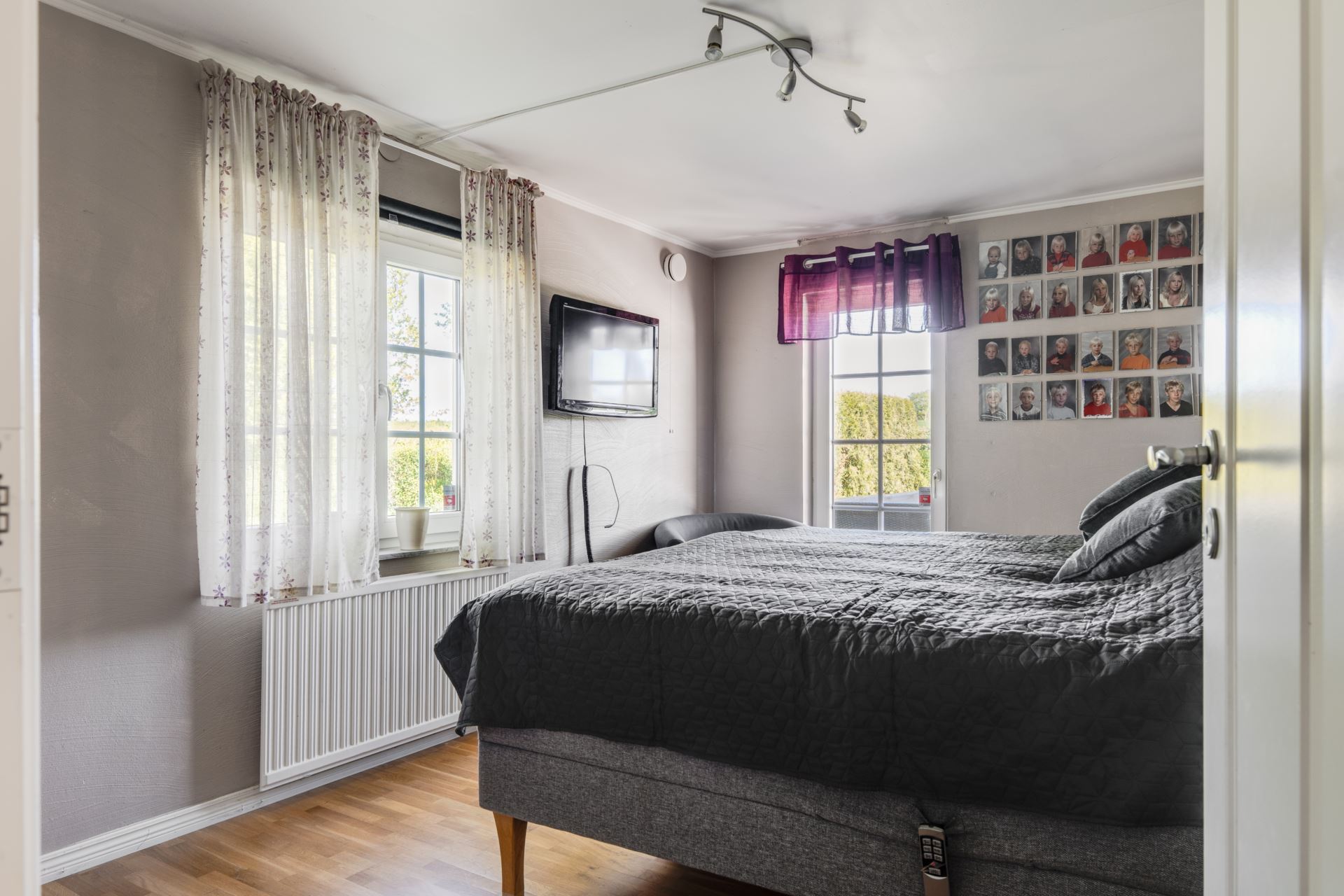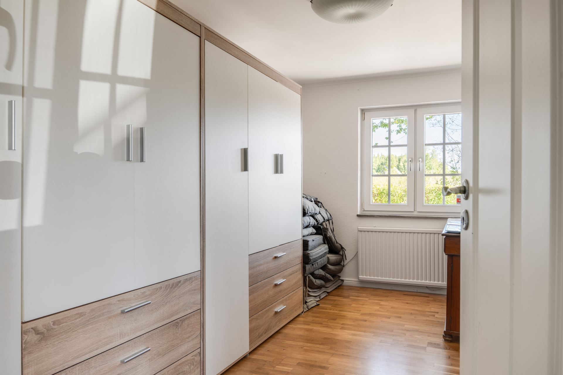 Rummet är utrustat med gott om förvaring tack vare garderobsväggen med både skåp och lådor i en modern och stilren design. Det vackra trägolvet och de ljusa väggarna ger en tidlös bas som enkelt kan anpassas efter dina behov och önskemål.