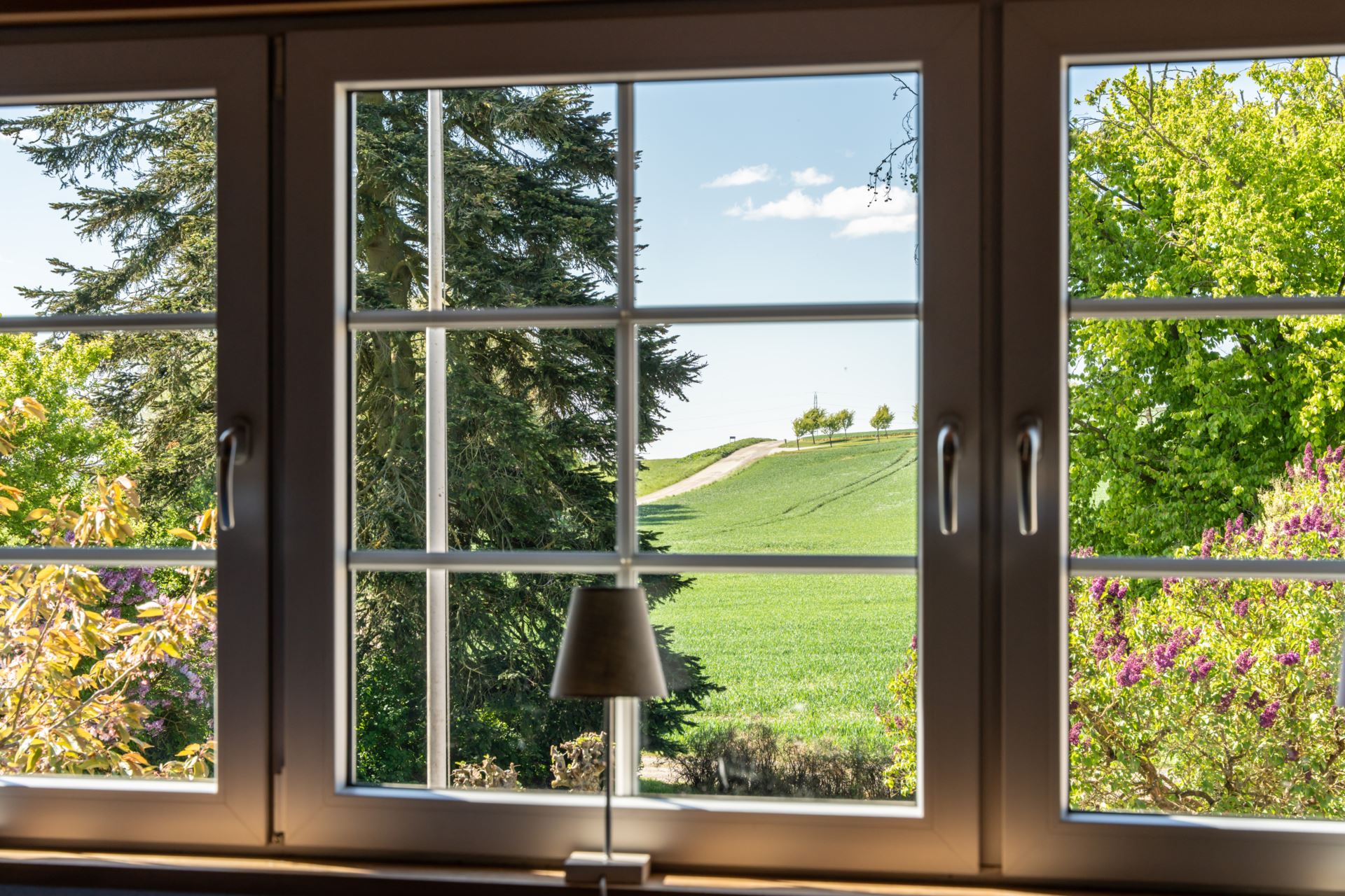 Ljust och rofyllt sovrum med härlig utsikt. Beläget en trappa upp erbjuder detta rum en stillsam atmosfär. De stora fönstren släpper in rikligt med dagsljus och bjuder på en naturnära vy över trädgården och de omgivande träden.
