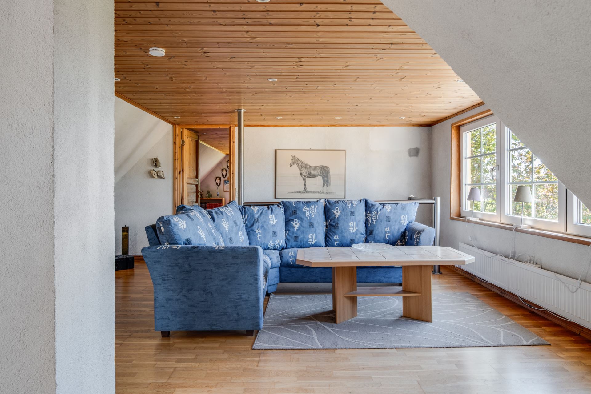 Trivsamt vardagsrum på ovanvåningen med fantastisk utsikt och plats för både umgänge och avkoppling. Här möts du av ett charmigt och luftigt utrymme där träpanel i taket skapar en varm och ombonad känsla. Det stora fönsterpartiet bjuder på en vidsträckt utsikt över det omgivande landskapet.