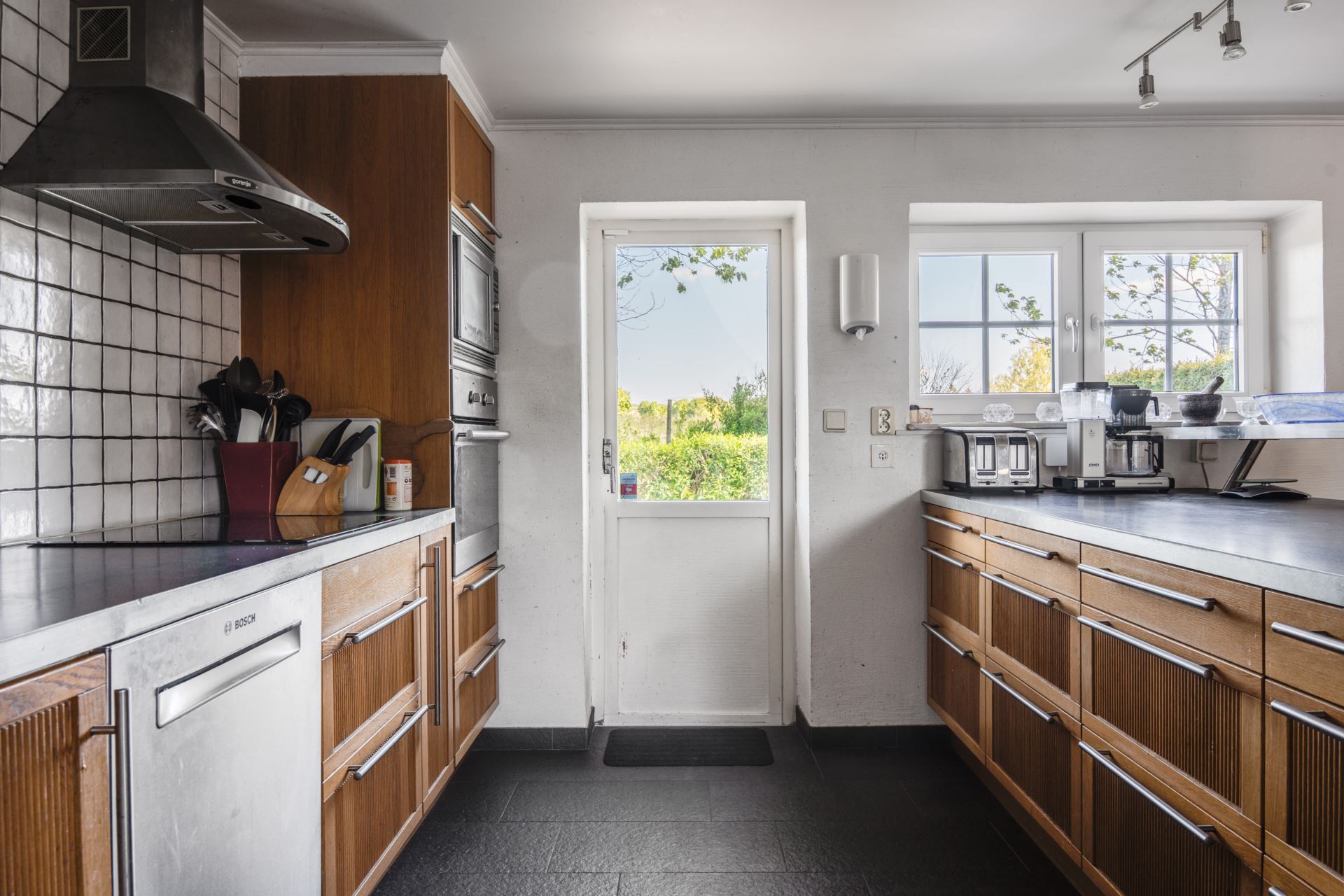Fönstren och den helglasade terrassdörren ger ett behagligt ljusflöde under dagen och fin utsikt mot den grönskande trädgården. Dörren leder dessutom direkt ut, vilket skapar en härlig koppling mellan inne och ute – perfekt för att njuta av morgonkaffet i solen eller en stilla stund på kvällen.