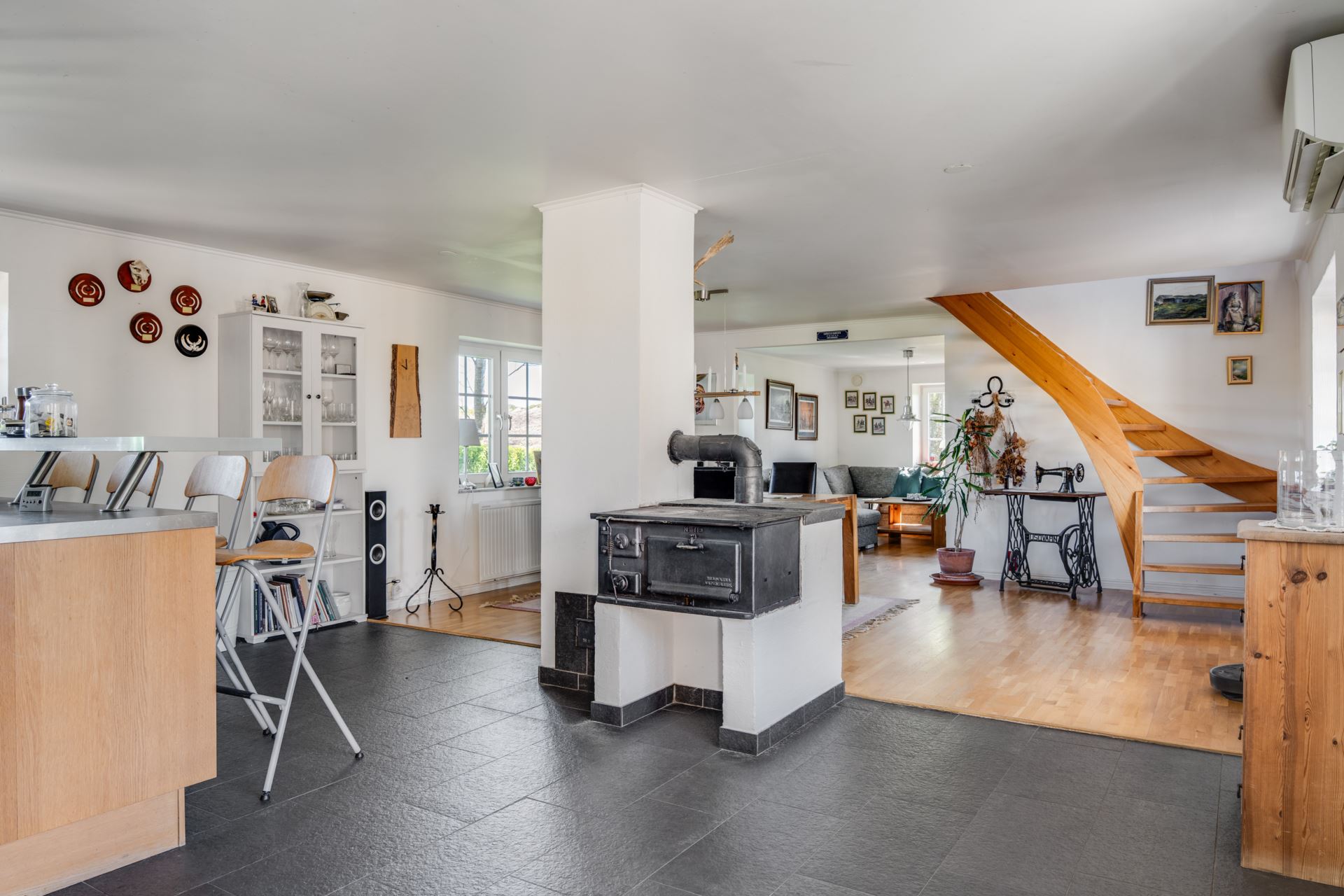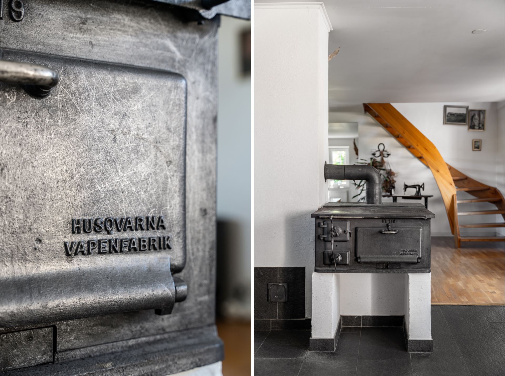 Som en extra charmig detalj pryds rummet av en vacker gammal gjutjärnsspis från Husqvarna, som inte bara blir en blickfångare utan också påminner om husets härliga karaktär.
