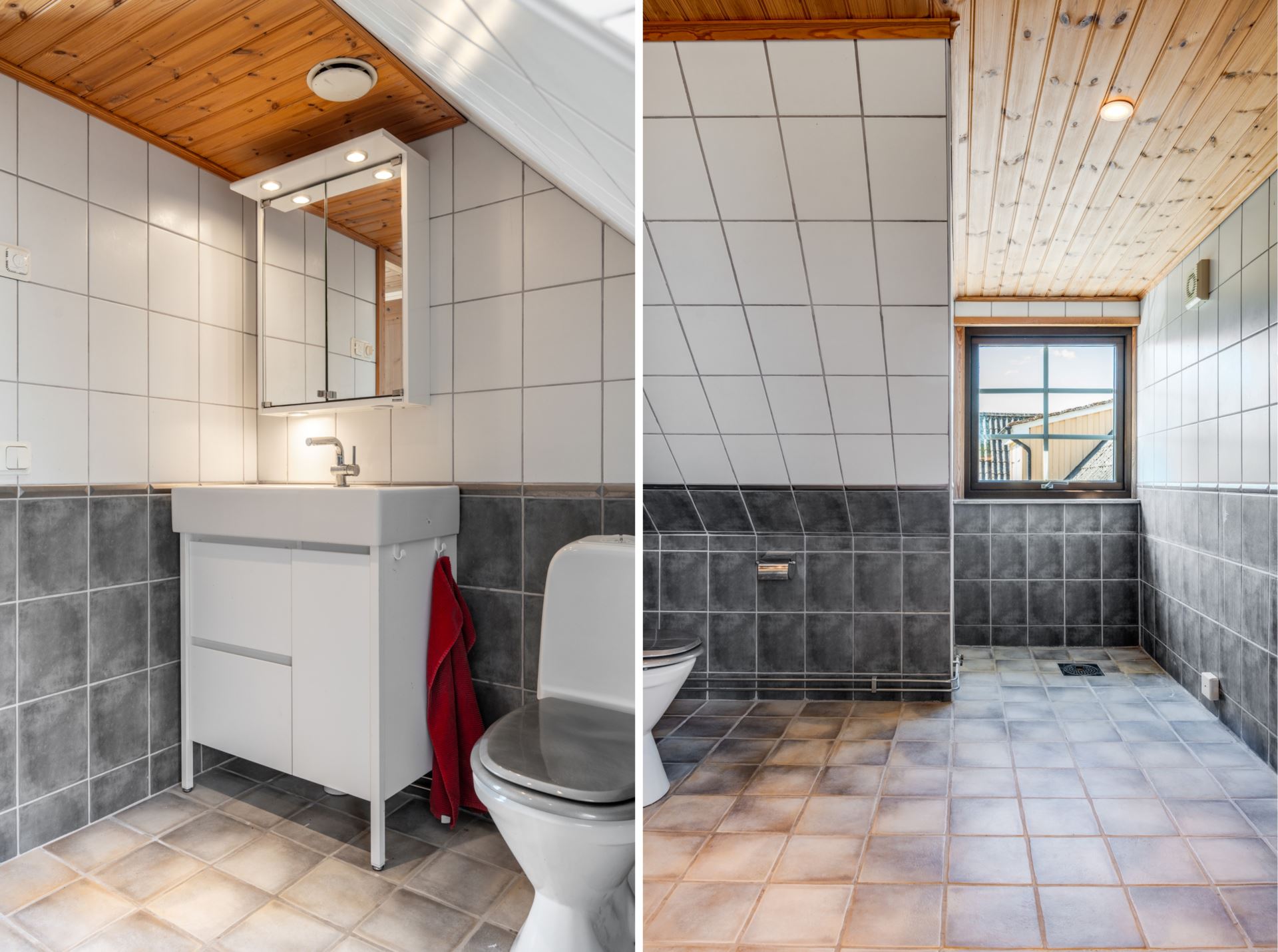 Fräscht och rymligt badrum med smakfulla materialval. Badrummet är helkaklat med en stilren kombination av ljusa väggar och mörkare klinker på golv och nedre väggparti, vilket skapar en modern men tidlös känsla. Utrustat med toalett, kommod med förvaring samt spegelskåp med belysning. Ett praktiskt och estetiskt tilltalande badrum som kompletterar ovanvåningen perfekt.