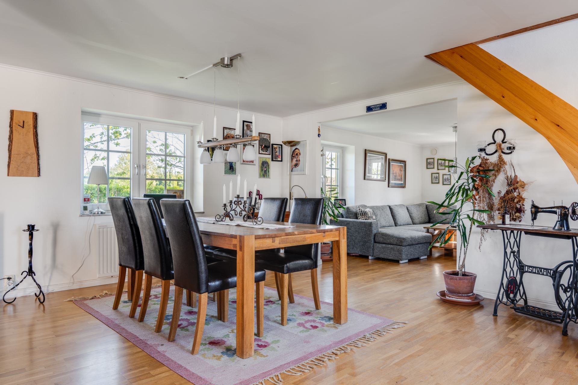 Ljus och inbjudande matplats i öppen planlösning mot vardagsrum och kök , här ryms enkelt ett rejält matbord för större sällskap. Fönstren i två väderstreck bjuder på ett härligt ljusinsläpp och fin kontakt med trädgården utanför.