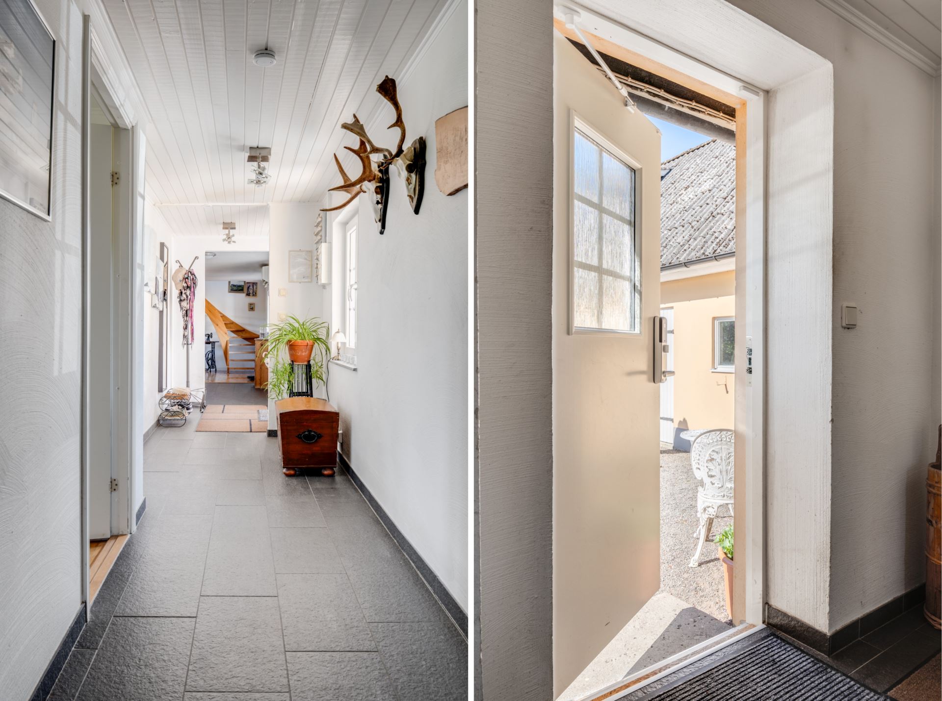 Ett fönster i dörren släpper in dagsljus och bidrar till en ljus och luftig atmosfär. Här finns också plats för byrå, skoställ eller annan förvaring som underlättar vardagen.