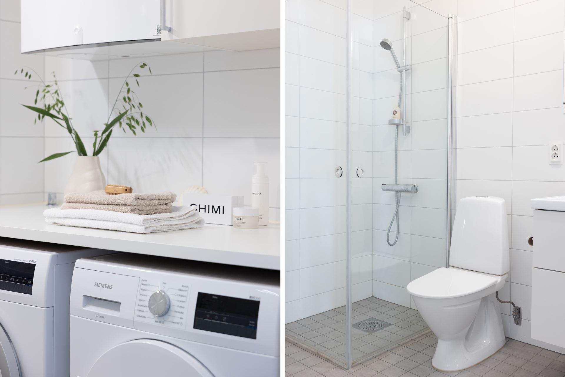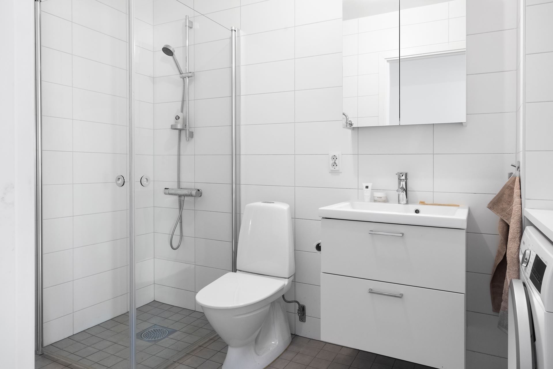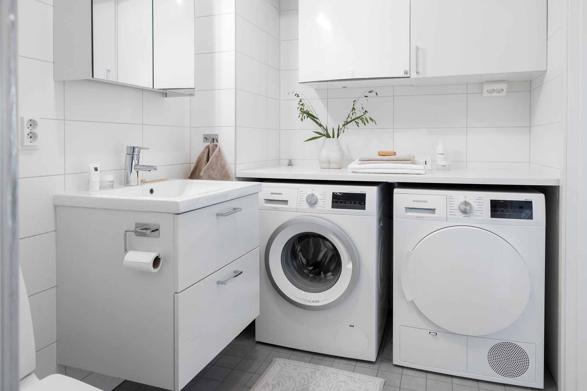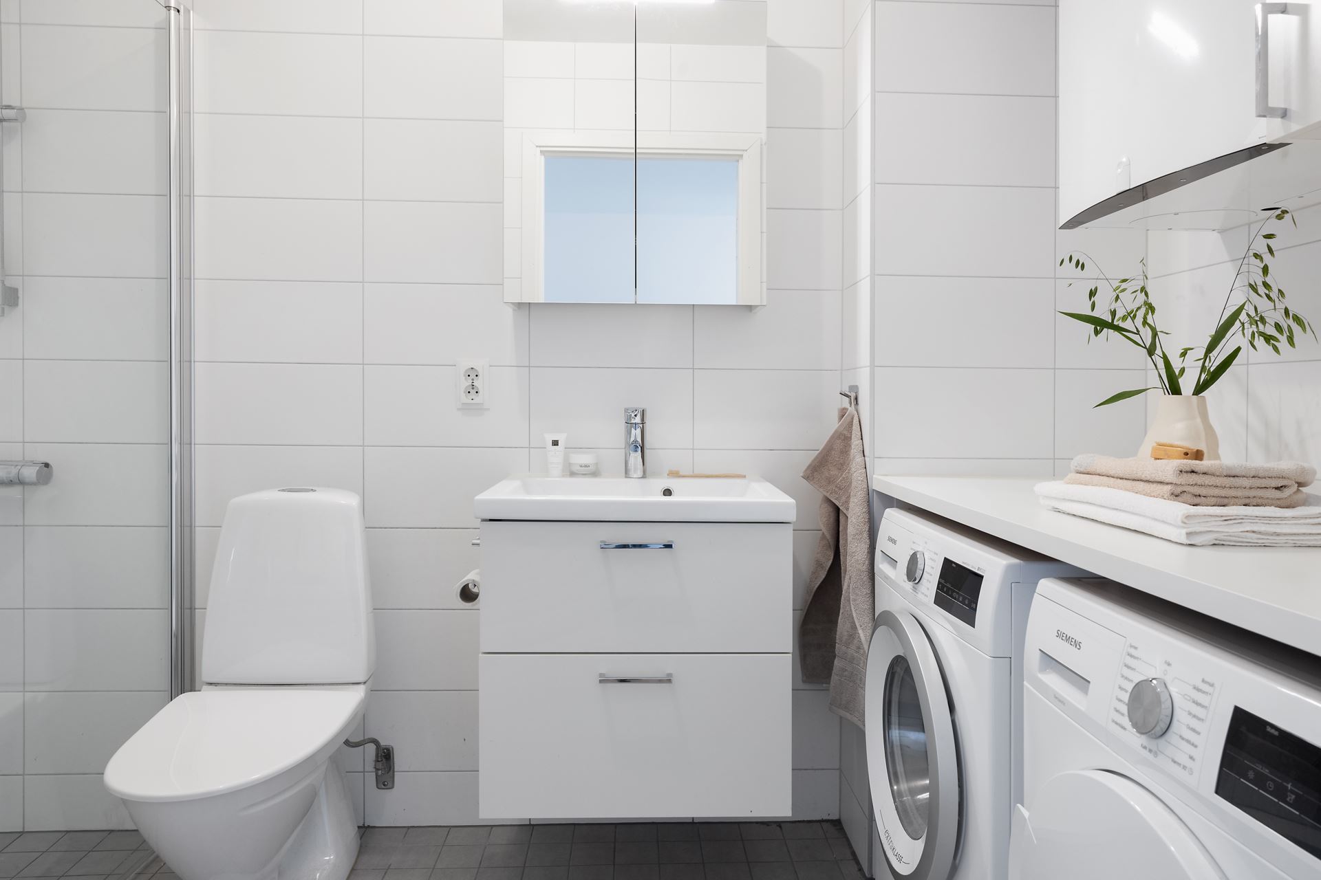 Mitt emot är bostadens stora badrum placerat. Grått klinkergolv ackompanjeras av vitkaklade väggar och inredningen består av dusch bakom vikdörrar i klarglas, wc, handfat med vit kommod samt spegelskåp. Dessutom både tvättmaskin och torktumlare med vit laminatbänk och vitt väggskåp ovanför. Inredning från Marbodal.