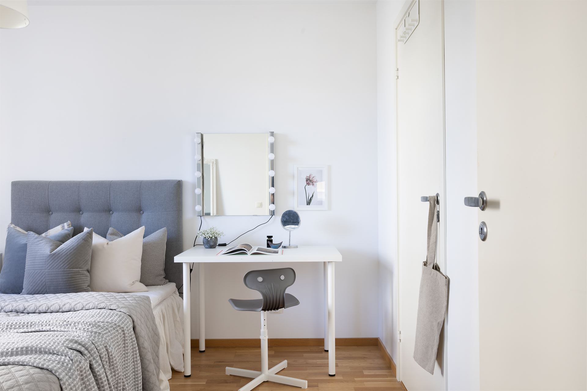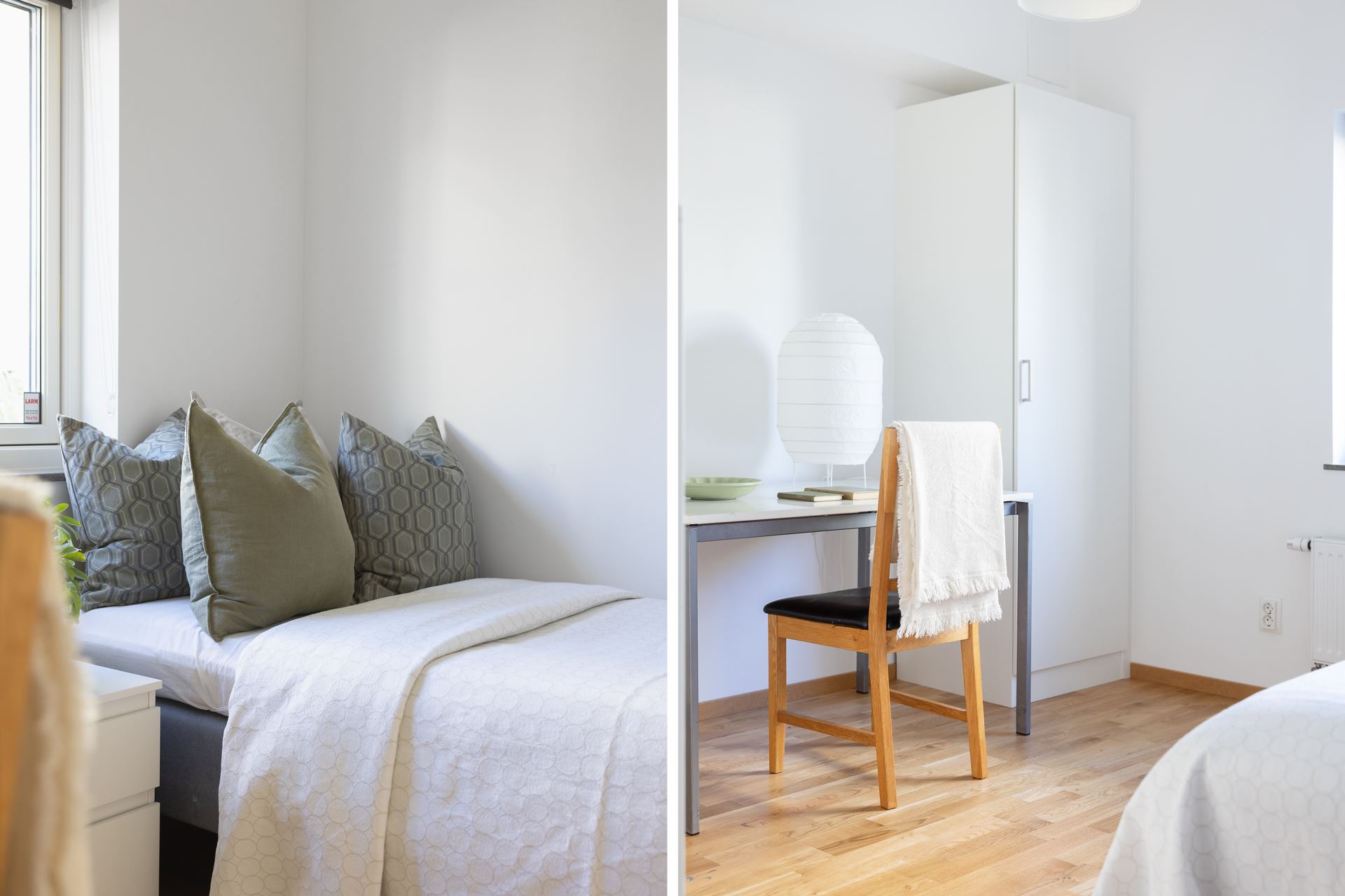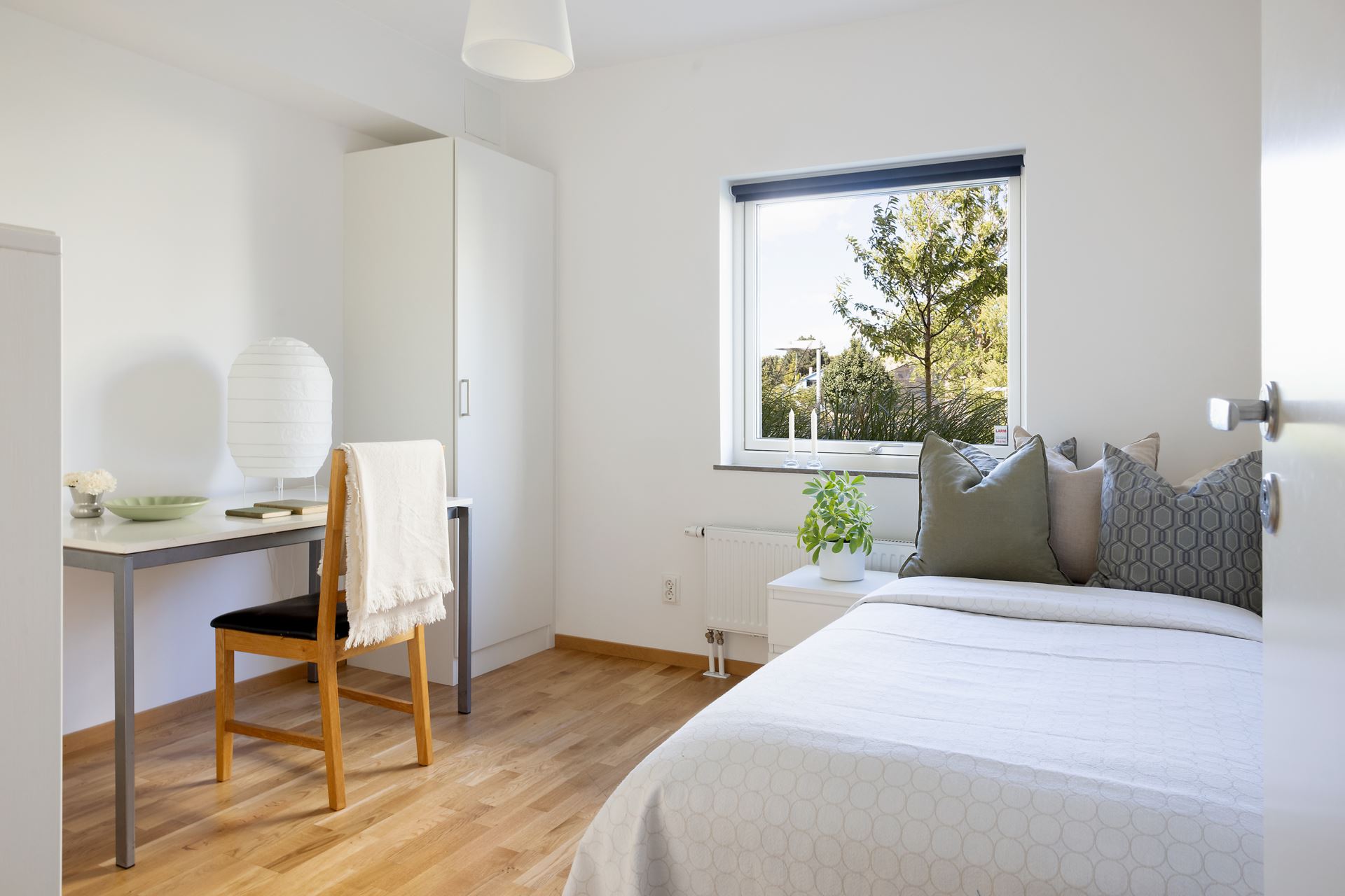 Näst på tur står det tredje sovrummet, där både säng och skrivbord enkelt får plats. Även här finns förvaring i garderob.