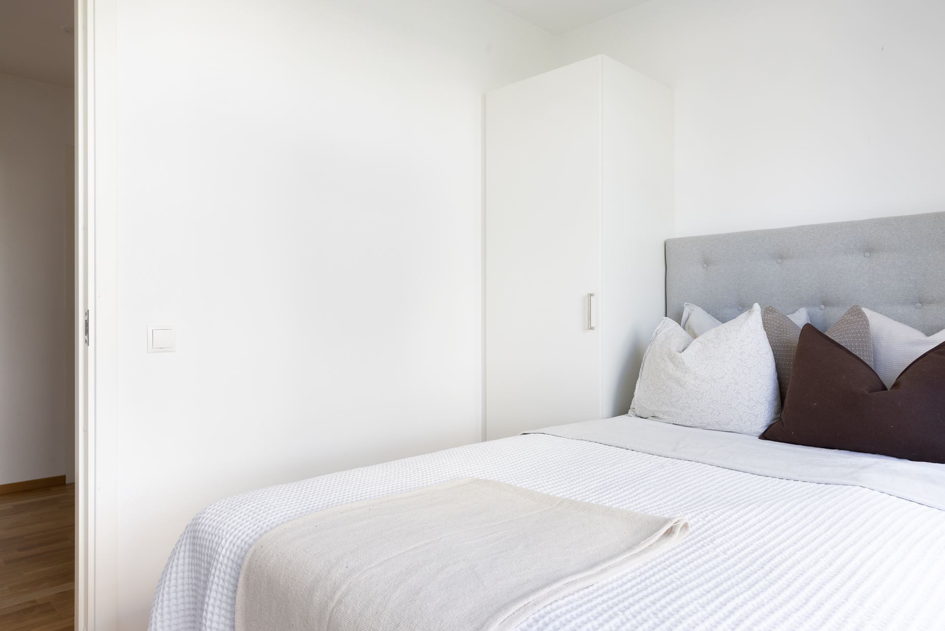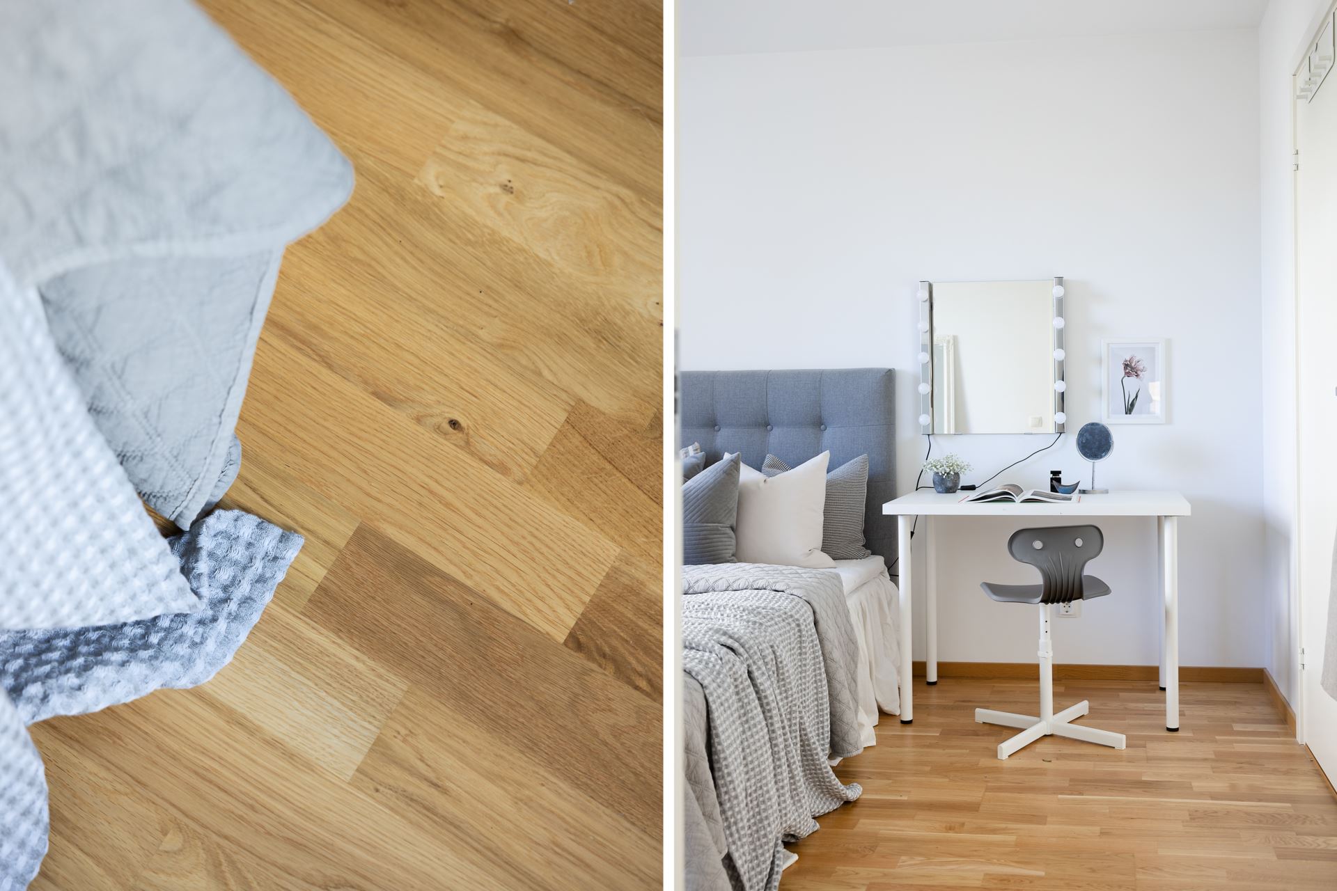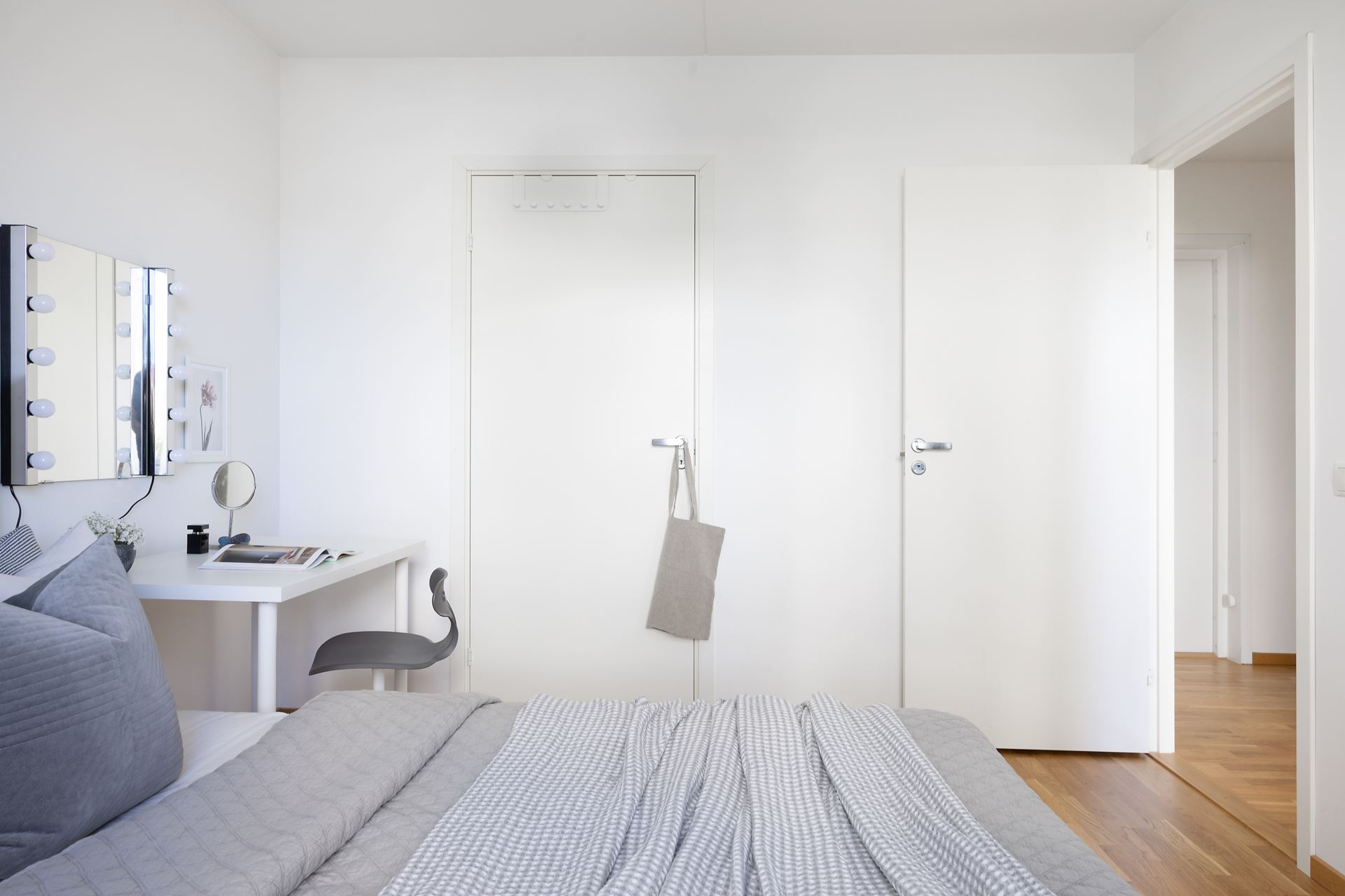 Näst på tur står det tredje sovrummet, där både säng och skrivbord enkelt får plats. Även här finns förvaring i garderob.