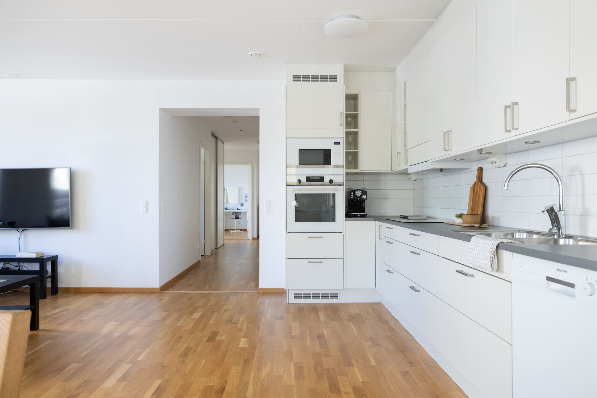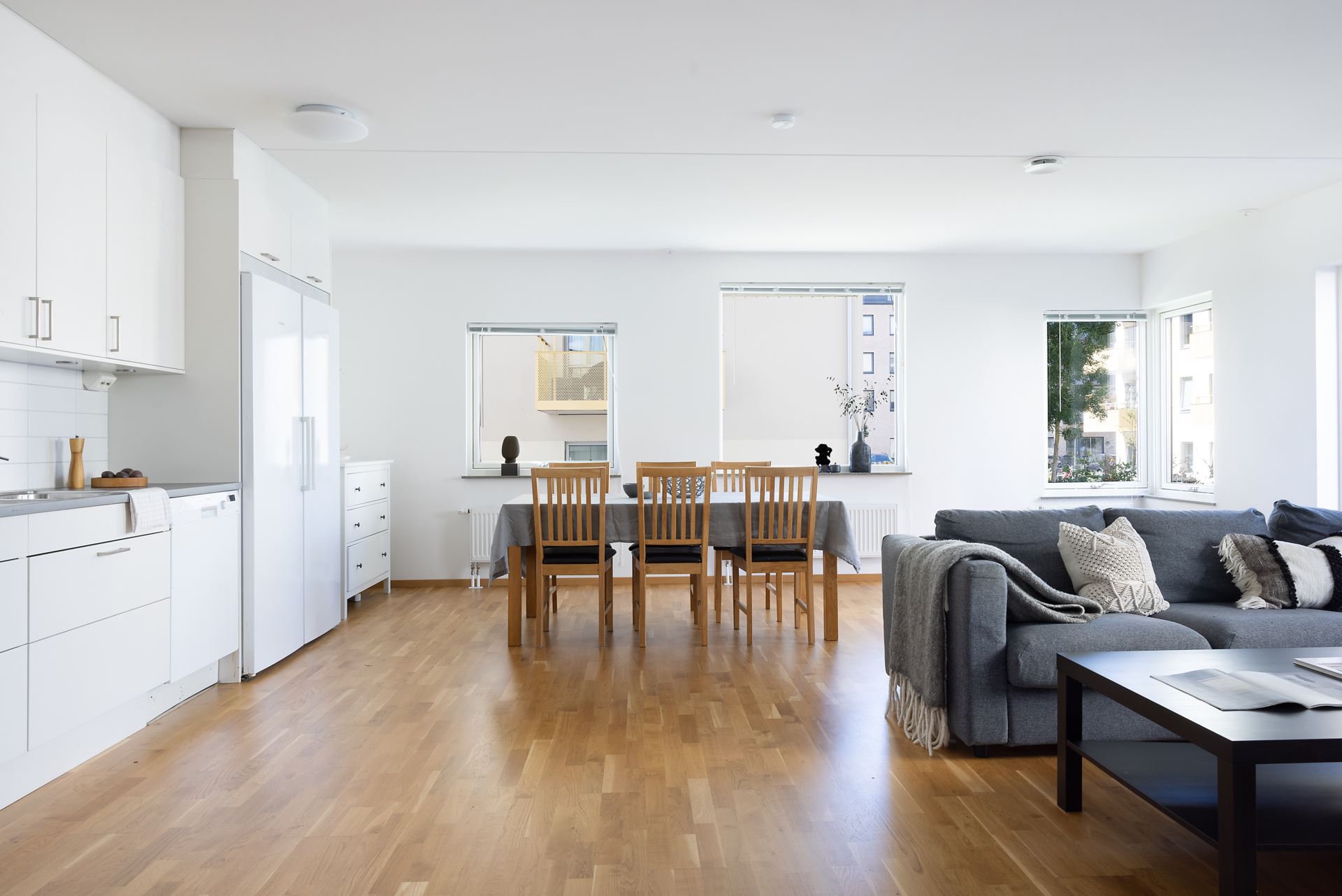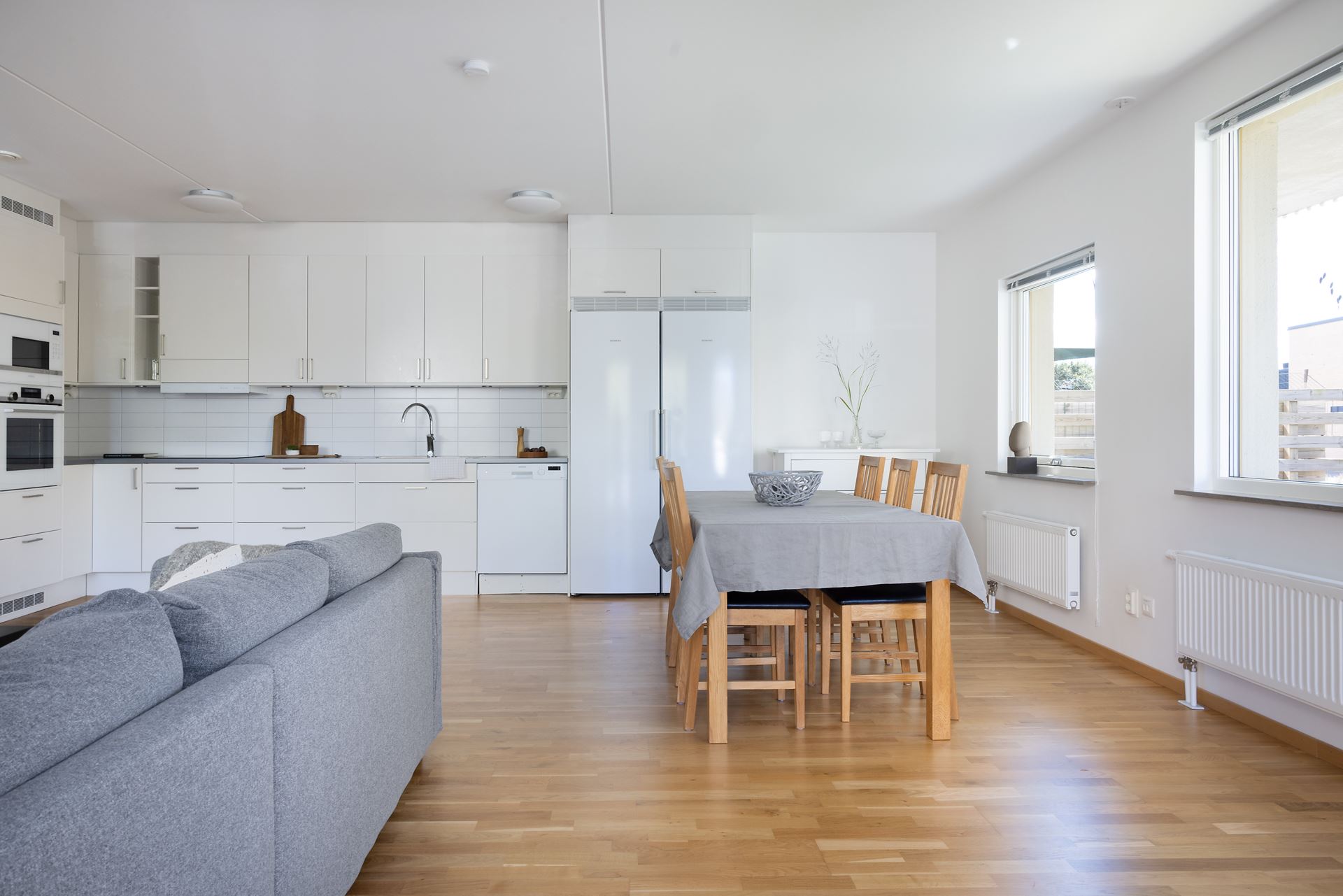 Interiören bjuder på stora, öppna sällskapsytor där kök och vardagsrum samspelar för en luftig och inbjudande känsla - idealiskt för både umgänge och familjeliv. Lägenheten erbjuder dessutom tre rymliga sovrum, ett helkaklat badrum utrustat med både tvättmaskin och torktumlare, samt en praktisk gästtoalett. Förvaringsmöjligheterna är generösa och genomtänkta för en smidig vardag.
