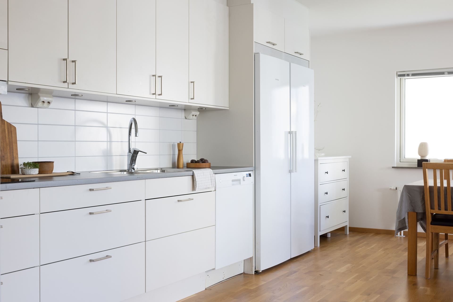 Hemmets kök är integrerat i öppen planlösning med vardagsrummet och signeras Marbodal 2019. Utmärkt förvaring erbjuds bakom släta via luckor med rostfria beslag och vitt kakel pryder väggen ovanför arbetsbänk i grå laminat, även den från Marbodal (Zeus Antracit). Vitvarorna från Siemens består av kyl och frys i fullhöjd, inbyggd diskmaskin, inbyggd mikro, induktionshäll, inbyggnadsugn samt fläkt från Swegon, kopplad till utsug.