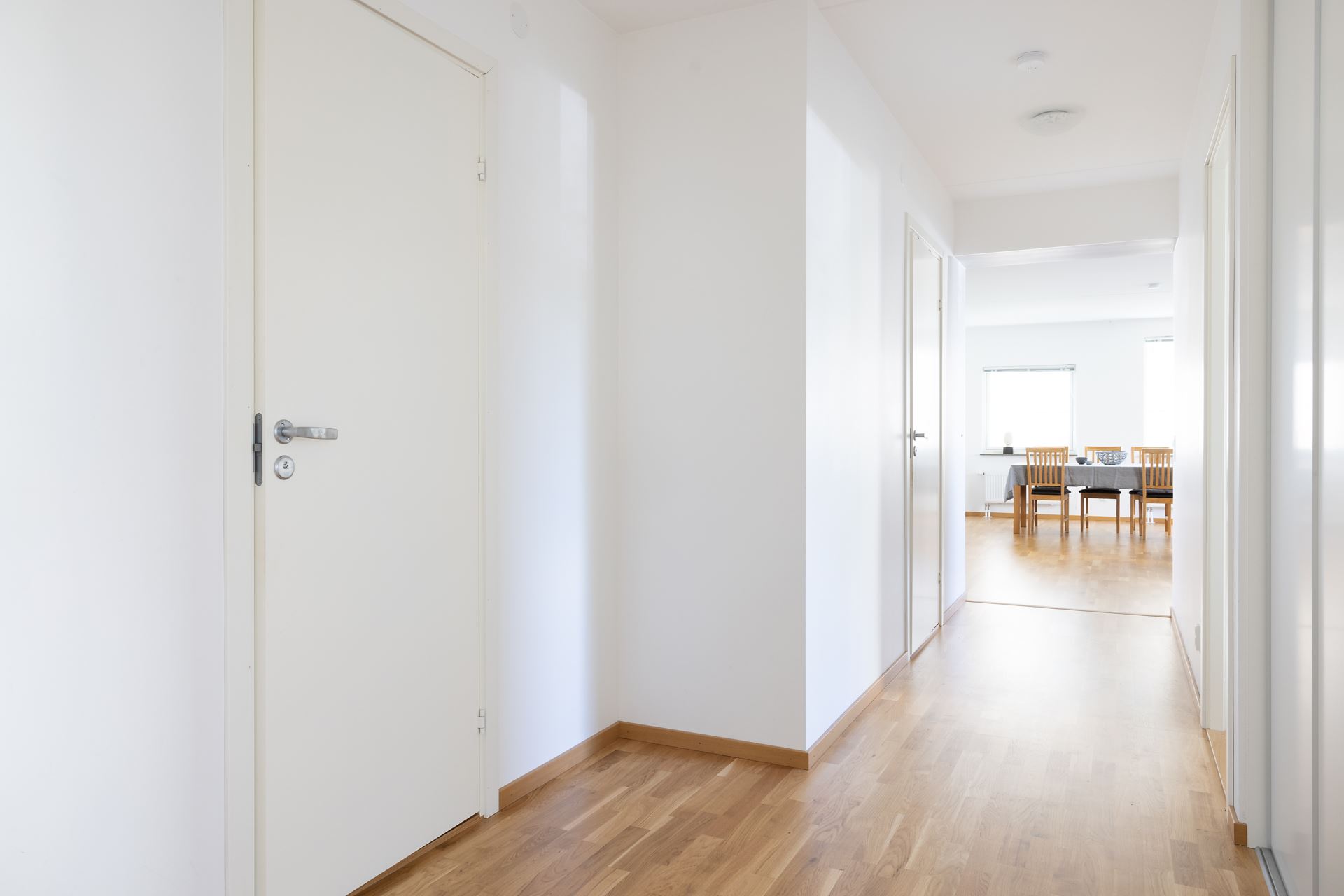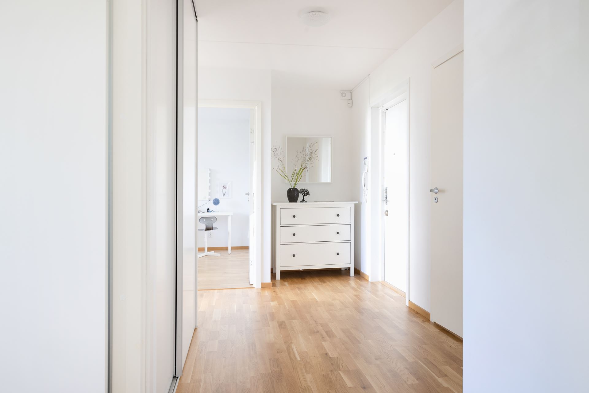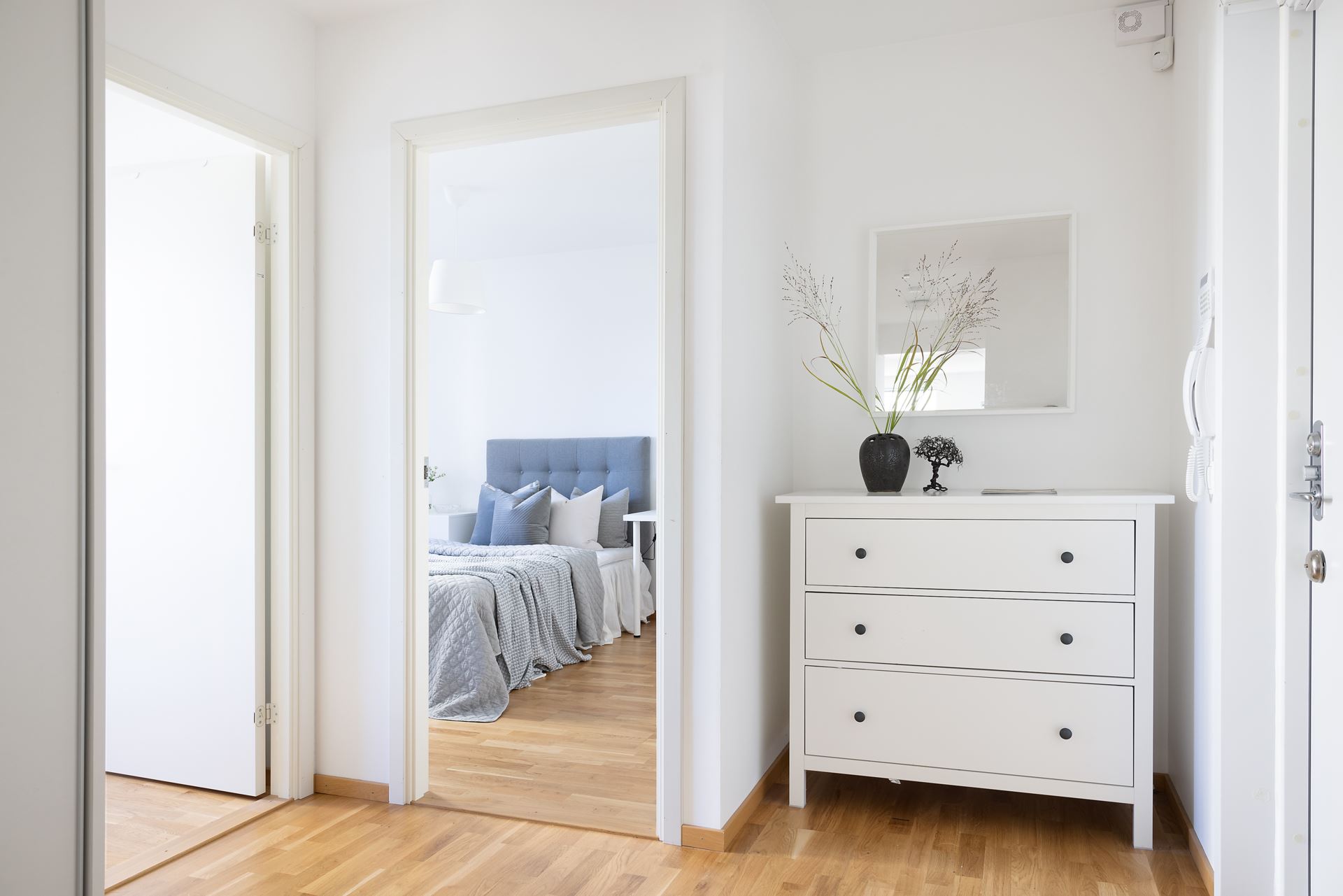 Hallen är inbjudande med en stilren kombination av Kährs trestaviga ekparkett tillsammans med klassiskt vitmålade väggar, vilket är ett genomgående tema för hela bostaden. Bakom diskreta skjutdörrar i vitt tar en rejäl garderob hand om allehanda ytterplagg och skor.