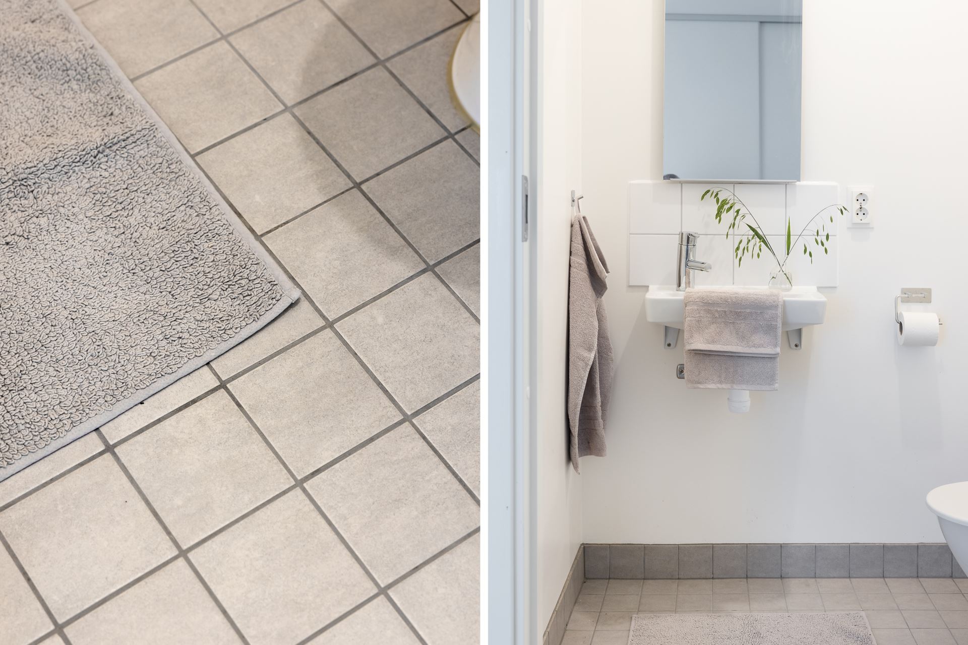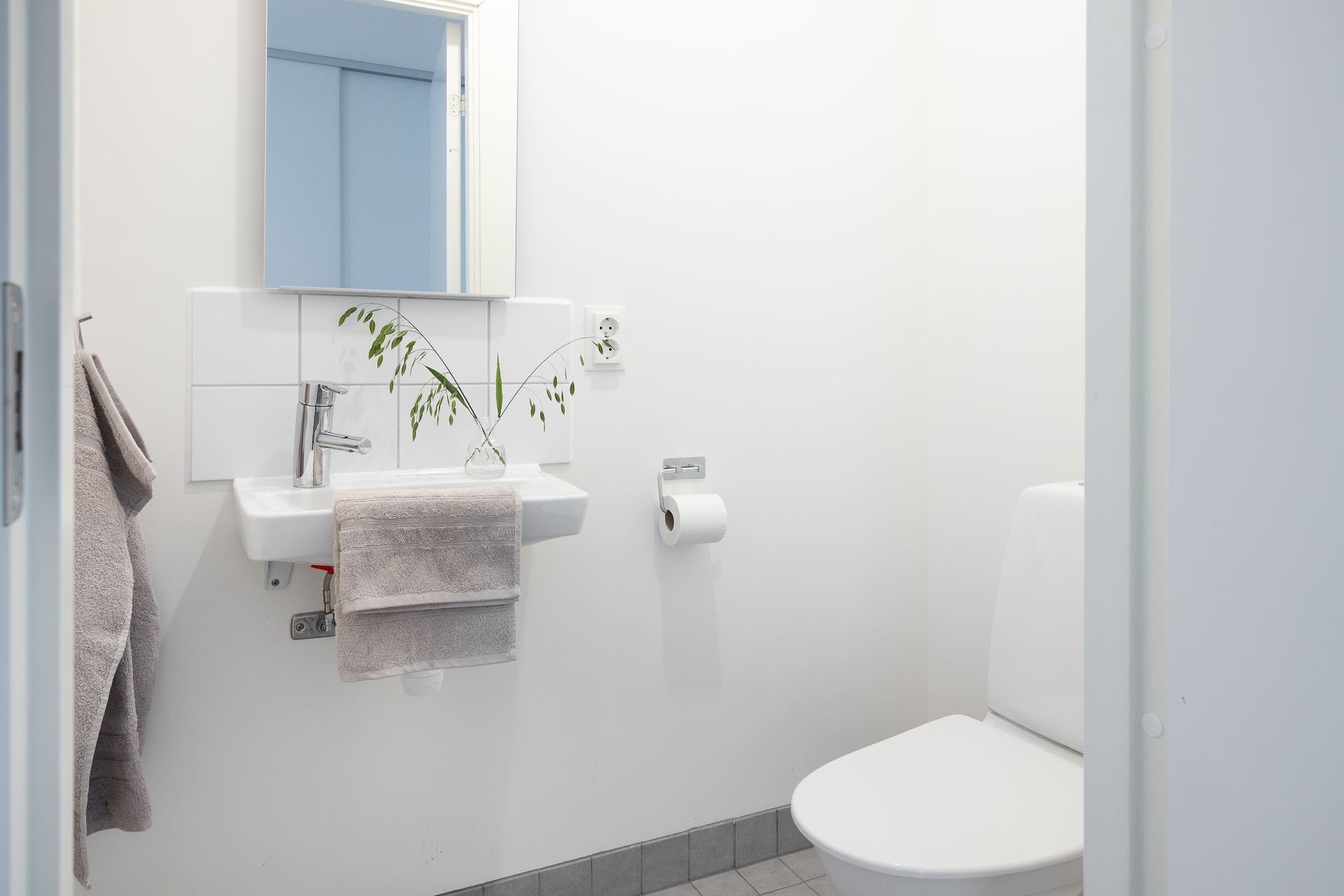 Ifrån hallen nås en praktisk gästtoalett som bjuder på grått klinkergolv och vitmålade väggar. Toaletten är utrustad med spegel, wc och ett mindre handfat.