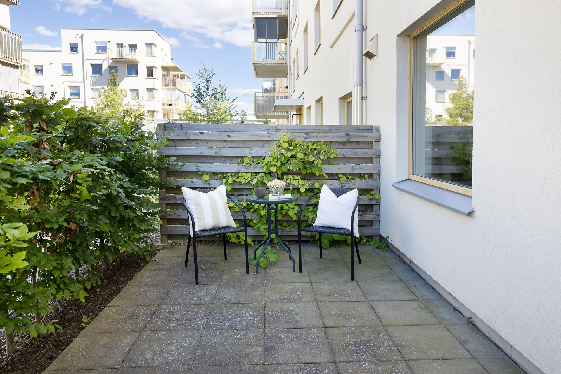 Uteplats i norrläge med sol under morgon och kväll, ca 14 kvadratmeter enligt säljaren. Upplåts med nyttjanderätt, nyttjanderättsavtal finns.