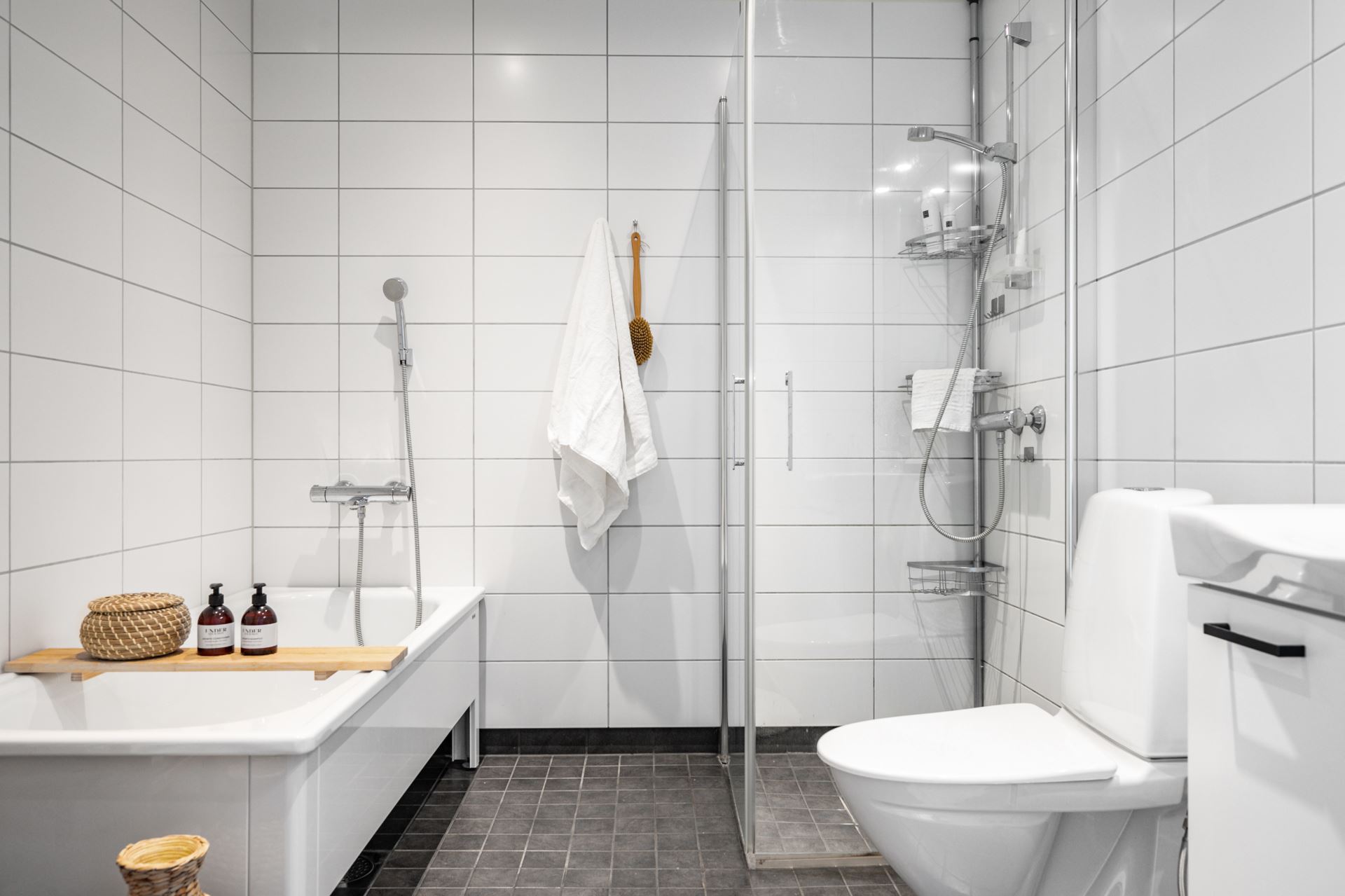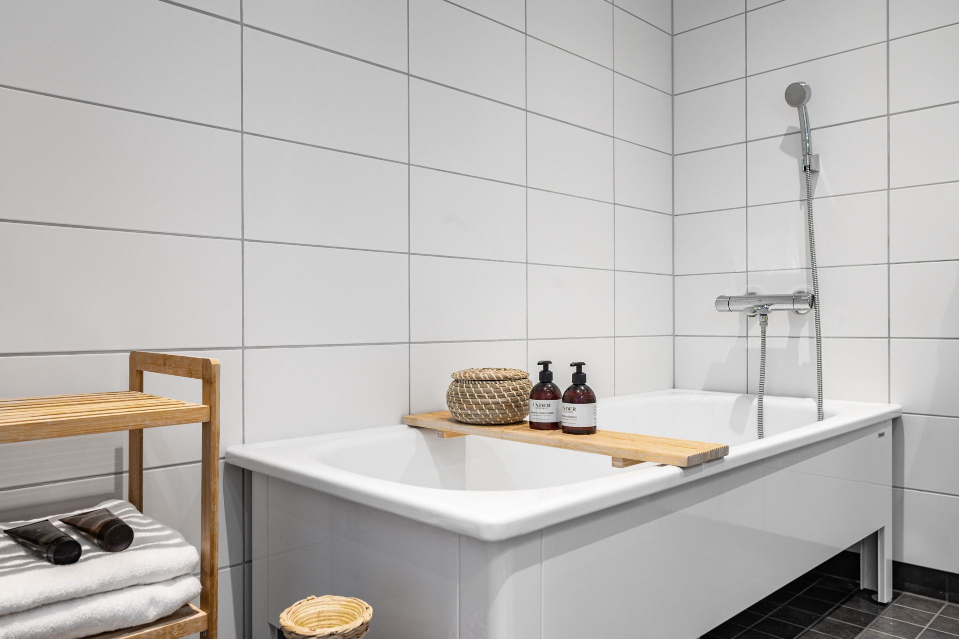 Mörkgrått klinkergolv och matta, vitkaklade väggar. Badrummet är utrustat med kommod, spegel med belysning, wc (Ifö), badkar och dusch med glasdörrar. Samtlig inredning från Vedum.