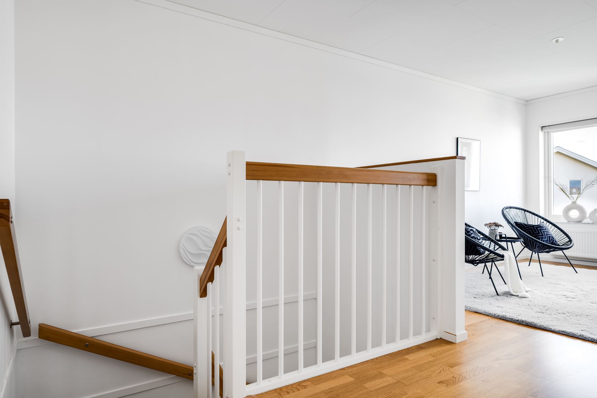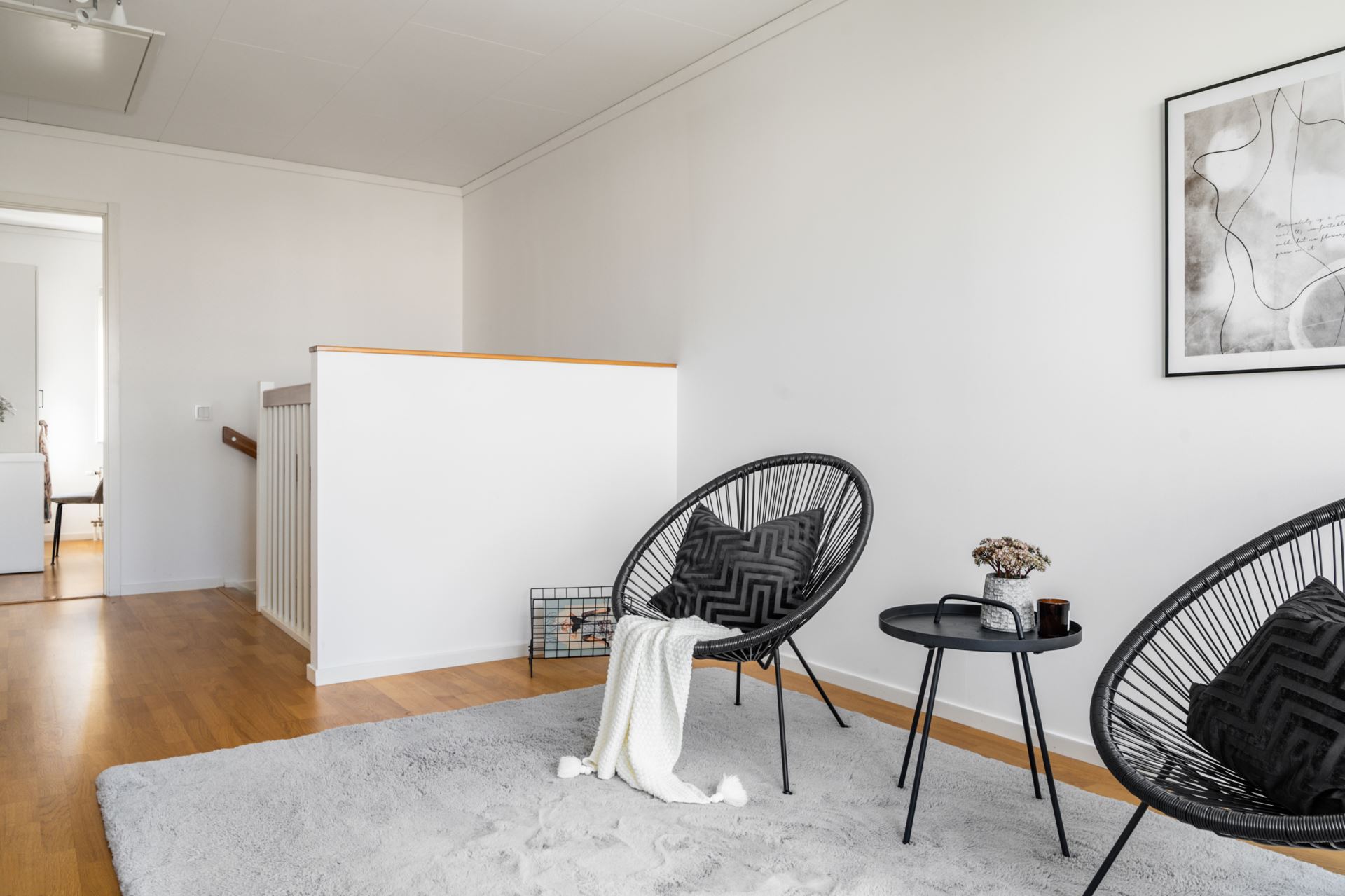 Ekparkett och vitmålade väggar vilket är genomgående för ovanvåningen. Detta allrum bidrar till ytterligare umgängesyta och lämnar sig perfekt för tv-rum eller kontor.