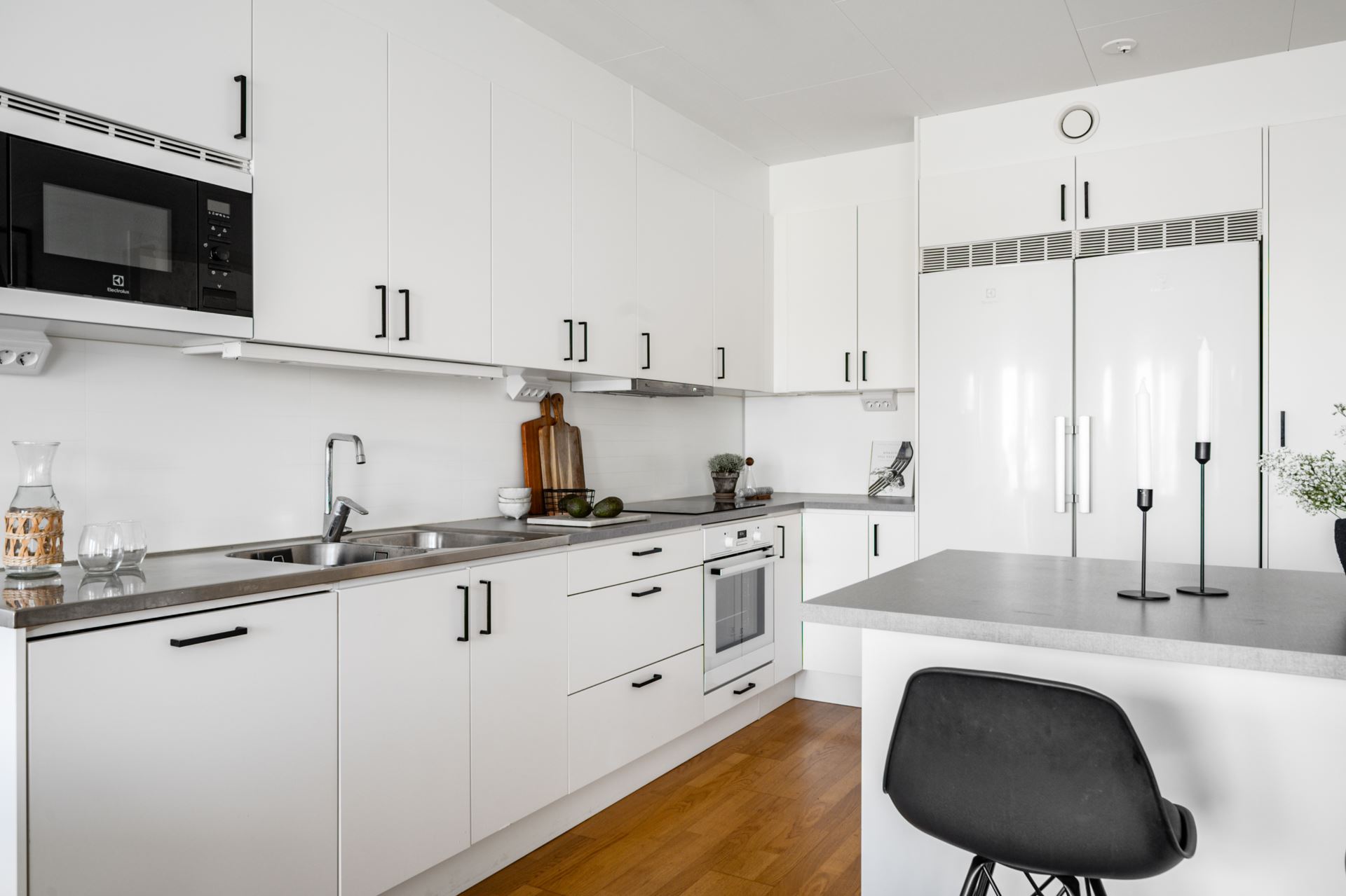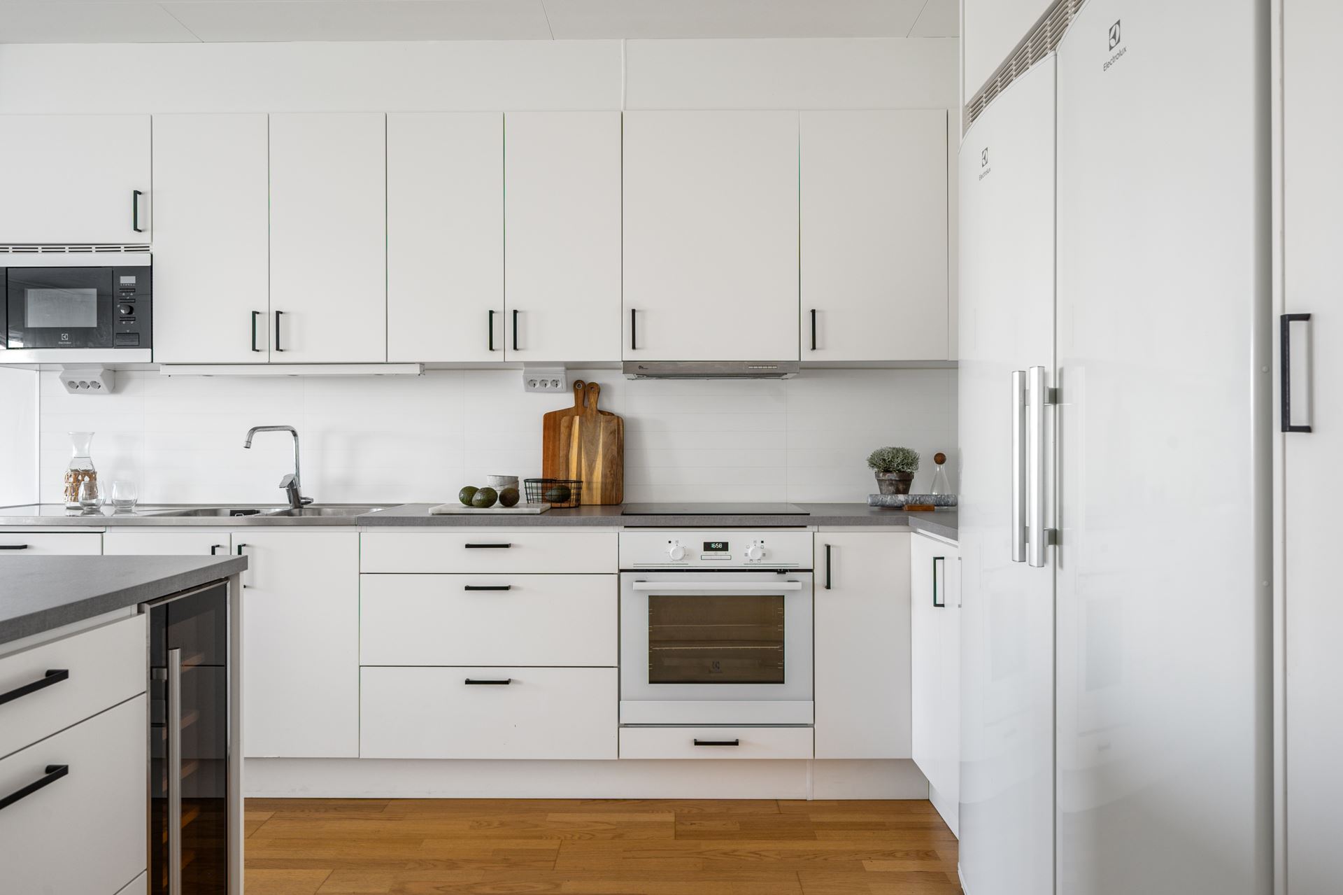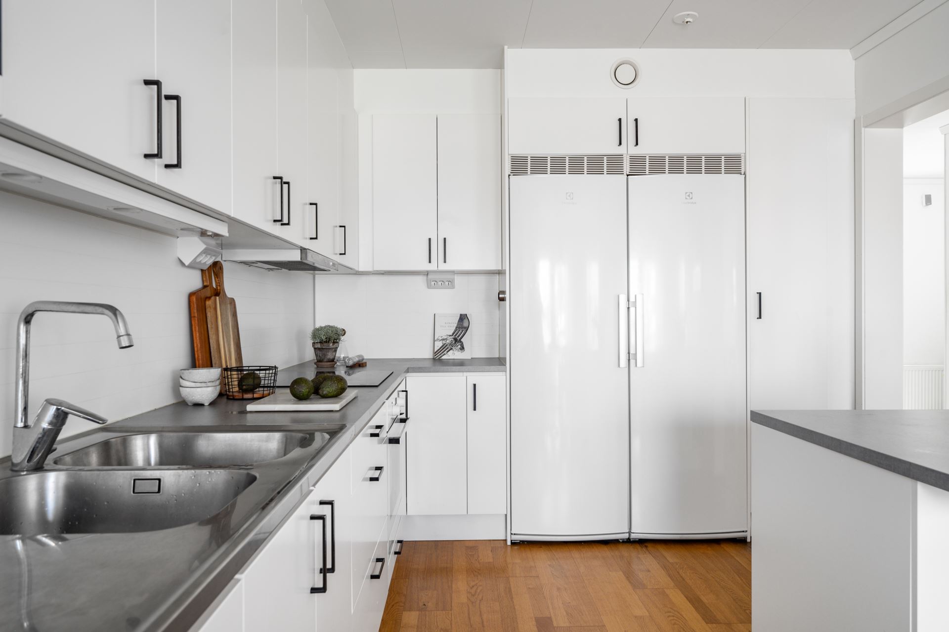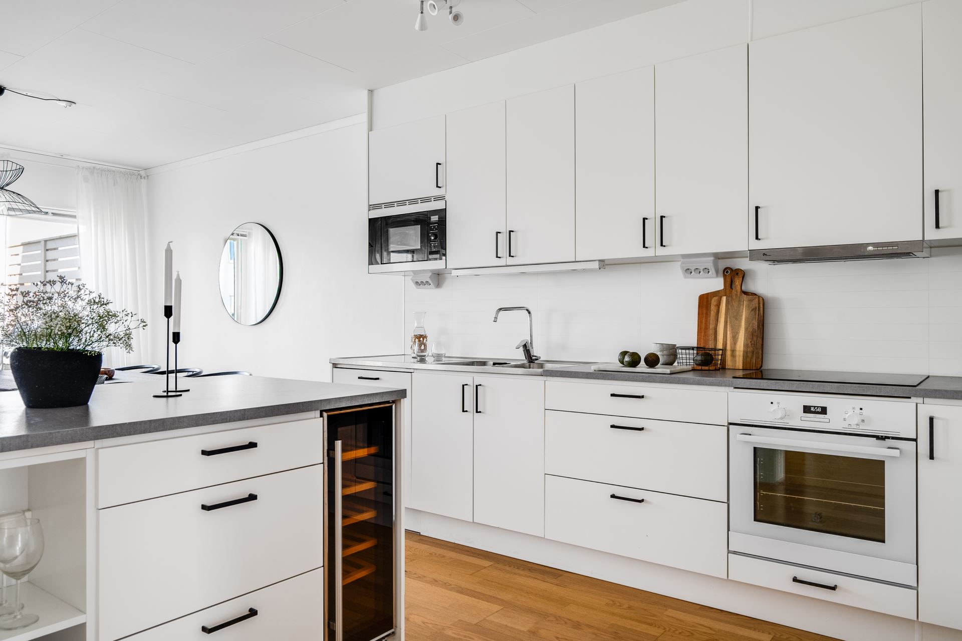Ekparkett och vitmålade väggar. Köksinredning i vitt från Vedum. Grå bänkskiva i laminat samt heltäckande diskbänk i rostfritt. Centrerat i köket finns en köksö med god arbetsyta samt inbyggd vinkyl. Köket är i övrigt utrustat med köksblandare med DM-avstängning, induktionshäll, integrerad diskmaskin, inbyggnadsugn, kyl, frys, inbyggd mikrovågsugn, utdragbar fläkt (Thermex) samt belysning under överskåp. Samtliga vitvaror, utom fläkt, är från Electrolux.
